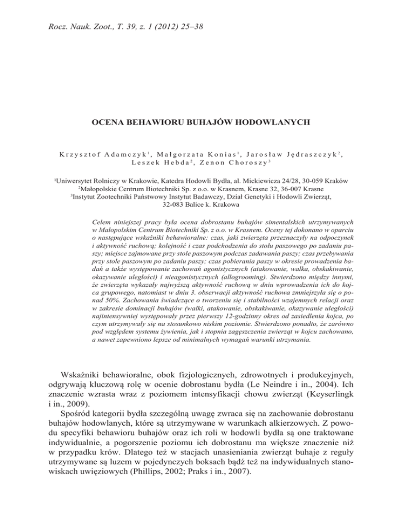 Rocz. Nauk. Zoot., T. 39, z. 1 (2012) 25–38 Ocena behawioru buhajów hodowlanych K r z y s z t o f A d a m c z y k 1, M a ł g o r z a t a K o n i a s 1, J a r o s ł a w J ę d r a s z c z y k 2, L e s z e k H e b d a 2, Z e n o n C h o r o s z y 3 Uniwersytet Rolniczy w Krakowie, Katedra Hodowli Bydła, al. Mickiewicza 24/28, 30-059 Kraków 2 Małopolskie Centrum Biotechniki Sp. z o.o. w Krasnem, Krasne 32, 36-007 Krasne 3 Instytut Zootechniki Państwowy Instytut Badawczy, Dział Genetyki i Hodowli Zwierząt, 32-083 Balice k. Krakowa 1 Celem niniejszej pracy była ocena dobrostanu buhajów simentalskich utrzymywanych w Małopolskim Centrum Biotechniki Sp. z o.o. w Krasnem. Oceny tej dokonano w oparciu o następujące wskaźniki behawioralne: czas, jaki zwierzęta przeznaczyły na odpoczynek i aktywność ruchową; kolejność i czas podchodzenia do stołu paszowego po zadaniu paszy; miejsce zajmowane przy stole paszowym podczas zadawania paszy; czas przebywania przy stole paszowym po zadaniu paszy; czas pobierania paszy w okresie prowadzenia badań a także występowanie zachowań agonistycznych (atakowanie, walka, obskakiwanie, okazywanie uległości) i nieagonistycznych (allogrooming). Stwierdzono między innymi, że zwierzęta wykazały najwyższą aktywność ruchową w dniu wprowadzenia ich do kojca grupowego, natomiast w dniu 3. obserwacji aktywność ruchowa zmniejszyła się o ponad 50%. Zachowania świadczące o tworzeniu się i stabilności wzajemnych relacji oraz w zakresie dominacji buhajów (walki, atakowanie, obskakiwanie, okazywanie uległości) najintensywniej występowały przez pierwszy 12-godzinny okres od zasiedlenia kojca, po czym utrzymywały się na stosunkowo niskim poziomie. Stwierdzono ponadto, że zarówno pod względem systemu żywienia, jak i stopnia zagęszczenia zwierząt w kojcu zachowano, a nawet zapewniono lepsze od minimalnych wymagań warunki utrzymania. Wskaźniki behawioralne, obok fizjologicznych, zdrowotnych i produkcyjnych, odgrywają kluczową rolę w ocenie dobrostanu bydła (Le Neindre i in., 2004). Ich znaczenie wzrasta wraz z poziomem intensyfikacji chowu zwierząt (Keyserlingk i in., 2009). Spośród kategorii bydła szczególną uwagę zwraca się na zachowanie dobrostanu buhajów hodowlanych, które są utrzymywane w warunkach alkierzowych. Z powodu specyfiki behawioru buhajów oraz ich roli w hodowli bydła są one traktowane indywidualnie, a pogorszenie poziomu ich dobrostanu ma większe znaczenie niż w przypadku krów. Dlatego też w stacjach unasieniania zwierząt buhaje z reguły utrzymywane są luzem w pojedynczych boksach bądź też na indywidualnych stanowiskach uwięziowych (Phillips, 2002; Praks i in., 2007). 26 K. Adamczyk i in. O ile w hodowli bydła buhaje odgrywają kluczową rolę, to badania nad ich behawiorem i oceną dobrostanu należą do rzadkości, a badacze skupiają swą uwagę głównie na cielętach, krowach mlecznych oraz zwierzętach rzeźnych (Haley i in., 2000; Watts, 2002; Czaja-Bogner i Kaczor, 2004; Keyserlingk i in., 2009; Kondo, 2011). Wobec tego, na znaczeniu zyskują badania dotyczące oceny dobrostanu buhajów hodowlanych. W Małopolskim Centrum Biotechniki Sp. z o.o. w Krasnem, od roku 2009 buhaje oczekujące na wycenę utrzymywane są w systemie grupowym, co pomaga w ich utrzymaniu i organizacji pracy. Celem niniejszych badań była ocena dobrostanu buhajów utrzymywanych grupowo ze szczególnym uwzględnieniem przebiegu tworzenia się relacji społecznych między zwierzętami. Materiał i metody Badania przeprowadzono w Małopolskim Centrum Biotechniki Sp. z o.o. w Krasnem. Objęto nimi 5 buhajów rasy simentalskiej w wieku 21–26 miesięcy i masie ciała 670–783 kg (tab. 1) utrzymywanych w kojcu grupowym z dostępem do okólnika (rys. 1). Usuwanie obornika i ścielenie słomą odbywało się 2 razy w tygodniu. W kojcu znajdowało się 7 stanowisk przy stole paszowym (szerokość stanowiska: 65 cm). Buhaje były bezrożne. Obserwacje przeprowadzono w dwóch etapach: w etapie pierwszym bezpośrednio po zasiedleniu kojca od godziny 12:00 dnia pierwszego do godziny 15.00 dnia trzeciego (dzień 1., dzień 2., dzień 3., noc 1., noc 2.), a po 3 miesiącach, w etapie drugim powtórzono obserwacje (dzień 4., dzień 5., dzień 6., noc 3., noc 4.). W okresie obserwacji jedyną czynnością wymagającą ingerencji człowieka wobec buhajów było zadawanie im paszy. W okresie poprzedzającym badania buhaje utrzymywano w boksach indywidualnych i nie miały one ze sobą kontaktu fizycznego. W skład dziennej dawki pokarmowej wchodziły następujące pasze: sianokiszonka (12 kg), siano łąkowe (7 kg), mieszanka treściwa pełnoporcjowa Bovimix dla buhajów (3 kg), mieszanka mineralno-witaminowa Biotan 3Z (0,06 kg). Zadawanie paszy odbywało się w 2 odpasach – rannym (pasza treściwa i mineralno-witaminowa) oraz popołudniowym (pasza objętościowa), odpowiednio o godzinie 6:30 i 15:00. Behawior zwierząt rejestrowano przy pomocy kamery przemysłowej Color Waterproof IR C3138/3.5-8 i rejestratora cyfrowego DVR0404LN-S cube. Analizie podlegały 20-minutowe czasokresy rejestrowane co 20 minut. Za czas nocny uznawano okres, w którym kamera pracowała w trybie podczerwieni. W tym czasie w oborze było włączone oświetlenie nocne, które stanowiła jedna lampa jarzeniowa usytuowana nad korytarzem paszowym przy kojcu. Ocenie poddano następujące wskaźniki behawioru buhajów: – czas, jaki zwierzęta przeznaczyły na odpoczynek i aktywność ruchową, – kolejność i czas podchodzenia do stołu paszowego po zadaniu paszy, – miejsce zajęte przy stole paszowym podczas zadawania paszy, – czas przebywania przy stole paszowym w ciągu 20 minut po zadaniu paszy, – czas pobierania paszy w okresie prowadzenia badań, – zachowania agonistyczne i nieagonistyczne (obserwowane podczas 1. etapu badań), 27 Ocena behawioru buhajów hodowlanych – atakowanie (atakowanie głową drugiego osobnika, który n