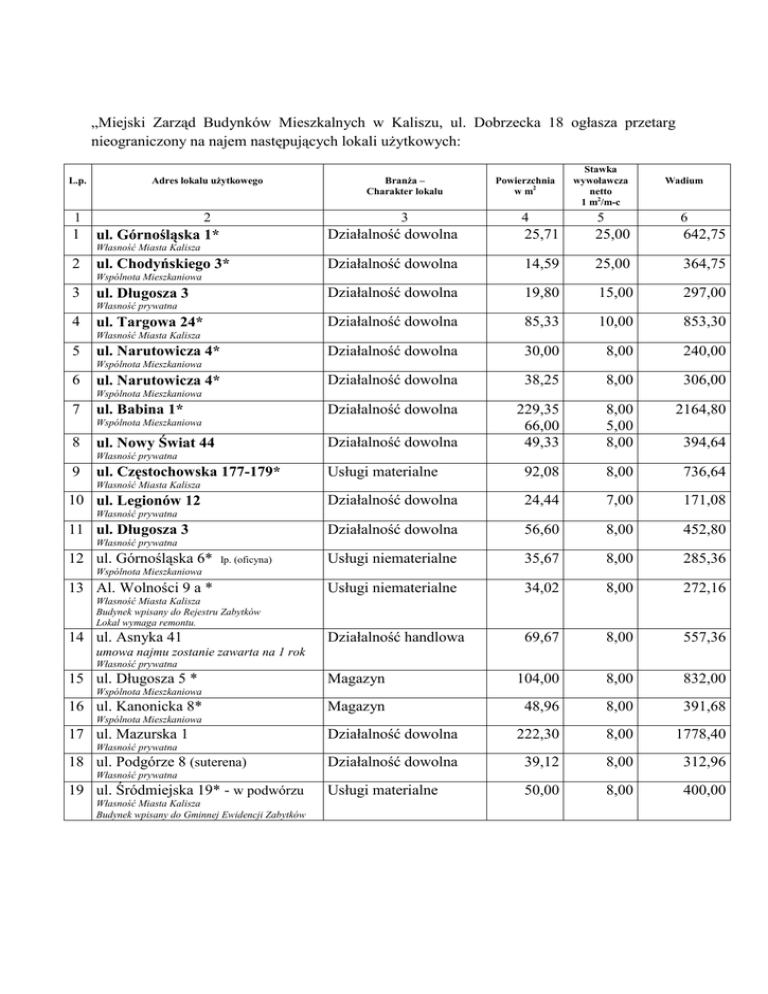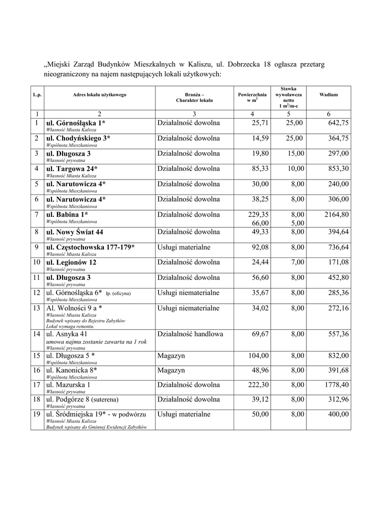 „Miejski Zarząd Budynków Mieszkalnych w Kaliszu, ul. Dobrzecka 18 ogłasza przetarg nieograniczony na najem następujących lokali użytkowych: L.p. Adres lokalu użytkowego Branża – Charakter lokalu Powierzchnia w m2 Stawka wywoławcza netto 1 m2/m-c 1 2 3 4 5 6 Działalność dowolna 25,71 25,00 642,75 Działalność dowolna 14,59 25,00 364,75 Działalność dowolna 19,80 15,00 297,00 Działalność dowolna 85,33 10,00 853,30 Działalność dowolna 30,00 8,00 240,00 Działalność dowolna 38,25 8,00 306,00 Działalność dowolna 229,35 66,00 49,33 8,00 5,00 8,00 2164,80 Usługi materialne 92,08 8,00 736,64 Działalność dowolna 24,44 7,00 171,08 Działalność dowolna 56,60 8,00 452,80 Usługi niematerialne 35,67 8,00 285,36 Usługi niematerialne 34,02 8,00 272,16 Działalność handlowa 69,67 8,00 557,36 Magazyn 104,00 8,00 832,00 Magazyn 48,96 8,00 391,68 Działalność dowolna 222,30 8,00 1778,40 Działalność dowolna 39,12 8,00 312,96 Usługi materialne 50,00 8,00 400,00 1 ul. Górnośląska 1* Wadium Własność Miasta Kalisza 2 ul. Chodyńskiego 3* Wspólnota Mieszkaniowa 3 ul. Długosza 3 Własność prywatna 4 ul. Targowa 24* Własność Miasta Kalisza 5 ul. Narutowicza 4* Wspólnota Mieszkaniowa 6 ul. Narutowicza 4* Wspólnota Mieszkaniowa 7 ul. Babina 1* Wspólnota Mieszkaniowa 8 Działalność dowolna ul. Nowy Świat 44 394,64 Własność prywatna 9 ul. Częstochowska 177-179* Własność Miasta Kalisza 10 ul. Legionów 12 Własność prywatna 11 ul. Długosza 3 Własność prywatna 12 ul. Górnośląska 6* Ip. (oficyna) Wspólnota Mieszkaniowa 13 Al. Wolności 9 a * Własność Miasta Kalisza Budynek wpisany do Rejestru Zabytków Lokal wymaga remontu. 14 ul. Asnyka 41 umowa najmu zostanie zawarta na 1 rok Własność prywatna 15 ul. Długosza 5 * Wspólnota Mieszkaniowa 16 ul. Kanonicka 8* Wspólnota Mieszkaniowa 17 ul. Mazurska 1 Własność prywatna 18 ul. Podgórze 8 (suterena) Własność prywatna 19 ul. Śródmiejska 19* - w podwórzu Własność Miasta Kalisza Budynek wpisany do Gminnej Ewidencji Zabytków Uwaga: Przed wpłaceniem wadium należy założyć kartę kontrahenta w Biurze Obsługi Interesanta (dot. nowych kontrahentów). Umowy najmu zostaną zawarte na czas nieokreślony, z zastrzeżeniem poz. 14. Dopuszcza się wynajem lokalu na dowolną działalność gospodarczą – oprócz działalności produkcyjno-wytwórczej oraz działalności zabronionych prawem, pod warunkiem, iż własnym staraniem i na własne ryzyko najemca uzyska konieczne zezwolenia do prowadzenia wskazanej działalności, jak również działalność ta nie spowoduje naruszenia zasad regulaminu porządku domowego lub zakłócenia spokoju. dot. poz. 12, 13 i 19 – lokal wymaga odnowienia – dopuszcza się możliwość zwolnienia z czynszu zgodnie z Zarządzeniem Nr 401/2010 PMK. * Przedsiębiorca, który został najemcą lokalu użytkowego w wyniku przetargu nieograniczonego, może skorzystać z obniżonej stawki czynszowej. Stawki te będą wynosić: 1) w okresie pierwszych 12 miesięcy po zawarciu umowy najmu – 50 % w stosunku do stawki wylicytowanej; 2) w okresie kolejnych 12 miesięcy trwania najmu – 75 % w stosunku do stawki wylicytowanej; 3) po 24-ech miesiącach najmu i dalej – 100 % stawki wylicytowanej. Ulgi określone powyżej mogą być stosowane tylko w lokalach komunalnych, w okresach, w których najemca nie posiada zobowiązań wobec MZBM. W przypadku powstania zaległości wobec MZBM w okresie korzystania z ulg obowiązywać będą dotychczasowe stawki czynszowe, poczynając od miesiąca, w którym powstała zaległość. Usługi niematerialne – prawne, medyczne i paramedyczne, informatyczne, doradztwo podatkowe, konsulting itp. Usługi materialne - tzw. rzemieślnicze Przetarg odbędzie się w dniu 11 lipca 2013 r. o godz. 1000 w siedzibie Miejskiego Zarządu Budynków Mieszkalnych w Kaliszu, ul. Dobrzecka 18, IV piętro (sala 401). Wszelkie informacje dostępne są na stronie internetowej www.mzbm.kalisz.pl