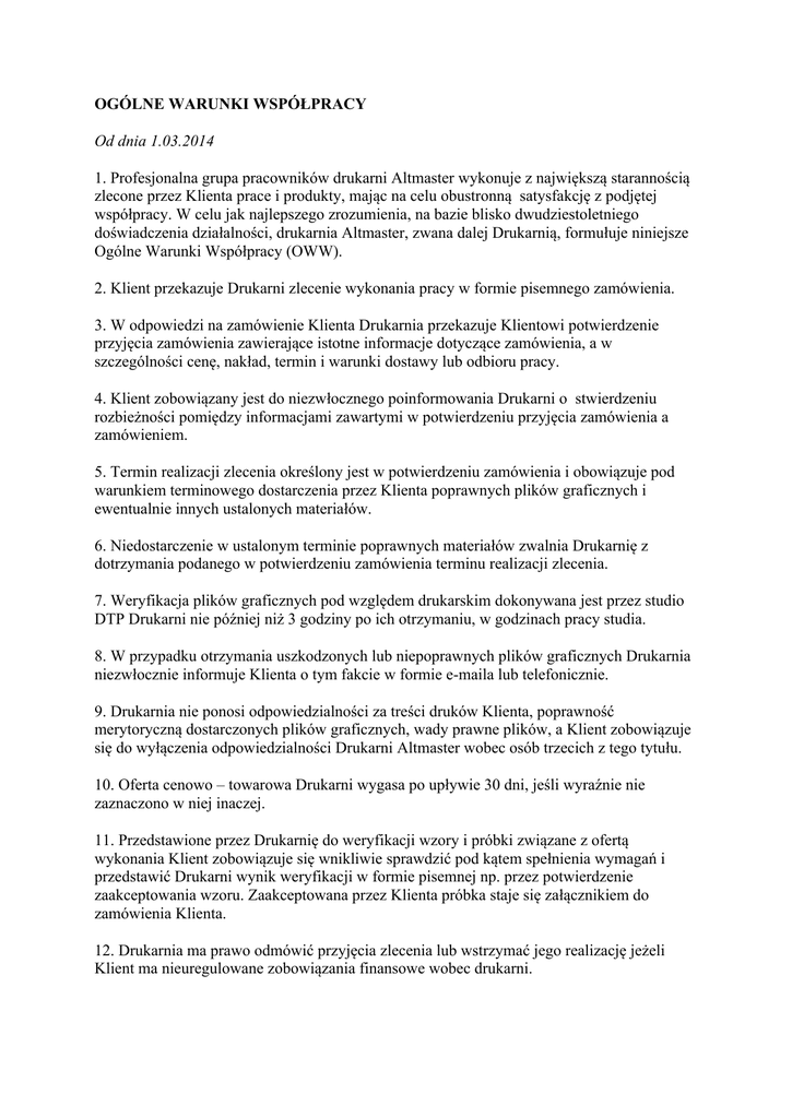 OGÓLNE WARUNKI WSPÓŁPRACY Od dnia 1.03.2014 1. Profesjonalna grupa pracowników drukarni Altmaster wykonuje z największą starannością zlecone przez Klienta prace i produkty, mając na celu obustronną satysfakcję z podjętej współpracy. W celu jak najlepszego zrozumienia, na bazie blisko dwudziestoletniego doświadczenia działalności, drukarnia Altmaster, zwana dalej Drukarnią, formułuje niniejsze Ogólne Warunki Współpracy (OWW). 2. Klient przekazuje Drukarni zlecenie wykonania pracy w formie pisemnego zamówienia. 3. W odpowiedzi na zamówienie Klienta Drukarnia przekazuje Klientowi potwierdzenie przyjęcia zamówienia zawierające istotne informacje dotyczące zamówienia, a w szczególności cenę, nakład, termin i warunki dostawy lub odbioru pracy. 4. Klient zobowiązany jest do niezwłocznego poinformowania Drukarni o stwierdzeniu rozbieżności pomiędzy informacjami zawartymi w potwierdzeniu przyjęcia zamówienia a zamówieniem. 5. Termin realizacji zlecenia określony jest w potwierdzeniu zamówienia i obowiązuje pod warunkiem terminowego dostarczenia przez Klienta poprawnych plików graficznych i ewentualnie innych ustalonych materiałów. 6. Niedostarczenie w ustalonym terminie poprawnych materiałów zwalnia Drukarnię z dotrzymania podanego w potwierdzeniu zamówienia terminu realizacji zlecenia. 7. Weryfikacja plików graficznych pod względem drukarskim dokonywana jest przez studio DTP Drukarni nie później niż 3 godziny po ich otrzymaniu, w godzinach pracy studia. 8. W przypadku otrzymania uszkodzonych lub niepoprawnych plików graficznych Drukarnia niezwłocznie informuje Klienta o tym fakcie w formie e-maila lub telefonicznie. 9. Drukarnia nie ponosi odpowiedzialności za treści druków Klienta, poprawność merytoryczną dostarczonych plików graficznych, wady prawne plików, a Klient zobowiązuje się do wyłączenia odpowiedzialności Drukarni Altmaster wobec osób trzecich z tego tytułu. 10. Oferta cenowo – towarowa Drukarni wygasa po upływie 30 dni, jeśli wyraźnie nie zaznaczono w niej inaczej. 11. Przedstawione przez Drukarnię do weryfikacji wzory i próbki związane z ofertą wykonania Klient zobowiązuje się wnikliwie sprawdzić pod kątem spełnienia wymagań i przedstawić Drukarni wynik weryfikacji w formie pisemnej np. przez potwierdzenie zaakceptowania wzoru. Zaakceptowana przez Klienta próbka staje się załącznikiem do zamówienia Klienta. 12. Drukarnia ma prawo odmówić przyjęcia zlecenia lub wstrzymać jego realizację jeżeli Klient ma nieuregulowane zobowiązania finansowe wobec drukarni. 13. Drukarnia ma prawo uzależnić realizację zamówienia Klienta lub wydanie pracy od wpłaty części lub całości należności. W szczególności dla zleceń klientów rozpoczynających współpracę z Drukarnią stosowana jest zasada przedpłaty zamówienia. 14. Realizacja zamówienia Klienta rozpoczyna się niezwłocznie po zakończeniu weryfikacji dostarczonych plików i Klient ponosi koszty wprowadzonych po tym terminie zmian w zleceniu. 15. Prace dodatkowe spowodowane decyzjami Klienta po złożeniu zamówienia wymagają formy pisemnej i będą doliczone do wartości pierwotnego zamówienia. 16. W przypadku druku na materiale Klienta powinien on dostarczyć ustaloną nadwyżkę materiału. W uzasadnionych technicznie przypadkach Drukarnia może zwrócić się do Klienta o zwiększenie ustalonej nadwyżki materiału w trakcie produkcji lub zmianę warunków realizacji zamówienia. 17. Drukarnia nie odpowiada za wady prac wykonanych na materiale dostarczonym przez Klienta wynikających z zastosowanego materiału. 18. W przypadku dostrzeżenia wad materiałów produkcyjnych dostarczonych przez Klienta, Drukarnia niezwłocznie informuje o tym Klienta. Koszty związane z przerwanym procesem produkcji ponosi Klient. 19. Surowce specjalnie zamawiane przez Drukarnię dla zrealizowania konkretnego zamówienia Klienta, są po 2 miesiącach od daty zakupu fakturowane na Klienta, jeżeli zlecenie to nie zostało zrealizowane z przyczyn Klienta. 20. W przypadku zamówienia przez Klienta druku na podłożach ekonomicznych, może wystąpić różnica kolorów pomiędzy poszczególnymi egzemplarzami produktu. Gwarancja na produkty wykonane na powyższych podłożach może zawierać dodatkowe ograniczenia wyszczególnione w potwierdzeniu zamówienia. 21. Nie podlegają reklamacji nieznaczne odchylenia kolorów wydruków nakładu od odbitek próbnych, jak też pomiędzy wydrukami wykonanymi w różnych technologiach. 22. Tolerancja wymiarowa wykonanych prac wynosi +/-(1% wymiaru + 2 mm), jeżeli nie jest to zaznaczone inaczej w potwierdzeniu zamówienia. 23. Drukarnia nie ma obowiązku przechowywania plików zlecenia ponad 7 dni po zakończeniu jego realizacji. Dostarczone nośniki z plikami zwracane są tylko w przypadku, gdy Klient uprzednio to zgłosi. 24. Drukarnia nie odpowiada za prace nieodebrane przez Klienta w przeciągu jednego miesiąca od ich wykonania. Nieodebranie zamówionych prac nie zwalnia Klienta z obowiązku zapłaty za zamówione prace. 25. W przypadku wystąpienia przeszkód natury wyższej, które wystąpiły po przyjęciu zamówienia, i których Drukarnia, mimo dołożenia należytych starań, nie była w stanie przewidzieć, Drukarnia Altmaster niezwłocznie informuje Klienta o zaistnieniu tego rodzaju przeszkody i jej wpływie na realizację zamówienia. Wówczas Klient podejmuje decyzję o odstąpieniu od umowy lub określeniu nowych warunków realizacji zamówienia. W takich przypadkach Klientowi nie przysługuje prawo roszczenia za szkody spowodowane zmianą lub anulowaniem zamówienia. 26. Za opóźnienia dostarczenia zamówień zleconych przewoźnikowi zewnętrznemu lub kurierowi, które powstały z winy przewoźnika lub kuriera, Drukarnia odpowiada tylko do wysokości kosztów dostarczenia. 27. Odpowiedzialność Drukarni za opóźnienie realizacji zamówienia, przekraczające 1 dobę, jest ograniczona do 10% 