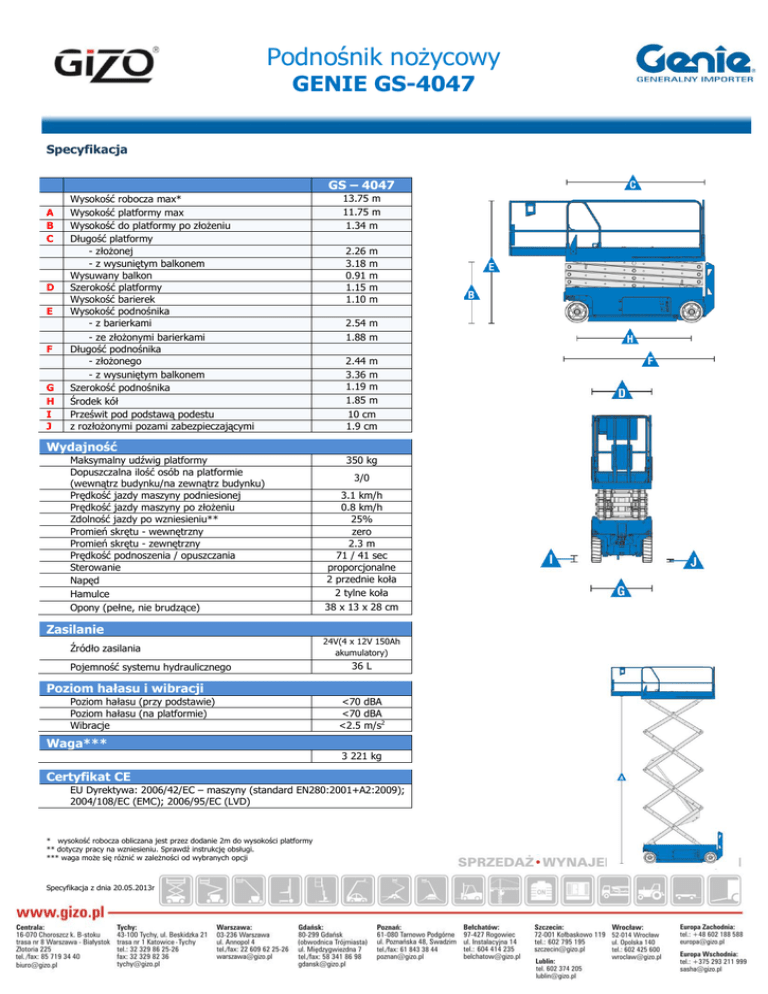 Podnośnik nożycowy GENIE GS-4047 Specyfikacja GS – 4047 A B C D E F G H I J Wysokość robocza max* Wysokość platformy max Wysokość do platformy po złożeniu Długość platformy - złożonej - z wysuniętym balkonem Wysuwany balkon Szerokość platformy Wysokość barierek Wysokość podnośnika - z barierkami - ze złożonymi barierkami Długość podnośnika - złożonego - z wysuniętym balkonem Szerokość podnośnika Środek kół Prześwit pod podstawą podestu z rozłożonymi pozami zabezpieczającymi 13.75 m 11.75 m 1.34 m 2.26 3.18 0.91 1.15 1.10 m m m m m 2.54 m 1.88 m 2.44 m 3.36 m 1.19 m 1.85 m 10 cm 1.9 cm Wydajność Maksymalny udźwig platformy Dopuszczalna ilość osób na platformie (wewnątrz budynku/na zewnątrz budynku) Prędkość jazdy maszyny podniesionej Prędkość jazdy maszyny po złożeniu Zdolność jazdy po wzniesieniu** Promień skrętu - wewnętrzny Promień skrętu - zewnętrzny Prędkość podnoszenia / opuszczania Sterowanie Napęd Hamulce Opony (pełne, nie brudzące) 350 kg 3/0 3.1 km/h 0.8 km/h 25% zero 2.3 m 71 / 41 sec proporcjonalne 2 przednie koła 2 tylne koła 38 x 13 x 28 cm Zasilanie Źródło zasilania Pojemność systemu hydraulicznego 24V(4 x 12V 150Ah akumulatory) 36 L Poziom hałasu i wibracji Poziom hałasu (przy podstawie) Poziom hałasu (na platformie) Wibracje <70 dBA <70 dBA <2.5 m/s2 Waga*** 3 221 kg Certyfikat CE EU Dyrektywa: 2006/42/EC – maszyny (standard EN280:2001+A2:2009); 2004/108/EC (EMC); 2006/95/EC (LVD) * wysokość robocza obliczana jest przez dodanie 2m do wysokości platformy ** dotyczy pracy na wzniesieniu. Sprawdź instrukcję obsługi. *** waga może się różnić w zależności od wybranych opcji Specyfikacja z dnia 20.05.2013r Podnośnik nożycowy GENIE GS-4047 CHARAKTERYSTYKA Standardowe wyposażenie GS-4047 13.75 m – wysokość robocza do 350 kg udźwigu platformy Platforma - 2.26 x 1.15 m stalowa platforma 0.91 m wysuwany balkon Wyposażenie - - manewrowość dzięki dużemu skrętowi kół hamulce tarczowe ułatwiają łagodne zmniejszenie prędkości proporcjonalne sterowanie prędkością jazdy system sterowania Smart Link™ joystick ze wskaźnikiem stopnia naładowania baterii wbudowany system diagnostyczny informuje operatora o awariach czujnik przechylenia z alarmem dźwiękowym czujnik wagi z alarmem dźwiękowym płozy zabezpieczające przed wywróceniem podnośnika przycisk awaryjnego zatrzymania na platformie i panelu dolnym ręczny zawór awaryjnego opuszczania platformy wytrzymałe stalowe barierki ochronne z otwieraną bramką wejścia na platformę oraz antypoślizgowa powierzchnia platformy wysuwane zasobniki na komponenty hydrauliczne i elektroniczne ułatwiają dostęp dla serwisu uchwyty do unoszenia dźwigiem licznik roboczogodzin linia 230 V doprowadzona do platformy (niezabezpieczona) automatyczna ładowarka akumulatorów – standardowa wtyczka na 230 V Zasilanie - 24 V DC - zestaw 4 akumulatorów uniwersalna ładowarka 20 Amp możliwość obsługi baterii kwasowych i żelowych Koła - pełne, lane, niebrudzące Napęd - napęd na 2 koła przednie Opcje dodatkowe - - - Bezobsługowe baterie żelowe, standardowy prostownik przystosowany jest do obsługi obu typu baterii Zabezpieczenie linii 230 V doprowadzonej do platformy (wtyczka, gniazdo, wyłącznik różnicowoprądowy, pomiary elektryczne) Biodegradowalny olej hydrauliczny Linia pneumatyczna doprowadzona do platformy Alarm jazdy podnośnika Podwójne światła ostrzegawcze