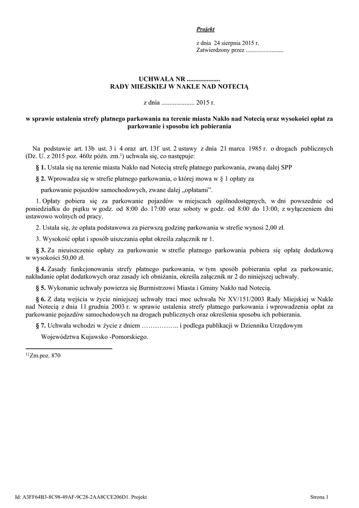 Projekt z dnia 24 sierpnia 2015 r. Zatwierdzony przez ......................... UCHWAŁA NR .................... RADY MIEJSKIEJ W NAKLE NAD NOTECIĄ z dnia .................... 2015 r. w sprawie ustalenia strefy płatnego parkowania na terenie miasta Nakło nad Notecią oraz wysokości opłat za parkowanie i sposobu ich pobierania Na podstawie art. 13b ust. 3 i 4 oraz art. 13f ust. 2 ustawy z dnia 21 marca 1985 r. o drogach publicznych (Dz. U. z 2015 poz. 460z póżn. zm.1) uchwala się, co następuje: § 1. Ustala się na terenie miasta Nakło nad Notecią strefę płatnego parkowania, zwaną dalej SPP § 2. Wprowadza się w strefie płatnego parkowania, o której mowa w § 1 opłaty za parkowanie pojazdów samochodowych, zwane dalej „opłatami”. 1. Opłaty pobiera się za parkowanie pojazdów w miejscach ogólnodostępnych, w dni powszednie od poniedziałku do piątku w godz. od 8:00 do 17:00 oraz soboty w godz. od 8:00 do 13:00, z wyłączeniem dni ustawowo wolnych od pracy. 2. Ustala się, że opłata podstawowa za pierwszą godzinę parkowania w strefie wynosi 2,00 zł. 3. Wysokość opłat i sposób uiszczania opłat określa załącznik nr 1. § 3. Za nieuiszczenie opłaty za parkowanie w strefie płatnego parkowania pobiera się opłatę dodatkową w wysokości 50,00 zł. § 4. Zasady funkcjonowania strefy płatnego parkowania, w tym sposób pobierania opłat za parkowanie, nakładanie opłat dodatkowych oraz zasady ich obniżania, określa załącznik nr 2 do niniejszej uchwały. § 5. Wykonanie uchwały powierza się Burmistrzowi Miasta i Gminy Nakło nad Notecią. § 6. Z datą wejścia w życie niniejszej uchwały traci moc uchwała Nr XV/151/2003 Rady Miejskiej w Nakle nad Notecią z dnia 11 grudnia 2003 r. w sprawie ustalenia strefy płatnego parkowania i wprowadzenia opłat za parkowanie pojazdów samochodowych na drogach publicznych oraz określenia sposobu ich pobierania. § 7. Uchwała wchodzi w życie z dniem …………….. i podlega publikacji w Dzienniku Urzędowym Województwa Kujawsko -Pomorskiego. 1] Zm.poz. 870 Id: A3FF64B3-8C98-49AF-9C28-2AA8CCE206D1. Projekt Strona 1 Załącznik Nr 1do Uchwały Nr .................... Rady Miejskiej w Nakle nad Notecią z dnia 10 sierpnia 2015 r. § 1. Opłaty za parkowanie w SPP uiszcza się poprzez zakup biletu w systemie samoobsługowym w parkomacie lub wykupienie w biurze SPP abonamentu określonego w załączniku nr 2 do uchwały; § 2. Ustala się stawki opłaty za parkowanie pojazdów samochodowych w strefie płatnego parkowania w miejscach niestrzeżonych w dni robocze od poniedziałku do piątku, w godzinach od 8:00 do 17:00 oraz w soboty od 8:00 do 13:00: 1. Opłaty jednorazowe uiszczone w systemie samoobsługowym: Lp. 1. 2. 3. 4. 5. Rodzaj opłat Za pierwsze pół godziny Za pierwszą godzinę Za druga godzinę Za trzecia godzinę Za każdą następną godzinę Wysokość opłaty 1,00 zł 2,00 zł 2,40 zł 2,80 zł 2,00 zł 2. Opłaty abonamentowe uiszczone w biurze SPP: Lp. 1. 2. Rodzaj opłaty Miesięczny abonament mieszkańca/zatrudnionego Miesięczny abonament dla całej strefy Wysokość opłaty 40 zł 100 zł § 3. Stawki zerowe za parkowanie: 1. Ustala się zerową stawkę opłaty za parkowanie: 1) osób niepełnosprawnych posiadających kartę parkingową w rozumieniu ustawy z dnia 20 czerwca 1997 r. Prawo o ruchu drogowym /Dz. U. z 2012 r. poz. 1137/ 2) instytucji obsługujących przewóz osób niepełnosprawnych, mających trudności w poruszaniu się, podczas wykonywania czynności statutowych pojazdami samochodowymi zewnętrznie trwale oznakowanymi 3) kierujących motocyklami; 4) służby obsługi miasta podczas wykonywania obowiązków służbowych pojazdami samochodowymi zewnętrznie trwale oznakowanymi: a) Straż Miejska; b) ZRP c) NADM d) pogotowie energetyczne, gazowe, ciepłownicze, teletechniczne, wodnokanalizacyjne, pojazdy obsługi medycznej, straż pożarna, policja; 5) pojazdów wykorzystywanych przez Urząd Miasta i Gminy do celów służbowych; 6) pojazdów prywatnych pracowników Urzędu Miasta i Gminy Nakło nad Notecią oraz Miejsko-Gminnego Ośrodka Pomocy Społecznej, wykorzystywanych do celów służbowych; 7) oznakowanych pojazdów PCK 2. Pojazdy nieoznakowane wymienione w § 3. ust. 1 pkt. 4, 5, 6, 7, powinny posiadać identyfikatory typu „S” zgodnie z § 9. ust. 5 z Załącznika nr 2 do niniejszej uchwały. Id: A3FF64B3-8C98-49AF-9C28-2AA8CCE206D1. Projekt Strona 1 Załącznik Nr 2 do Uchwały Nr .................... Rady Miejskiej w Nakle nad Notecią z dnia 10 sierpnia 2015 r. Regulamin funkcjonowania strefy płatnego parkowania w Nakle nad Notecią. § 1. Użyte w Regulaminie określenia oznaczają: 1. SPP – Strefa Płatnego Parkowania; 2. kontroler SPP – pracownik służby parkingowej SPP posiadający upoważnienie do kontroli uiszczania opłat za parkowanie i wystawiania zawiadomień o braku opłaty parkingowej; 3. abonament – opłata za postój w SPP wnoszona z góry, której dowodem wniesienia jest identyfikator abonamentowy; 4. identyfikator abonamentowy – dokument wydawany w biurze SPP uprawniający do parkowania na terenie SPP; 5. osoba niepełnosprawna -osoba o obniżonej sprawności ruchowej legitymująca się orzeczeniem o zaliczeniu do znacznego lub umiarkowanego stopnia niepełnosprawności o przyczynie z kodu R lub N, wydanym przez powiatowe lub wojewódzkie zespoły orzekające o niepełnosprawności; 6. karta parkingowa – dokument wydany przez właściwy organ administracji osobom o obniżonej sprawności ruchowej oraz placówkom zajmującym się opieką, rehabilitacją lub edukacją osób niepełnosprawnych, uprawniający do bezpłatnego parkowania pojazdu w całej SPP; 7. parkomat – urządzenie inkasująco -rejestrujące, wydające za opłatą bilet na określony czas parkowania; 8. zawiadomienie – dokument wystawiony przez kontrolera SPP powiadamiający o braku opłaty parkingowej i możliwości nałożenia opłaty dodatkowej za stwierdzo