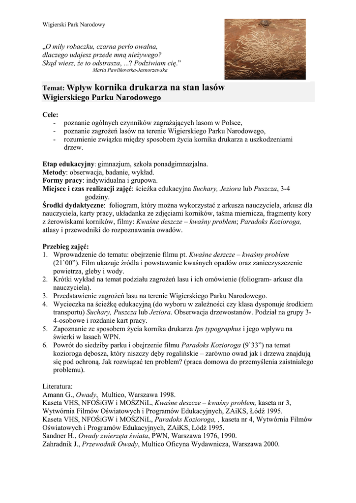 Wigierski Park Narodowy „O miły robaczku, czarna perło owalna, dlaczego udajesz przede mną nieżywego? Skąd wiesz, że to odstrasza, ...? Podziwiam cię.” Maria Pawlikowska-Jasnorzewska Temat: Wpływ kornika drukarza na stan lasów Wigierskiego Parku Narodowego Cele: - poznanie ogólnych czynników zagrażających lasom w Polsce, - poznanie zagrożeń lasów na terenie Wigierskiego Parku Narodowego, - rozumienie związku między sposobem życia kornika drukarza a uszkodzeniami drzew. Etap edukacyjny: gimnazjum, szkoła ponadgimnazjalna. Metody: obserwacja, badanie, wykład. Formy pracy: indywidualna i grupowa. Miejsce i czas realizacji zajęć: ścieżka edukacyjna Suchary, Jeziora lub Puszcza, 3-4 godziny. Środki dydaktyczne: foliogram, który można wykorzystać z arkusza nauczyciela, arkusz dla nauczyciela, karty pracy, układanka ze zdjęciami korników, taśma miernicza, fragmenty kory z żerowiskami korników, filmy: Kwaśne deszcze – kwaśny problem; Paradoks Kozioroga, atlasy i przewodniki do rozpoznawania owadów. Przebieg zajęć: 1. Wprowadzenie do tematu: obejrzenie filmu pt. Kwaśne deszcze – kwaśny problem (21`00”). Film ukazuje źródła i powstawanie kwaśnych opadów oraz zanieczyszczenie powietrza, gleby i wody. 2. Krótki wykład na temat podziału zagrożeń lasu i ich omówienie (foliogram- arkusz dla nauczyciela). 3. Przedstawienie zagrożeń lasu na terenie Wigierskiego Parku Narodowego. 4. Wycieczka na ścieżkę edukacyjną (do wyboru w zależności czy klasa dysponuje środkiem transportu) Suchary, Puszcza lub Jeziora. Obserwacja drzewostanów. Podział na grupy 34-osobowe i rozdanie kart pracy. 5. Zapoznanie ze sposobem życia kornika drukarza Ips typographus i jego wpływu na świerki w lasach WPN. 6. Powrót do siedziby parku i obejrzenie filmu Paradoks Kozioroga (9`33”) na temat kozioroga dębosza, który niszczy dęby rogalińskie – zarówno owad jak i drzewa znajdują się pod ochroną. Jak rozwiązać ten problem? (praca domowa do przemyślenia zaistniałego problemu). Literatura: Amann G., Owady, Multico, Warszawa 1998. Kaseta VHS, NFOŚiGW i MOŚZNiL, Kwaśne deszcze – kwaśny problem, kaseta nr 3, Wytwórnia Filmów Oświatowych i Programów Edukacyjnych, ZAiKS, Łódź 1995. Kaseta VHS, NFOŚiGW i MOŚZNiL, Paradoks Kozioroga, , kaseta nr 4, Wytwórnia Filmów Oświatowych i Programów Edukacyjnych, ZAiKS, Łódź 1995. Sandner H., Owady zwierzęta świata, PWN, Warszawa 1976, 1990. Zahradnik J., Przewodnik Owady, Multico Oficyna Wydawnicza, Warszawa 2000. Wigierski Park Narodowy Wiesława Malinowska Podstawowe informacje dla ucznia 1. Na stan lasu wpływają różne czynniki ekologiczne, wśród których wyróżniamy: • abiotyczne (klimatyczne: temperatura i wilgotność powietrza, wiatr, promieniowanie słoneczne; edaficzne - właściwości chemiczne, fizyczne i biologiczne gleby, to jest struktura, wilgotność, temperatura gleby, kwasowość, pH, obecność soli mineralnych i organizmów glebowych, • biotyczne (regulujące rozmieszczenie i liczebność roślin i zwierząt, relacje powstające w wyniku oddziaływania jednych organizmów na drugie poprzez, np. symbiozę, konkurencję międzygatunkową, wewnątrzgatunkową, pasożytnictwo, drapieżnictwo, kooperację itp., • antropogeniczne (czynniki powstałe w wyniku działalności człowieka np. rozwój przemysłu, transportu, jest głównym źródłem dużych stężeń tlenków siarki, azotu, fluoru w powietrzu i glebie, pożary). Powstają kwaśne deszcze, które uszkadzają liście powodując brązowienie igieł, zasychanie i odpadanie. Korony drzew mają duże ubytki ulistnienia, są rzadkie, prześwietlone. W glebie następuje wypłukanie związków wapnia i magnezu, niszczone są grzyby mikoryzowe i związki mineralne są trudniej dostępne, pogarsza się przyswajalność związków pokarmowych i kondycja drzewa jest coraz słabsza. Drzewo osłabione zaczynają atakować grzyby chorobotwórcze, powodując zgniliznę i drzewo obumiera. 2. Lasy Wigierskiego Parku Narodowego są narażone na różnego rodzaju czynniki. W wyniku ocieplania się klimatu, obserwuje się w ostatnich latach często pojawiające się okresy suszy i obniżenie poziomu wód gruntowych, co przyczynia się do osłabienia drzewostanu. Drzewa są atakowane przez grzyby pasożytnicze i szkodniki owadzie np. korniki. Zagrożeniom ze strony owadów sprzyjają monokultury świerka, na którym żerują między innymi korniki. W sprzyjających warunkach, te owady mają skłonność do gradacji*. *Gradacja jest to masowe pojawienie się gatunku na skutek wzrostu populacji i dzięki sprzyjającym warunkom. Przy gradacji kornika tworzy się tzw. gniazdo, pierwotne ognisko gradacyjne, w którym liczebność szkodnika gwałtownie rośnie. Następnie ogniska gradacyjne łączą się ze sobą na rozległych powierzchniach. Duże zagęszczenie szkodnika sprzyja rozwojowi chorób epidemicznych, wirusowych, bakteryjnych i grzybowych. W końcowym stadium gradacji drzewostan całkowicie zamiera. 3. Kornik drukarz Ips typographus należy do najgroźniejszych szkodników świerków. Zasiedla najchętniej świerki 60-100 letnie. Jego długość ciała wynosi 4-5 mm. Jest koloru ciemnobrunatnego z silnym połyskiem. Czułki i nogi są rude. Ściany pokryw mają po cztery ząbki (cecha odróżniająca od innych korników). W dogodnych warunkach atmosferycznych ma 2-3 pokolenia rocznie (kwiecień/maj i lipiec/sierpień). Rójka przypada na kwiecień. Należy do szkodników wtórnych tzn. atakuje drzewa połamane, wywrócone przez wiatr, osłabione przez inne szkodniki (brudnicę) lub grzyby (opieńkę miodową) albo inne czynniki abiotyczne. Komorę godową wygryza samiec. Gromadzą się w niej po 2-3 samice, które samiec zapładnia. Przy 2 samicach od komory odchodzą 2 chodniki, jeden w górę, drugi w dół, przy 3 samicach – dwa chodniki odchodzą w dół, jeden w górę. Każda samica składa od 20 do 100 jaj. 