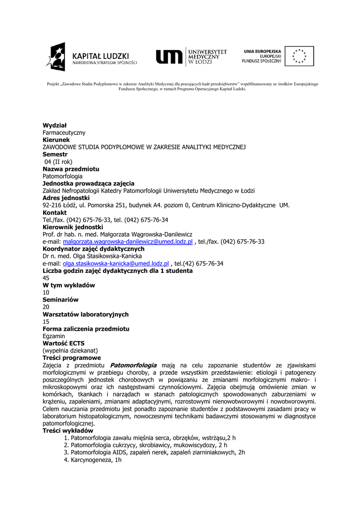 Projekt „Zawodowe Studia Podyplomowe w zakresie Analityki Medycznej dla pracujących kadr przedsiębiorstw” współfinansowany ze środków Europejskiego Funduszu Społecznego, w ramach Programu Operacyjnego Kapitał Ludzki. Wydział Farmaceutyczny Kierunek ZAWODOWE STUDIA PODYPLOMOWE W ZAKRESIE ANALITYKI MEDYCZNEJ Semestr 04 (II rok) Nazwa przedmiotu Patomorfologia Jednostka prowadząca zajęcia Zakład Nefropatologii Katedry Patomorfologii Uniwersytetu Medycznego w Łodzi Adres jednostki 92-216 Łódź, ul. Pomorska 251, budynek A4. poziom 0, Centrum Kliniczno-Dydaktyczne UM. Kontakt Tel./fax. (042) 675-76-33, tel. (042) 675-76-34 Kierownik jednostki Prof. dr hab. n. med. Małgorzata Wągrowska-Danilewicz e-mail: [email protected] , tel./fax. (042) 675-76-33 Koordynator zajęć dydaktycznych Dr n. med. Olga Stasikowska-Kanicka e-mail: [email protected] , tel.(42) 675-76-34 Liczba godzin zajęć dydaktycznych dla 1 studenta 45 W tym wykładów 10 Seminariów 20 Warsztatów laboratoryjnych 15 Forma zaliczenia przedmiotu Egzamin Wartość ECTS (wypełnia dziekanat) Treści programowe Zajęcia z przedmiotu Patomorfologia mają na celu zapoznanie studentów ze zjawiskami morfologicznymi w przebiegu choroby, a przede wszystkim przedstawienie: etiologii i patogenezy poszczególnych jednostek chorobowych w powiązaniu ze zmianami morfologicznymi makro- i mikroskopowymi oraz ich następstwami czynnościowymi. Zajęcia obejmują omówienie zmian w komórkach, tkankach i narządach w stanach patologicznych spowodowanych zaburzeniami w krążeniu, zapaleniami, zmianami adaptacyjnymi, rozrostowymi nienowotworowymi i nowotworowymi. Celem nauczania przedmiotu jest ponadto zapoznanie studentów z podstawowymi zasadami pracy w laboratorium histopatologicznym, nowoczesnymi technikami badawczymi stosowanymi w diagnostyce patomorfologicznej. Treści wykładów 1. Patomorfologia zawału mięśnia serca, obrzęków, wstrżąsu,2 h 2. Patomorfologia cukrzycy, skrobiawicy, mukowiscydozy, 2 h 3. Patomorfologia AIDS, zapaleń nerek, zapaleń ziarniniakowych, 2h 4. Karcynogeneza, 1h 5. Patomorfologia nowotworów piersi, jajników i macicy, chłoniaków/białaczek, 3 h Treści warsztatów laboratoryjnych 1. Mikroskopowe zmiany narządowe w zaburzeniach w krążeniu, zmianach adaptacyjnych i wstecznych, 1h 2. Mikroskopowe zmiany narządowe w wybranych chorobach zapalnych, 1h 3. Mikroskopowe zmiany narządowe w wybranych chorobach nowotworowych, 2h 4. Cytodiagnostyka złuszczeniowa i aspiracyjna, 1h 5. Organizacja pracy w pracowniach histopatologicznych/cytologicznych oraz zasady działania urządzeń wykorzystywanych w laboratorium o profilu histopatologicznym, 1h 6. Sporządzanie rutynowych preparatów histologicznych (pobieranie wycinków tkankowych, utrwalanie, przeprowadzanie, zatapianie, skrawanie przy pomocy mikrotomu, barwienie przeglądowe hematoksyliną i eozyną), 3h 7. Metodyka barwień wybiórczych, 2h 8. Techniki immunohistochemiczne stosowane w diagnostyce histopatologicznej, 3h. 9. Technika immunofluorescencji bezpośredniej, 1h Treści zajęć seminaryjnych 1. Patomorfologia zaburzeń w krążeniu, 3h 2. Patomorfologia zmian adaptacyjnych i wstecznych, 2h 3. Patomorfologia zapaleń, 3h 4. Patomorfologia wybranych chorób nowotworowych, 6h 5. Techniki histopatologiczne, 3h 6. Znaczenie badań cytologicznych w diagnostyce nowotworów, 3h Podstawowe podręczniki 1. Kruś S, Skrzypek-Fakhoury E: Patomorfologia kliniczna. Podręcznik dla studentów. PZWL, 2007 2. Zabel M. Immunocytochemia. PWN Warszawa 1999 3. Litwin JA. Podstawy technik mikroskopowych. Wydawnictwo Uniwersytetu Jagiellońskiego. Kraków 1999 .