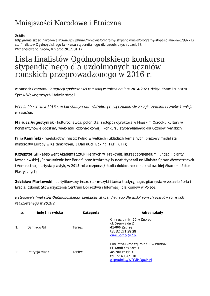 Mniejszości Narodowe i Etniczne Źródło: http://mniejszosci.narodowe.mswia.gov.pl/mne/romowie/programy-stypendialne-d/programy-stypendialne-m-1/9977,Li sta-finalistow-Ogolnopolskiego-konkursu-stypendialnego-dla-uzdolnionych-ucznio.html Wygenerowano: Środa, 8 marca 2017, 01:17 Lista finalistów Ogólnopolskiego konkursu stypendialnego dla uzdolnionych uczniów romskich przeprowadzonego w 2016 r. w ramach Programu integracji społeczności romskiej w Polsce na lata 2014-2020, dzięki dotacji Ministra Spraw Wewnętrznych i Administracji W dniu 29 czerwca 2016 r. w Konstantynowie Łódzkim, po zapoznaniu się ze zgłoszeniami uczniów komisja w składzie: Mariusz Augustyniak - kulturoznawca, polonista, zastępca dyrektora w Miejskim Ośrodku Kultury w Konstantynowie Łódzkim, wieloletni członek komisji konkursu stypendialnego dla uczniów romskich; Filip Kamiński - wielokrotny mistrz Polski w walkach i układach formalnych, brązowy medalista mistrzostw Europy w Kaltenkirchen, 1 Dan (Kick Boxing, TKD, JCTF); Krzysztof Gil - absolwent Akademii Sztuk Pięknych w Krakowie, laureat stypendium Fundacji Jolanty Kwaśniewskiej „Porozumienie bez Barier” oraz trzykrotny laureat stypendium Ministra Spraw Wewnętrznych i Administracji, artysta plastyk, w 2013 roku rozpoczął studia doktoranckie na krakowskiej Akademii Sztuk Plastycznych; Zdzisław Markowski - certyfikowany instruktor muzyki i tańca tradycyjnego, gitarzysta w zespole Perła i Bracia, członek Stowarzyszenia Centrum Doradztwa i Informacji dla Romów w Polsce. wytypowała finalistów Ogólnopolskiego konkursu stypendialnego dla uzdolnionych uczniów romskich realizowanego w 2016 r. l.p. 1. 2. Imię i nazwisko Santiago Gil Patrycja Mirga Kategoria Adres szkoły Taniec Gimnazjum Nr 16 w Zabrzu ul. Szenwalda 2 41-800 Zabrze tel. 32 271 38 28 [email protected] Taniec Publiczne Gimnazjum Nr 1 w Prudniku ul. Armii Krajowej 1 48-200 Prudnik tel. 77 406 89 10 [email protected] l.p. Imię i nazwisko Kategoria Wiktoria Gil 3. 4. 5. 6. 7. 8. 9. 10. Taniec Dariusz Bołtyzer Karolina Mirga Estera Mej Wanessa Mirga Nikol Linder Natalia Mirga Erwin Brzeziński Taniec Taniec Adres szkoły Zespół Szkół Im. Stanisława Wyspiańskiego w Bibicach ul. Kościuszki 56A 32-087 Zielonki tel. 12 285 88 21 [email protected] Specjalny Ośrodek Szkolno-Wychowawczy w Prudniku ul. Młyńska 1 48-200 Prudnik tel.77 406 89 10 [email protected] Publiczne Gimnazjum Nr 9 ul. Piotra Skargi 11 47-224 Kędzierzyn Koźle tel.77 483 21 32 [email protected] Sztuki plastyczne Szkoła Podstawowa Im. Adama Mickiewicza ul. Kongresowa 11 32-640 Zator tel. 33 841 08 03 [email protected] Sztuki plastyczne Publiczne Gimnazjum Nr 1 ul. Armii Krajowej 1 48-200 Prudnik tel. 77 406-89-10 [email protected] Sztuki plastyczne Zespół Szkół im. AK w Andrychowie ul. Rynek 12 34-120 Andrychów tel.33 875 20 13 [email protected] Sztuki plastyczne Publiczne Gim. Nr 4 ul. 1 Maja 3 47-220 Kędzierzyn Koźle tel.77 483 056 32 [email protected] Sztuki plastyczne Szkoła Podstawowa Nr 10 ul. Ozorkowska 68/70 95-100 Zgierz tel. 42 716 47 09 [email protected] l.p. 11. 12. Imię i nazwisko Samanta Paczkowska Angelo Andrzej Ciureja Kategoria Adres szkoły Sztuki plastyczne Specjalny Ośrodek Szkolno-Wychowawczy w Prudniku ul. Młyńska 1 48-200 Prudnik tel.77 406 89 10 [email protected] Śpiew Zespół Szkół Nr 3 Im. Mikołaja Kopernika ul. Jordana 4 58-305 Wałbrzych tel.74 842 42 63 [email protected] 13. Gil Ewelina Śpiew ZSS nr 39 Im. Montessori ul. Wojska Polskiego 10 41-800 Zabrze Tel.32 271 24 93 [email protected] 14. Angelika Zimnicka Śpiew Samorządowy Zespół Szkół Nr 1 w Opatowie Tel. 15 868 46 71 [email protected] 15. Zespół Państwowych Szkół Muzycznych 31-934 Kraków Muzyka instrumentalna Os. Centrum E2 tel. 12 644 88 35 [email protected] 16. Emilia Leśniak Zespół Szkół Miejskich Nr 2 Szkoła Pod. Nr 11 Muzyka instrumentalna ul. Mickiewicza 108 38-200 Jasło [email protected] Wiktor Dymitrak Ogólnokształcąca Szkoła Muzyczna I ST. w Legnicy ul.Chojnowska2 Muzyka instrumentalna tel.76 862-26-36 [email protected] Olga Szafira Głowacka Szkoła Podstawowa Nr 5 w Białogardzie ul. Białobrzeska 23 Muzyka instrumentalna Państwowa Szkoła Muzyczna I Stopnia w Białogardzie ul. Dworcowa 4 [email protected] Gracjan Adrasz 17. 18. 19. Mikołaj Jaworski Szkoła Muzyczna I i II Stopnia Im. Tadeusza Szeligowskiego ul. Chrobrego 3/66 Muzyka instrumentalna 66-400 Gorzów Wlkp. Tel. 957 227 357 [email protected] l.p. 20. 21. 22. 23. Imię i nazwisko Sebastian Lubecki Jagoda Leszcz Oliwia Szadkowska Bianka Łakatosz Kategoria Adres szkoły Sport Zespół Szkół Integracyjnych ul. Szkolna 2 16-100 Sokółka Tel.85 711 21 36 [email protected] Sport Szkoła Podstawowa Nr 45 im. Zbigniewa Herberta w Lublinie ul. Radzyńska 5 [email protected] Sport Sz. Pod. Nr 92 im. B. Westerplatte Os. Kalinowe 18 31-814 Kraków tel. 12 648 27 46 www.SP92.Krakow.pl [email protected] Sport Szkoła Podstawowa z Oddziałami Integracyjnymi w Pyrzycach ul. Poznańska 2 tel. 91 570 11 30 [email protected] Wstecz Drukuj Generuj PDF Powiadom znajomego