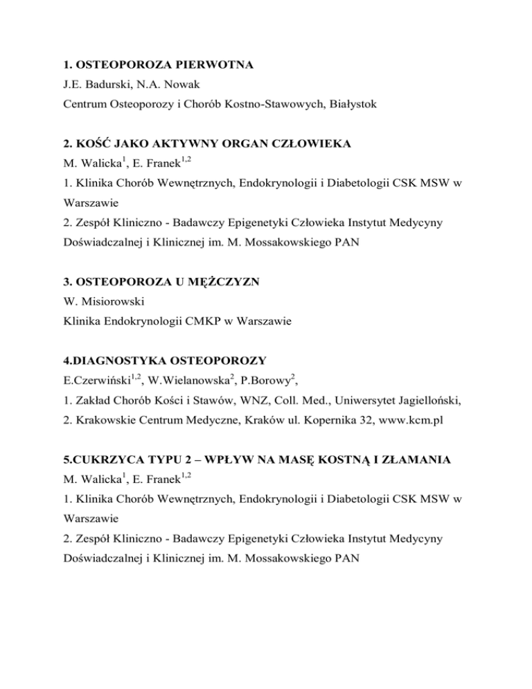 1. OSTEOPOROZA PIERWOTNA J.E. Badurski, N.A. Nowak Centrum Osteoporozy i Chorób Kostno-Stawowych, Białystok 2. KOŚĆ JAKO AKTYWNY ORGAN CZŁOWIEKA M. Walicka1, E. Franek1,2 1. Klinika Chorób Wewnętrznych, Endokrynologii i Diabetologii CSK MSW w Warszawie 2. Zespół Kliniczno - Badawczy Epigenetyki Człowieka Instytut Medycyny Doświadczalnej i Klinicznej im. M. Mossakowskiego PAN 3. OSTEOPOROZA U MĘŻCZYZN W. Misiorowski Klinika Endokrynologii CMKP w Warszawie 4.DIAGNOSTYKA OSTEOPOROZY E.Czerwiński1,2, W.Wielanowska2, P.Borowy2, 1. Zakład Chorób Kości i Stawów, WNZ, Coll. Med., Uniwersytet Jagielloński, 2. Krakowskie Centrum Medyczne, Kraków ul. Kopernika 32, www.kcm.pl 5.CUKRZYCA TYPU 2 – WPŁYW NA MASĘ KOSTNĄ I ZŁAMANIA M. Walicka1, E. Franek1,2 1. Klinika Chorób Wewnętrznych, Endokrynologii i Diabetologii CSK MSW w Warszawie 2. Zespół Kliniczno - Badawczy Epigenetyki Człowieka Instytut Medycyny Doświadczalnej i Klinicznej im. M. Mossakowskiego PAN 6. RYZYKO ZŁAMAŃ ZWIĄZANE Z PRZEWLEKŁYM PODAWANIEM GLIKOKORTYKOSTEROIDÓW P. Głuszko Klinika i Poliklinika Reumatologii Instytut Reumatologii w Warszawie Krakowska Akademia im. A. Frycza-Modrzewskiego, Kraków 7. ZŁAMANIA KOŚCI W PRZEWLEKŁEJ CHOROBIE NEREK Andrzej Więcek, Teresa Nieszporek Katedra i Klinika Nefrologii Transplantologii i Chorób Wewnętrznych Śląskiego Uniwersytetu Medycznego w Katowicach 8. CHOROBA NOWOTWOROWA KOŚCI W. Misiorowski Klinika Endokrynologii CMKP w Warszawie 9. PROBLEM ZŁAMAŃ OSTEOPOROTYCZNCH E.Czerwiński1,2, P.Rozpondek2, M.Synder3, J.Amarowicz1, B.Berwecka1 1.Uniwersytet Jagielloński-Collegium Medicum, Wydział Nauk o Zdrowiu, Zakład Chorób Kości i Stawów 2. Krakowskie Centrum Medyczne. www.kcm.pl 3. Klinika Ortopedii i Ortopedii Dziecięcej, UM Łódź 10. SUPLEMENTACJA WAPNIA I WITAMINY D W ZAPOBIEGANIU ZŁAMAŃ OSTEOPOROTYCZNYCH U OSÓB STARSZYCH: KORZYŚCI I KONTROWERSJE E. Marcinowska-Suchowierska Klinika Medycyny Rodzinnej, Chorób Wewnętrznych i Chorób Metabolicznych Kości Centrum Medycznego Kształcenia Podyplomowego w Warszawie 11. LECZENIE FARMAKOLOGICZNE OSTEOPOROZY E. Marcinowska-Suchowierska Klinika Medycyny Rodzinnej, Chorób Wewnętrznych i Chorób Metabolicznych Kości Centrum Medycznego Kształcenia Podyplomowego w Warszawie 12. LECZENIE FARMAKOLOGICZNE OSTEOPOROZY – DZIAŁANIA NIEPOŻĄDANE LEKÓW, POWIKŁANIA E. Marcinowska-Suchowierska Klinika Medycyny Rodzinnej, Chorób Wewnętrznych i Chorób Metabolicznych Kości Centrum Medycznego Kształcenia Podyplomowego w Warszawie 13. UPADKI JAKO PRZYCZYNA ZŁAMAŃ I ZWIĘKSZONEJ ŚMIERTELNOŚCI A. Skalska, M. Fedyk-Łukasik Katedra Chorób Wewnętrznych i Gerontologii UJ CM 14. SARKOPENIA - PATOGENEZA, DIAGNOSTYKA I LECZENIE E. Czerwiński1,2, M. Berwecka1, K. Boczoń1 1. Uniwersytet Jagielloński – Collegium Medicum, Wydział Nauk o Zdrowiu, Zakład Chorób Kości i Stawów 2. Krakowskie Centrum Medyczne. www.kcm.pl 15. SARKOPENIA A OSTEOPOROZA M. Berwecka1, K. Boczoń1, E. Czerwiński1,2 1. Uniwersytet Jagielloński – Collegium Medicum, Wydział Nauk o Zdrowiu, Zakład Chorób Kości i Stawów 2. Krakowskie Centrum Medyczne. www.kcm.pl 16. NORDIC WALKING W ZAPOBIEGANIU UPADKOM J. Opara Akademia Wychowania Fizycznego im. Jerzego Kukuczki w Katowicach „Repty” Górnośląskie Centrum Rehabilitacji w Tarnowskich Górach 17.SYSTEM ZAPOBIEGANIA ZŁAMANIOM NA ŚWIECIE I W POLSCE J. Amarowicz 1 , E. Czerwiński 1,2 1. Uniwersytet Jagielloński – Collegium Medicum, Wydział Nauk o Zdrowiu, Zakład Chorób Kości i Stawów 2. Krakowskie Centrum Medyczne. www.kcm.pl