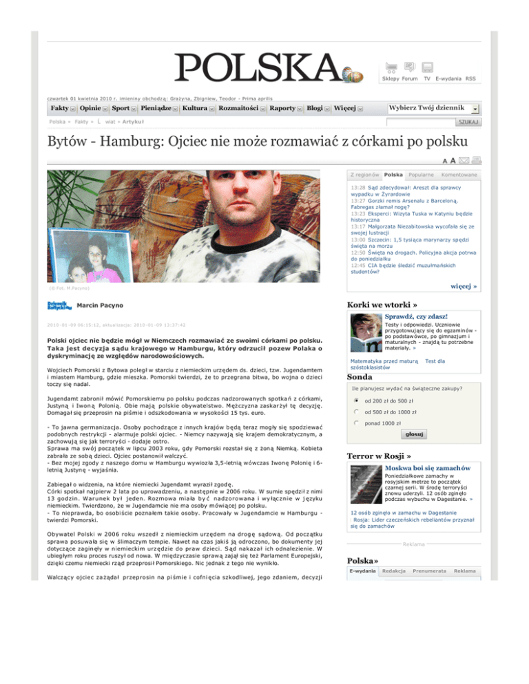 Sklepy Forum TV Ewydania RSS czwartek 01 kwietnia 2010 r. imieniny obchodz ą: Grażyna, Zbigniew, Teodor Prima aprilis Fakty Opinie Sport Pieniądze Kultura Rozmaitości Raporty Blogi Więcej Wybierz Twój dziennik Polska » Fakty » Ĺ wiat » Artyku ł Bytów Hamburg: Ojciec nie może rozmawiać z córkami po polsku Z region ów Polska Popularne Komentowane 13:28 Sąd zdecydowa ł: Areszt dla sprawcy wypadku w Żyrardowie 13:27 Gorzki remis Arsenalu z Barcelon ą. Fabregas z łamał nogę? 13:23 Eksperci: Wizyta Tuska w Katyniu b ędzie historyczna 13:17 Małgorzata Niezabitowska wycofa ła się ze swojej lustracji 13:00 Szczecin: 1,5 tysiąca marynarzy sp ędzi święta na morzu 12:50 Święta na drogach. Policyjna akcja potrwa do poniedzia łku 12:45 CIA b ędzie śledzić muzułmańskich studentów? więcej » (© Fot. M.Pacyno) Marcin Pacyno Korki we wtorki » Sprawdź, czy zdasz! Testy i odpowiedzi. Uczniowie przygotowuj ący się do egzamin ów po podstawówce, po gimnazjum i maturalnych znajdą tu potrzebne materiały. » 2 0 1 0 01 09 06:15:12, aktualizacja: 2010 01 09 13:37:42 Polski ojciec nie będzie mógł w Niemczech rozmawiać ze swoimi córkami po polsku. Taka jest decyzja s ądu krajowego w Hamburgu, kt óry odrzucił pozew Polaka o dyskryminację ze względów narodowościowych. Wojciech Pomorski z Bytowa poleg ł w starciu z niemieckim urzędem ds. dzieci, tzw. Jugendamtem i miastem Hamburg, gdzie mieszka. Pomorski twierdzi, że to przegrana bitwa, bo wojna o dzieci toczy się nadal. Jugendamt zabroni ł mówić Pomorskiemu po polsku podczas nadzorowanych spotka ń z córkami, Justyną i Iwon ą Polonią. Obie maj ą polskie obywatelstwo. M ęż czyzna zaskar żył tę decyzję. Domagał się przeprosin na pi śmie i odszkodowania w wysoko ści 15 tys. euro. To jawna germanizacja. Osoby pochodz ące z innych krajów b ędą teraz mog ły się spodziewa ć podobnych restrykcji alarmuje polski ojciec. Niemcy nazywaj ą się krajem demokratycznym, a zachowuj ą się jak terroryści dodaje ostro. Sprawa ma sw ój pocz ątek w lipcu 2003 roku, gdy Pomorski rozsta ł się z żoną Niemką. Kobieta zabra ła ze sob ą dzieci. Ojciec postanowi ł walczyć. Bez mojej zgody z naszego domu w Hamburgu wywioz ła 3,5letnią wówczas Iwon ę Polonię i 6 letnią Justynę wyjaśnia. Zabiega ł o widzenia, na które niemiecki Jugendamt wyraził zgod ę. Córki spotka ł najpierw 2 lata po uprowadzeniu, a nast ępnie w 2006 roku. W sumie spędził z nimi 13 godzin. Warunek by ł jeden. Rozmowa mia ła b y ć nadzorowana i wy łąc z n i e w j ęzyku niemieckim. Twierdzono, że w Jugendamcie nie ma osoby mówiącej po polsku. To nieprawda, bo osobi ście pozna łem takie osoby. Pracowa ły w Jugendamcie w Hamburgu twierdzi Pomorski. Obywatel Polski w 2006 roku wszed ł z niemieckim urz ędem na drog ę sądow ą. Od pocz ątku sprawa posuwa ła si ę w ślimaczym tempie. Nawet na czas jaki ś ją odroczono, bo dokumenty jej dotyczące zagin ęły w niemieckim urz ędzie do praw dzieci. S ąd nakaza ł ich odnalezienie. W ubiegłym roku proces ruszył od nowa. W międzyczasie spraw ą zajął się też Parlament Europejski, dzięki czemu niemiecki rząd przeprosi ł Pomorskiego. Nic jednak z tego nie wynikło. Walcz ący ojciec za żądał przeprosin na pi śmie i cofni ęcia szkodliwej, jego zdaniem, decyzji Jugendamtu. Przeliczy ł się. Sąd stwierdzi ł, że nie pojawi ły się ż adne nowe okoliczno ści mogące świadczy ć na jego korzy ść. Nie zgodzi ł się także na odszkodowanie, ale Pomorski nie rezygnuje. Będę się odwo ływa ł do kolejnych dw óch niemieckich instancji, a nawet do Europejskiego Trybunału P r a w C z łowieka w Strasburgu zapowiada. Doskonale rozumiem t ę decyzję. W końcu gdyby s ąd wyda ł wyrok korzystny dla mnie, to by łby to precedens. Wnioskuj ę, że przed niemieckim sądem nic nie wsk óram. Przecież gdyby Niemcowi dzieci odebra ła np. matka Tajka, to nie zabroniono by mu rozmowy po niemiecku. To germanizacja, z którą się nie godz ę podkre śla. Jednak nawet gdyby Pomorski wygra ł proces i m ógł rozmawia ć z c órkami po polsku, to nie wiadomo, czy dosz łoby do spotkania. Matka uprowadzi ła je do Wiednia. Tam toczy si ę kolejny proces, w kt órym bytowiak domaga si ę widzenia dzieci i mo żliwości pos łania ich do polskiej szko ły z nauką religii. Matematyka przed matur ą szóstoklasistów Test dla Sonda Ile planujesz wyda ć na świąteczne zakupy? i od 200 zł do 500 zł j k l m n n od 500 zł do 1000 zł j k l m j ponad 1000 zł k l m n Terror w Rosji » Moskwa boi się zamachów Poniedziałkowe zamachy w rosyjskim metrze to pocz ątek czarnej serii. W środę terrory ści znowu uderzyli. 12 os ób zginęło podczas wybuchu w Dagestanie. » 12 osób zginęło w zamachu w Dagestanie Rosja: Lider czecze ńskich rebeliant ów przyzna ł się do zamach ów Reklama Polska» Ewydania Redakcja Prenumerata Reklama dotyczące zagin ęły w niemieckim urz ędzie do praw dzieci. S ąd nakaza ł ich odnalezienie. W ubiegłym roku proces ruszył od nowa. W międzyczasie spraw ą zajął się też Parlament Europejski, dzięki czemu niemiecki rząd przeprosi ł Pomorskiego. Nic jednak z tego nie wynikło. Walcz ący ojciec za żądał przeprosin na pi śmie i cofni ęcia szkodliwej, jego zdaniem, decyzji Jugendamtu. Przeliczy ł się. Sąd stwierdzi ł, że nie pojawi ły się ż adne nowe okoliczno ści mogące świadczy ć na jego korzy ść. Nie zgodzi ł się także na odszkodowanie, ale Pomorski nie rezygnuje. Będę się odwo ływa ł do kolejnych dw óch niemieckich instancji, a nawet do Europejskiego Trybunału P r a w C z łowieka w Strasburgu zapowiada. Doskonale rozumiem t ę decyzję. W końcu gdyby s ąd wyda ł wyrok korzystny dla mnie, to by łby to precedens. Wnioskuj ę, że przed niemieckim sądem nic nie wsk óram. Przecież gdyby Niemcowi dzieci odebra ła np. matka Tajka, to nie zabroniono by mu rozmowy po nie