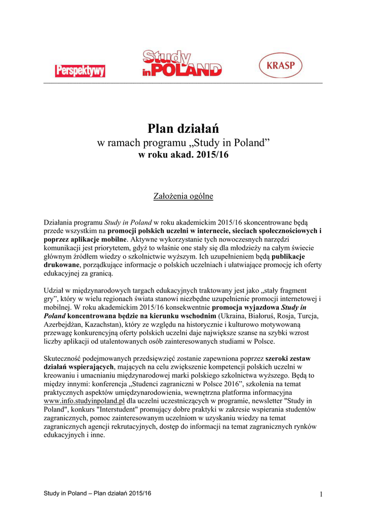 Plan działań w ramach programu „Study in Poland” w roku akad. 2015/16 Założenia ogólne Działania programu Study in Poland w roku akademickim 2015/16 skoncentrowane będą przede wszystkim na promocji polskich uczelni w internecie, sieciach społecznościowych i poprzez aplikacje mobilne. Aktywne wykorzystanie tych nowoczesnych narzędzi komunikacji jest priorytetem, gdyż to właśnie one stały się dla młodzieży na całym świecie głównym źródłem wiedzy o szkolnictwie wyższym. Ich uzupełnieniem będą publikacje drukowane, porządkujące informacje o polskich uczelniach i ułatwiające promocję ich oferty edukacyjnej za granicą. Udział w międzynarodowych targach edukacyjnych traktowany jest jako „stały fragment gry”, który w wielu regionach świata stanowi niezbędne uzupełnienie promocji internetowej i mobilnej. W roku akademickim 2015/16 konsekwentnie promocja wyjazdowa Study in Poland koncentrowana będzie na kierunku wschodnim (Ukraina, Białoruś, Rosja, Turcja, Azerbejdżan, Kazachstan), który ze względu na historycznie i kulturowo motywowaną przewagę konkurencyjną oferty polskich uczelni daje największe szanse na szybki wzrost liczby aplikacji od utalentowanych osób zainteresowanych studiami w Polsce. Skuteczność podejmowanych przedsięwzięć zostanie zapewniona poprzez szeroki zestaw działań wspierających, mających na celu zwiększenie kompetencji polskich uczelni w kreowaniu i umacnianiu międzynarodowej marki polskiego szkolnictwa wyższego. Będą to między innymi: konferencja „Studenci zagraniczni w Polsce 2016”, szkolenia na temat praktycznych aspektów umiędzynarodowienia, wewnętrzna platforma informacyjna www.info.studyinpoland.pl dla uczelni uczestniczących w programie, newsletter "Study in Poland", konkurs "Interstudent" promujący dobre praktyki w zakresie wspierania studentów zagranicznych, pomoc zainteresowanym uczelniom w uzyskaniu wiedzy na temat zagranicznych agencji rekrutacyjnych, dostęp do informacji na temat zagranicznych rynków edukacyjnych i inne. Study in Poland – Plan działań 2015/16 1 Oferta szczegółowa 2015/16 Fundacja Edukacyjna „Perspektywy” - działając w ramach porozumienia o strategicznym partnerstwie, zawartego z KRASP w dniu 29 czerwca 2007 r. - po konsultacjach oferuje uczelniom zainteresowanym uczestnictwem w programie „Study in Poland” w roku 2015/16 poniższy „Pakiet usług promocyjno-marketingowych”: Promocja w internecie i aplikacje mobilne: 1. Prowadzenie aktualizowanego na bieżąco interaktywnego serwisu internetowego www.studyinpoland.pl w języku angielskim, zawierającego informacje o uczelniach i programach studiów w językach obcych. Szeroka promocja serwisu kanałami informacyjnymi i oficjalnymi, a także odpłatne pozycjonowanie w wyszukiwarkach internetowych oraz ulokowanie adresu na międzynarodowych stronach edukacyjnych. Aktualizowane będą serwisy z informacjami w języku rosyjskim, ukraińskim i portugalskim. W listopadzie 2015 zostanie uruchomiona wersja 3.0 portalu www.studyinpoland.pl z rozszerzonymi funkcjonalnościami – między innymi z panelem umożliwiającym bezpośrednie wprowadzanie i aktualizację danych przez przedstawicieli uczelni oraz pełną integracją z tożsamościami społecznymi i innymi platformami komunikacji uczelni. W portal wbudowane zostaną największe w Polsce, aktualizowane na bieżąco zasoby Megabazy perspektywy.pl – czyli kompletna oferta studiów w języku polskim oferowanych przez uczelnie uczestniczące w programie „Study in Poland”. 2. Rozwój aplikacji mobilnych Study in Poland. Te nowoczesne platformy informacyjnopromocyjne polskich uczelni opracowane zostały w języku angielskim, do urządzeń z systemem iOS, Android i Windows Phone. Każdy użytkownik smartfonów z tymi systemami na całym świecie może na swoim urządzeniu pobrać bezpłatne aplikacje Study in Poland. Uruchomienie i rozwój tych aplikacji jest zmianą jakościową w międzynarodowej promocji polskich uczelni i ułatwianiu młodzieży z innych krajów podejmowania studiów w Polsce. 3. Rozwój obecności w mediach społecznościowch. Ponad miliard użytkowników definiuje Facebook jako największą sieć społeczną w historii cywilizacji. Dołożone będą starania, aby profil Study in Poland na Facebooku stał się ważnym i przemawiającym do młodych ludzi na całym świecie źródłem wiedzy o studiach w Polsce i interaktywną platformą komunikacyjną (ma już prawie 40.000 fanów). Rozbudowywany będzie profil Study in Poland RU – w języku rosyjskim oraz obecności na innych, regionalnych platformach społecznościowych. Publikacje informacyjno-promocyjne: 4. Przygotowanie dziewiątej edycji informatora „Study in Poland – University Guide 2016/17” w języku angielskim (format A4, nakład podstawowy 10 tys. egz.), który będzie zawierał prezentacje uczelni adresowane do studentów zagranicznych. Informator zostanie przekazany do polskich placówek dyplomatycznych, konsularnych i naukowych na świecie, a także dystrybuowany na międzynarodowych targach edukacyjnych. 5. Przygotowanie czwartej edycji informatora „Study in Poland – Информация о польских ВУЗах 2016/17” w języku rosyjskim (format A4, nakład 5 tys. egz.), który będzie Study in Poland – Plan działań 2015/16 2 zawierał prezentacje uczelni adresowane do studentów z krajów byłej WNP (Rosja, Ukraina, Białoruś, Kazachstan, Azerbejdżan) zainteresowanych podjęciem w Polsce studiów prowadzonych w języku polskim. 6. Przygotowanie ulotek „Study in Poland 2016” (format A4 bigowany na trzy) z adresami internetowymi uczelni i tabelką z wykazem programów studiów – do masowej dystrybucji na targach edukacyjnych. Ulotki drukowane będą w języku angielskim oraz - w zależności od potrzeb – w języku ukraińskim, rosyjskim, portugalskim, tureckim i innych. Promocja na międzynarodowych targach edukacyjnych: 7. Pro
