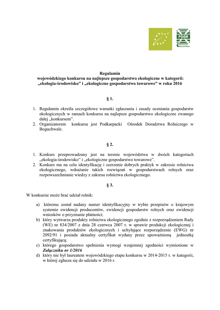 Regulamin wojewódzkiego konkursu na najlepsze gospodarstwo ekologiczne w kategorii: „ekologia-środowisko” i „ekologiczne gospodarstwo towarowe” w roku 2016 § 1. 1. Regulamin określa szczegółowe warunki zgłaszania i zasady oceniania gospodarstw ekologicznych w ramach konkursu na najlepsze gospodarstwo ekologiczne zwanego dalej „konkursem”. 2. Organizatorem konkursu jest Podkarpacki Ośrodek Doradztwa Rolniczego w Boguchwale. § 2. 1. Konkurs przeprowadzany jest na terenie województwa w dwóch kategoriach „ekologia-środowisko” i „ekologiczne gospodarstwo towarowe”. 2. Konkurs ma na celu identyfikację i szerzenie dobrych praktyk w zakresie rolnictwa ekologicznego, wdrażanie takich rozwiązań w gospodarstwach rolnych oraz rozpowszechnianie wiedzy z zakresu rolnictwa ekologicznego. § 3. W konkursie może brać udział rolnik: a) któremu został nadany numer identyfikacyjny w trybie przepisów o krajowym systemie ewidencji producentów, ewidencji gospodarstw rolnych oraz ewidencji wniosków o przyznanie płatności; b) który wytwarza produkty rolnictwa ekologicznego zgodnie z rozporządzeniem Rady (WE) nr 834/2007 z dnia 28 czerwca 2007 r. w sprawie produkcji ekologicznej i znakowania produktów ekologicznych i uchylające rozporządzenie (EWG) nr 2092/91 i posiada aktualny certyfikat wydany przez upoważnioną jednostkę certyfikującą; c) którego gospodarstwo spełnienia wymogi wzajemnej zgodności wymienione w Załączniku nr 1/2016 d) który nie był laureatem wojewódzkiego etapu konkursu w 2014-2015 r. w kategorii, w której zgłasza się do udziału w 2016 r. § 4. Rolnik może być zgłoszony do udziału w konkursie tylko w jednej kategorii, o których mowa w § 2 ust 1, z obszaru województwa podkarpackiego. 1. 2. 3. 4. § 5. Dyrektor Podkarpackiego Ośrodka Doradztwa Rolniczego w Boguchwale podaje do publicznej wiadomości na swojej stronie internetowej informację o możliwości zgłaszania do udziału w konkursie. Zgłoszenie do udziału w konkursie składa się w siedzibie Podkarpackiego Ośrodka Doradztwa Rolniczego do dnia 26 lipca 2016 r. Zgłoszenia dokonuje rolnik lub dowolna organizacja w jego imieniu i za jego zgodą, wyrażoną na piśmie. Zgłoszenia, które wpłyną po tym terminie nie będą rozpatrywane. § 7. 1. Zgłoszenie do udziału w konkursie składa się na formularzu określonym w Załączniku nr 2/2016 do niniejszego regulaminu. 2. Do zgłoszenia o udział w konkursie dołącza się kopię ważnego certyfikatu, określonego w art. 29 ust. 1 rozporządzenia Rady (WE) nr 834/2007 z dnia 28 czerwca 2007 r. w sprawie produkcji ekologicznej i znakowania produktów ekologicznych i uchylające rozporządzenie (EWG) nr 2092/91 i załączniku XII rozporządzeniu Komisji (WE) nr 889/2008 z 5 września 2008 r. ustanawiającym szczegółowe zasady wdrażania rozporządzenia Rady (WE) nr 834/2007 w sprawie produkcji ekologicznej i znakowania produktów ekologicznych w odniesieniu do produkcji ekologicznej, znakowania i kontroli. § 8. 1. Złożone zgłoszenia oceniane są pod względem formalnym. Zgłoszenia dotknięte brakami formalnymi, tj. złożone w niewłaściwej formie, niepełne lub niezawierające wymaganych załączników, pozostawione zostaną bez rozpatrzenia bez wzywania do uzupełnienia braków. Wyniki oceny formalnej zgłoszeń zawiera Raport z oceny formalnej stanowiący Załącznik nr 4/2016 do Regulaminu. 2. Dyrektor Ośrodka Doradztwa Rolniczego w Boguchwale lub wyznaczona przez niego osoba powołuje komisję konkursową, która ocenia poprawne formalnie zgłoszenia. 3. W ocenie o której mowa w ust. 2 zawiera się wizytacja wszystkich gospodarstw oraz ocena gospodarstw zgodnie z kryteriami określonymi w Załączniku nr 3/2016. 4. Po dokonaniu oceny komisja wyłania laureatów- po trzech w każdej kategorii. Laureatom obu kategorii przyznawane są miejsca od I-III. Wyniki oceny zawiera Protokół końcowy stanowiący Załącznik nr 5/2016 do Regulaminu. 5. Zwycięzca konkursu w danej kategorii zgłaszany jest przez wojewódzką komisję konkursową do konkursu krajowego. Zgłoszenie do etapu krajowego przekazuje się do Centrum Doradztwa Rolniczego Oddział w Radomiu. § 9. Organizatorzy konkursu nie zwracają materiałów nadesłanych na konkurs, zastrzegają sobie również prawo do ewentualnego ich wykorzystania w publikacjach promocyjnych oraz jako dokumentacja konkursu. § 10. Nadesłanie materiałów wymaganych przez zgłoszenie stanowi jednocześnie oświadczenie, iż nie naruszają one praw osób trzecich, w szczególności nie narusza ich majątkowych i osobistych praw autorskich. § 11. Organizatorzy nie zwracają kosztów przygotowania zgłoszenia. § 12. Nie ponoszą także odpowiedzialności za zaginięcie lub uszkodzenie nadesłanych pocztą materiałów dołączonych do zgłoszenia. § 13. Uczestnicy Konkursu wyrażają zgodę na przetwarzanie danych osobowych w rozumienia ustawy z dnia 29 sierpnia 1997 r. o ochronie danych osobowych (Dz. U. z 2002 r. Nr 101, poz. 926, z późn. zm.) przez organizatora w celach prowadzenia konkursu, wyłonienia laureatów i przyznania nagród. § 14. Zgłoszenie do konkursu jest równoznaczne z akceptacją Regulaminu konkursu. § 15. We wszystkich kwestiach spornych decyduje Komisja Konkursowa. § 16. Wszelkich dodatkowych informacji na temat Konkursu można uzyskać w PODR w Boguchwale i PZDR w każdym powiecie. Załącznik nr 1/2016 do Regulaminu Konkursu na najlepsze gospodarstwo ekologiczne 2016 Normy i wymogi wzajemnej zgodności 1. 2. Utrzymania gruntów, wchodzących w skład gospodarstwa, w dobrej kulturze rolnej zgodnie z ochroną środowiska określonych w Rozporządzeniu Ministra Rolnictwa i Rozwoju Wsi z dnia 9 marca 2015 w sprawie norm dobrej kultury rolnej zgodnej z ochroną środowiska (Dz.U. 2015r. poz. 344 z póź. zm.) Podstawowe wymogi w zakresie zarządzania, zawarte w obwieszczeniu Ministra Rolnictwa i Rozwoju Wsi z dnia 10 marca 2015 r. (M.P. z 20