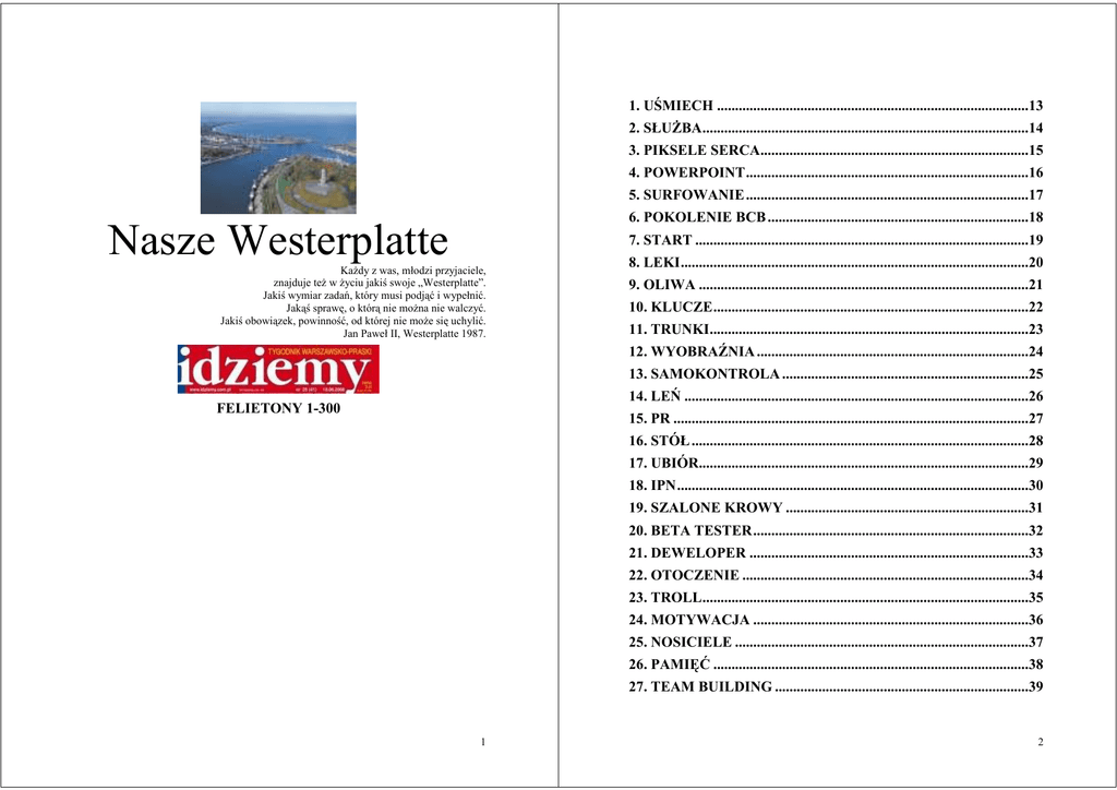 1. UŚMIECH ......................................................................................13 2. SŁUśBA..........................................................................................14 3. PIKSELE SERCA..........................................................................15 4. POWERPOINT..............................................................................16 5. SURFOWANIE ..............................................................................17 6. POKOLENIE BCB ........................................................................18 Nasze Westerplatte 7. START ............................................................................................19 KaŜdy z was, młodzi przyjaciele, znajduje teŜ w Ŝyciu jakiś swoje „Westerplatte”. Jakiś wymiar zadań, który musi podjąć i wypełnić. Jakąś sprawę, o którą nie moŜna nie walczyć. Jakiś obowiązek, powinność, od której nie moŜe się uchylić. Jan Paweł II, Westerplatte 1987. 8. LEKI................................................................................................20 9. OLIWA ...........................................................................................21 10. KLUCZE.......................................................................................22 11. TRUNKI........................................................................................23 12. WYOBRAŹNIA ...........................................................................24 13. SAMOKONTROLA ....................................................................25 14. LEŃ ...............................................................................................26 FELIETONY 1-300 15. PR ..................................................................................................27 16. STÓŁ .............................................................................................28 17. UBIÓR...........................................................................................29 18. IPN.................................................................................................30 19. SZALONE KROWY ...................................................................31 20. BETA TESTER............................................................................32 21. DEWELOPER .............................................................................33 22. OTOCZENIE ...............................................................................34 23. TROLL..........................................................................................35 24. MOTYWACJA ............................................................................36 25. NOSICIELE .................................................................................37 26. PAMIĘĆ .......................................................................................38 27. TEAM BUILDING ......................................................................39 1 2 28. DZIADOSTWO ...........................................................................40 56. WYBÓR ........................................................................................68 29. KOLANA ......................................................................................41 57. KAMERY .....................................................................................69 30. ZASILENIE..................................................................................42 58. STŁUCZONA SZYBA ................................................................70 31. PROJEKTY..................................................................................43 59. KIEPSKI INTERES ....................................................................71 32. ZWROTNICA ..............................................................................44 60. GIFTY I GIFCIKI .......................................................................72 33. SAMOBÓJ....................................................................................45 61. ZASIĘG ........................................................................................72 34. COACHING .................................................................................46 62. HI-END .........................................................................................73 35. LITERKI ......................................................................................47 63. POSTĘP ........................................................................................74 36. NETWORKING...........................................................................48 64. WEBSKI ŚWIAT.........................................................................75 37. KOTROLA ...................................................................................49 65. FUNDRISING ..............................................................................76 38. CELEBRITIES ............................................................................50 66. ADMIN..........................................................................................77 39. AWATAR .....................................................................................51 67. PENDRIVE...................................................................................78 40. ZAJĄC ..........................................................................................52 68. REKLAMA...................................................................................79 41. NAKŁAD ......................................................................................53 69. ZWYCZAJE.................................................................................80 42. EMOTIKONY..............................................................................54 70. TWARDY RESET .......................................................................81 43. PAŁECZKA ...........................................................
