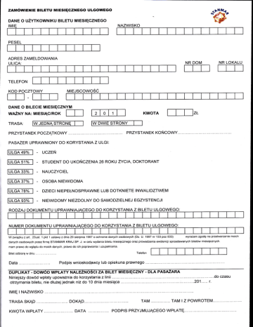 zAMÓruEillE BILETU MlEslĘGzNEGo ULGoWEGo DANE o UŹYTKoWNIKU BILETU MlEslĘcZNEGo *-§" §\fi NMW|sKo PEsEL ADRES ZAMELDOWANlA [T-n NR LoKALU NR DoM ULlCA: TELEFoN MIEJSCOWOŚĆ KOD POCZTOWY DANE o BlLEclE MlEslĘczNYM wAżNy NA: MlEslĄc/RoK 2 0 POCZĄTKOWY PRZYSTANEK KwoTA 1 lTllr. DWlE STRoNY STRo JE TRASA: [T-.l PRZYSTANEK KOŃCOWY. PASAZER UPRAWN|ONY DO KORYSTAN|A Z ULGI: lULGA4%l - uczEŃ 51%-l _ STUDENT Do uKoŃczENlA 26 RoKU zyclA, DoKToRANT |ULGA lm33%l lULGA 3?./.l luiGA i8% l luLGATaoz"l - NAuczyclEl oSoBA NlEwlDoMA DzlEcl NlEpEŁNoSpRAwNE LuB D9TKNIETE lNwALlDzTwEM NlEwlDoMy NlEzDoLNy Do sAMoDzlELNEJ EGzysTENcJl DO KORZYSTANIA Z BILETU ULGOWEGO: RODZAJ DOKUMENTU UPRAWN EGO DO KORZYSTAN|A Z BILETU ULGOWEGO NUMER DOKUMENTU UPRAWNI Wzwiązku z ań..23ust. 1 pkt 1 ustawyz dnia 29 sierpnia 1997 oochronie danych osobowych (Dz. U. 1997 nr 133 poz833) WlaŻam zgodę na przetwarzanie moich danych osobowych przez firmę STANMAR KRAJ sP. J. w celu wydania biletu miesięcznego oraz prowadzenia ewidencji sprzedawanych biletów miesięcznych. mam prawo do Wglądu do moich danych, prawo do ich poprawiania i uzupełniania. Bilet odbiorę w dniu Data .. . , .. .. , , .. ,.. .,. .. , ,. Telefon , .. Podpis wnioskodpwcy lub opiekuna prawnego ....., zA BILET MlEslĘczNY Niniejszy dowód wpłaty upoważnia do korzystania z linii otzymania biletu, nie dłuzej jednak niz do 10 dnia miesiąca _ DLA P ... ,., .do ---.....201..,., r. lMlĘ lNAZWlsKo... SKĄD KWoTAWPŁATY TRASA ..... DoKĄD ... DATA TAM... .. TAM lZ PoWRoTEM. ,,.... PoDPlsPRZYJMUJĄCEGoWPŁATĘ. czasu