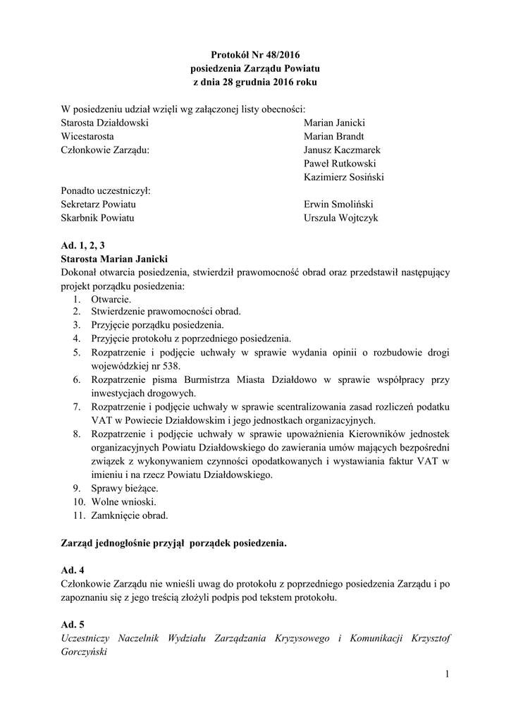 1 Protokół Nr 48/2016 posiedzenia Zarządu Powiatu z dnia 28
