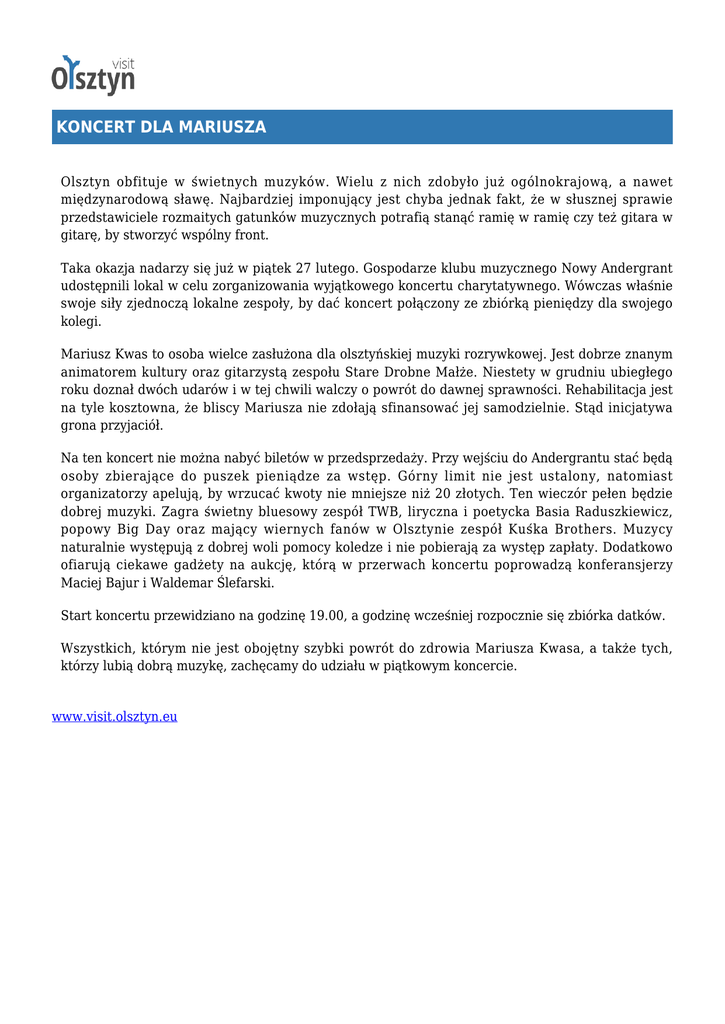 KONCERT DLA MARIUSZA Olsztyn obfituje w świetnych muzyków. Wielu z nich zdobyło już ogólnokrajową, a nawet międzynarodową sławę. Najbardziej imponujący jest chyba jednak fakt, że w słusznej sprawie przedstawiciele rozmaitych gatunków muzycznych potrafią stanąć ramię w ramię czy też gitara w gitarę, by stworzyć wspólny front. Taka okazja nadarzy się już w piątek 27 lutego. Gospodarze klubu muzycznego Nowy Andergrant udostępnili lokal w celu zorganizowania wyjątkowego koncertu charytatywnego. Wówczas właśnie swoje siły zjednoczą lokalne zespoły, by dać koncert połączony ze zbiórką pieniędzy dla swojego kolegi. Mariusz Kwas to osoba wielce zasłużona dla olsztyńskiej muzyki rozrywkowej. Jest dobrze znanym animatorem kultury oraz gitarzystą zespołu Stare Drobne Małże. Niestety w grudniu ubiegłego roku doznał dwóch udarów i w tej chwili walczy o powrót do dawnej sprawności. Rehabilitacja jest na tyle kosztowna, że bliscy Mariusza nie zdołają sfinansować jej samodzielnie. Stąd inicjatywa grona przyjaciół. Na ten koncert nie można nabyć biletów w przedsprzedaży. Przy wejściu do Andergrantu stać będą osoby zbierające do puszek pieniądze za wstęp. Górny limit nie jest ustalony, natomiast organizatorzy apelują, by wrzucać kwoty nie mniejsze niż 20 złotych. Ten wieczór pełen będzie dobrej muzyki. Zagra świetny bluesowy zespół TWB, liryczna i poetycka Basia Raduszkiewicz, popowy Big Day oraz mający wiernych fanów w Olsztynie zespół Kuśka Brothers. Muzycy naturalnie występują z dobrej woli pomocy koledze i nie pobierają za występ zapłaty. Dodatkowo ofiarują ciekawe gadżety na aukcję, którą w przerwach koncertu poprowadzą konferansjerzy Maciej Bajur i Waldemar Ślefarski. Start koncertu przewidziano na godzinę 19.00, a godzinę wcześniej rozpocznie się zbiórka datków. Wszystkich, którym nie jest obojętny szybki powrót do zdrowia Mariusza Kwasa, a także tych, którzy lubią dobrą muzykę, zachęcamy do udziału w piątkowym koncercie. www.visit.olsztyn.eu