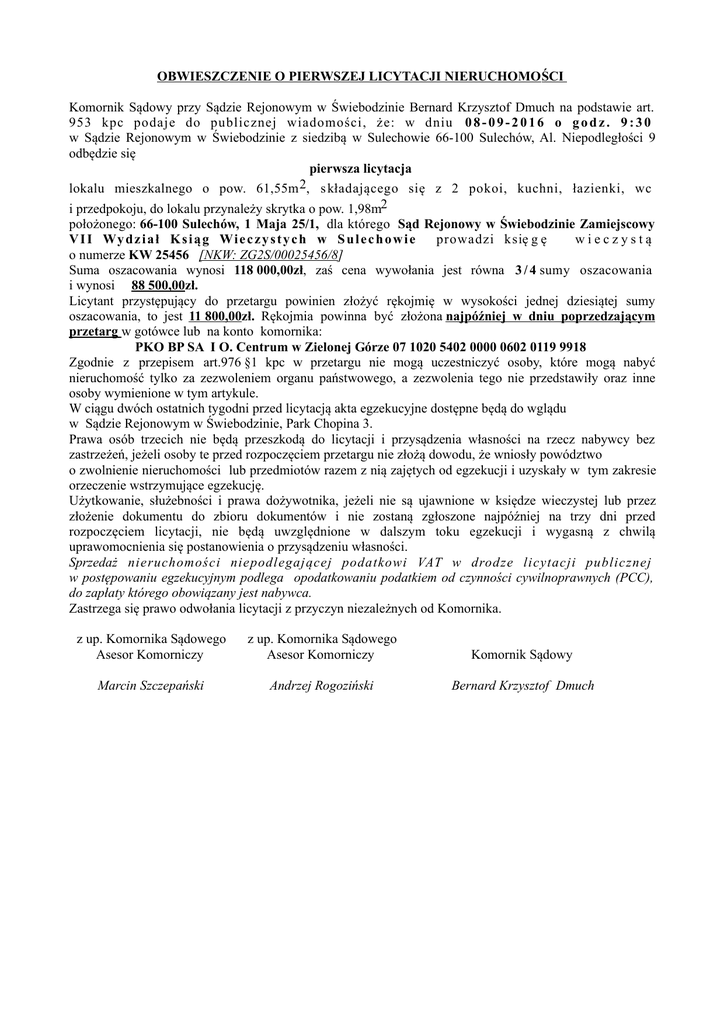 OBWIESZCZENIE O PIERWSZEJ LICYTACJI NIERUCHOMOŚCI Komornik Sądowy przy Sądzie Rejonowym w Świebodzinie Bernard Krzysztof Dmuch na podstawie art. 953 kpc podaje do publicznej wiadomości, że: w dniu 0 8 - 0 9 - 2 0 1 6 o g o d z . 9 : 3 0 w Sądzie Rejonowym w Świebodzinie z siedzibą w Sulechowie 66-100 Sulechów, Al. Niepodległości 9 odbędzie się pierwsza licytacja 2 lokalu mieszkalnego o pow. 61,55m , s kładającego się z 2 pokoi, kuchni, łazienki, wc i przedpokoju, do lokalu przynależy skrytka o pow. 1,98m2 położonego: 66-100 Sulechów, 1 Maja 25/1, dla którego Sąd Rejonowy w Świebodzinie Zamiejscowy V I I Wy d z i a ł K s i ą g Wi e c z y s t y c h w S u l e c h o w i e prowadzi księ g ę wieczystą o numerze KW 25456 [NKW: ZG2S/00025456/8] Suma oszacowania wynosi 118 000,00zł, zaś cena wywołania jest równa 3 / 4 sumy oszacowania i wynosi 88 500,00zł. Licytant przystępujący do przetargu powinien złożyć rękojmię w wysokości jednej dziesiątej sumy oszacowania, to jest 11 800,00zł. Rękojmia powinna być złożona najpóźniej w dniu poprzedzającym przetarg w gotówce lub na konto komornika: PKO BP SA I O. Centrum w Zielonej Górze 07 1020 5402 0000 0602 0119 9918 Zgodnie z przepisem art.976 §1 kpc w przetargu nie mogą uczestniczyć osoby, które mogą nabyć nieruchomość tylko za zezwoleniem organu państwowego, a zezwolenia tego nie przedstawiły oraz inne osoby wymienione w tym artykule. W ciągu dwóch ostatnich tygodni przed licytacją akta egzekucyjne dostępne będą do wglądu w Sądzie Rejonowym w Świebodzinie, Park Chopina 3. Prawa osób trzecich nie będą przeszkodą do licytacji i przysądzenia własności na rzecz nabywcy bez zastrzeżeń, jeżeli osoby te przed rozpoczęciem przetargu nie złożą dowodu, że wniosły powództwo o zwolnienie nieruchomości lub przedmiotów razem z nią zajętych od egzekucji i uzyskały w tym zakresie orzeczenie wstrzymujące egzekucję. Użytkowanie, służebności i prawa dożywotnika, jeżeli nie są ujawnione w księdze wieczystej lub przez złożenie dokumentu do zbioru dokumentów i nie zostaną zgłoszone najpóźniej na trzy dni przed rozpoczęciem licytacji, nie będą uwzględnione w dalszym toku egzekucji i wygasną z chwilą uprawomocnienia się postanowienia o przysądzeniu własności. Sprzedaż nieruchomości niepodlegającej podatkowi VAT w drodze licytacji publicznej w postępowaniu egzekucyjnym podlega opodatkowaniu podatkiem od czynności cywilnoprawnych (PCC), do zapłaty którego obowiązany jest nabywca. Zastrzega się prawo odwołania licytacji z przyczyn niezależnych od Komornika. z up. Komornika Sądowego Asesor Komorniczy z up. Komornika Sądowego Asesor Komorniczy Komornik Sądowy Marcin Szczepański Andrzej Rogoziński Bernard Krzysztof Dmuch OBWIESZCZENIE O PIERWSZEJ LICYTACJI NIERUCHOMOŚCI Komornik Sądowy przy Sądzie Rejonowym w Świebodzinie Bernard Krzysztof Dmuch na podstawie art. 953 kpc podaje do publicznej wiadomości, że w dniu 08-09-2016r. o godz. 09:50 w Sądzie Rejonowym w Świebodzinie, w budynku z siedzibą w Sulechowie, Al. Niepodległości 9, odbędzie się pierwsza licytacja spółdzielczego własnościowego prawa do lokalu mieszkalnego o pow. 47,8m2, składającego się z trzech pokoi, kuchni, łazienki z ubikacją i przedpokoju, usytuowanego na II piętrze, położonego: 66-210 Zbąszynek, ul. Wojska Polskiego 47/5, wpisanego w rejestrze lokali własnościowych: Spółdzielnia Mieszkaniowa "Kolejarz" LokatorskoWłasnościowa (Adres spółdzielni: 66-210 Zbąszynek, ul. Topolowa 24 ), dla którego Sąd Rejonowy w Świebodzinie Wydział Ksiąg Wieczystych prowadzi księgę wieczystą o numerze KW 46392 [NKW: ZG1S/00046392/7] Suma oszacowania wynosi 86 200,00zł, cena wywołania jest równa 3 / 4 sumy oszacowania i wynosi 64 650,00zł. Licytant przystępujący do przetargu powinien złożyć rękojmię w wysokości jednej dziesiątej sumy oszacowania, to jest 8 620,00zł. Rękojmia powinna być złożona najpóźniej w dniu poprzedzającym przetarg w gotówce lub na konto komornika: PKO Bank Polski SA I O. w Zielonej Górze 07 1020 5402 0000 0602 0119 9918 Zgodnie z przepisem art.976 §1 kpc w przetargu nie mogą uczestniczyć osoby, które mogą nabyć nieruchomość tylko za zezwoleniem organu państwowego, a zezwolenia tego nie przedstawiły oraz inne osoby wymienione w tym artykule. W ciągu dwóch ostatnich tygodni przed licytacją akta egzekucyjne dostępne będą do wglądu w Sądzie Rejonowym w Świebodzinie, Park Chopina 3. Prawa osób trzecich nie będą przeszkodą do licytacji i przysądzenia własności na rzecz nabywcy bez zastrzeżeń, jeżeli osoby te przed rozpoczęciem przetargu nie złożą dowodu, że wniosły powództwo o zwolnienie nieruchomości lub przedmiotów razem z nią zajętych od egzekucji i uzyskały w tym zakresie orzeczenie wstrzymujące egzekucję. Użytkowanie, służebności i prawa dożywotnika, jeżeli nie są ujawnione w księdze wieczystej lub przez złożenie dokumentu do zbioru dokumentów i nie zostaną zgłoszone najpóźniej na trzy dni przed rozpoczęciem licytacji, nie będą uwzględnione w dalszym toku egzekucji i wygasną z chwilą uprawomocnienia się postanowienia o przysądzeniu własności. Sprzedaż nieruchomości niepodlegającej podatkowi VAT w drodze licytacji publicznej w postępowaniu egzekucyjnym podlega opodatkowaniu podatkiem od czynności cywilnoprawnych (PCC), do zapłaty którego obowiązany jest nabywca. Zastrzega się prawo odwołania licytacji z przyczyn niezależnych od Komornika. Komornik Sądowy Bernard Krzysztof Dmuch OBWIESZCZENIE O DRUGIEJ LICYTACJI NIERUCHOMOŚCI nr KW 20747 Komornik Sądowy przy Sądzie Rejonowym w Świebodzinie Bernard Krzysztof Dmuch na podstawie art. 953 kpc podaje do publicznej wiadomości, że w dniu 08-09-2016r. o godz. 10:10 w Sądzie Rejonowym w Świebodzinie, w budynku z siedzibą w Sulechowie, Al. Niepodległości 9, odbędzie się druga licytac