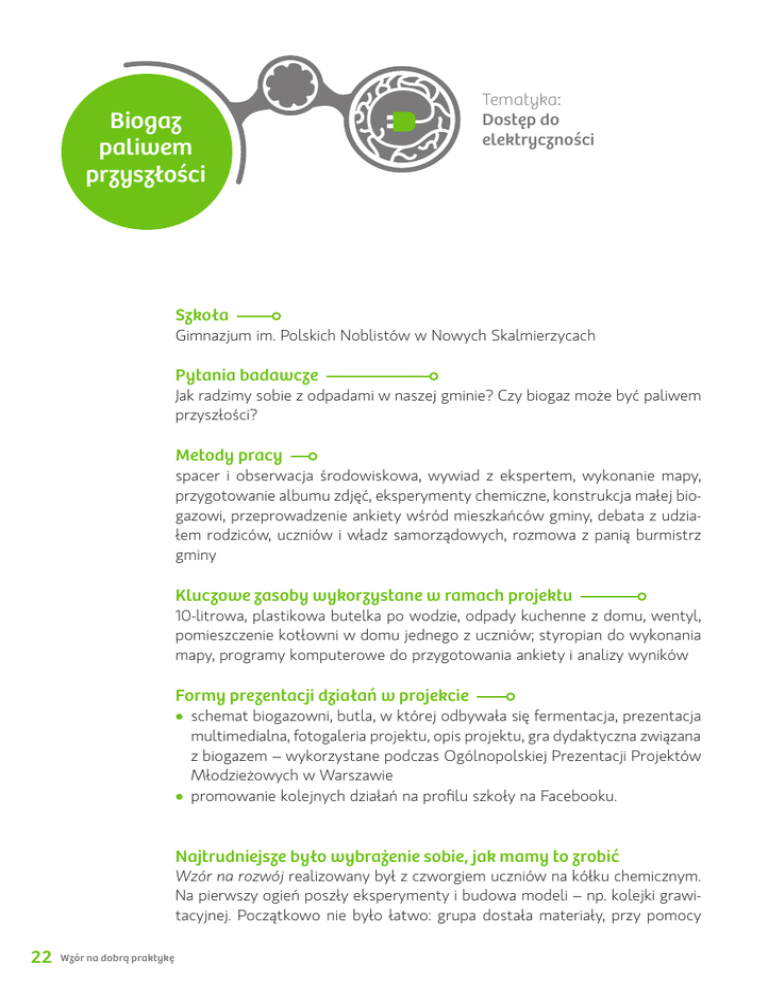 Biogaz paliwem przyszłości Tematyka: Dostęp do elektryczności Szkoła Gimnazjum im. Polskich Noblistów w Nowych Skalmierzycach Pytania badawcze Jak radzimy sobie z odpadami w naszej gminie? Czy biogaz może być paliwem przyszłości? Metody pracy spacer i obserwacja środowiskowa, wywiad z ekspertem, wykonanie mapy, przygotowanie albumu zdjęć, eksperymenty chemiczne, konstrukcja małej biogazowi, przeprowadzenie ankiety wśród mieszkańców gminy, debata z udziałem rodziców, uczniów i władz samorządowych, rozmowa z panią burmistrz gminy Kluczowe zasoby wykorzystane w ramach projektu 10-litrowa, plastikowa butelka po wodzie, odpady kuchenne z domu, wentyl, pomieszczenie kotłowni w domu jednego z uczniów; styropian do wykonania mapy, programy komputerowe do przygotowania ankiety i analizy wyników Formy prezentacji działań w projekcie • schemat biogazowni, butla, w której odbywała się fermentacja, prezentacja multimedialna, fotogaleria projektu, opis projektu, gra dydaktyczna związana z biogazem – wykorzystane podczas Ogólnopolskiej Prezentacji Projektów Młodzieżowych w Warszawie • promowanie kolejnych działań na profilu szkoły na Facebooku. Najtrudniejsze było wybrażenie sobie, jak mamy to zrobić Wzór na rozwój realizowany był z czworgiem uczniów na kółku chemicznym. Na pierwszy ogień poszły eksperymenty i budowa modeli – np. kolejki grawitacyjnej. Początkowo nie było łatwo: grupa dostała materiały, przy pomocy 22 Wzór na dobrą praktykę których miała sama wymyślić i zbudować urządzenie, które przetransportuje „pomidory” z góry na dół. Jak relacjonował prowadzący projekt nauczyciel: „Na początku nie wiedzieli, jak się do tego zabrać, nie mieli wizji i widać było ich obawy. Ale wystarczyło właściwie, że podpowiedziałem, aby korzystali z praw fizyki, prawa grawitacji itd. Wyjaśniłem też, że nie muszą wykorzystywać wszystkich materiałów. I udało się, kolejka zadziałała!”. Po eksperymencie zespół podzielił się wrażeniami na stronie projektu na Facebooku, którą rzetelnie prowadził przez cały czas. Jedna z uczennic napisała: „Moim zdaniem najtrudniejsze było wyobrażenie sobie, jak mamy to zrobić. Nie mieliśmy żadnego pomysłu, mimo że było dużo rzeczy do dyspozycji. O ile się nie mylę, więcej czasu poświęciliśmy na myślenie niż na zbudowanie kolejki”. A inna dodała: „Najbardziej podobało mi się to, że współpracowaliśmy i mieliśmy przy tym mnóstwo zabawy, a wydaje mi się, że i efekt końcowy wyszedł nieźle.” Pomysł, który wykorzystuje najpopularniejszy w tej grupie młodzieży kanał, by informować o przebiegu projektu rówieśników. Nauczyciel Marcin Śrama dodał, że podczas projektu młodzież oglądała filmy pokazujące, jak z podobnymi wyzwaniami radzą sobie w życiu mieszkańcy krajów Południa, np. Nepalu czy Bangladeszu. Stwierdził, że po projekcji „uczniowie z większą śmiałością podchodzili do eksperymentowania; to ich zainspirowało.” „Cieszę się, że mogłem przeprowadzić własne doświadczenie. Formułowałem swoje obserwacje i wnioski i, co najważniejsze – były one prawidłowe.” – podsumował jeden z członków zespołu. O rety, ile śmieci! Podczas pracy nad eksperymentami pojawił się pomysł na główny temat projektu – wypłynął on od samych uczniów. Część z nich, dojeżdżając do szkoły rowerami, zauważyła po drodze dzikie wysypiska śmieci. Przejęci zaśmiecaniem otoczenia zastanawiali się, jak włączyć ten problem do projektu. Okazało się, że odpady mogą być wykorzystywane do pozyskiwania biogazu (jak robią to społeczności ze Sri Lanki i Bangladeszu, które młodzież poznała dzięki filmom). Zaciekawiło to młodych chemików i chemiczki i grupa postanowiła w praktyce sprawdzić „czy to prawda z tym gazem” i czy uda jej się wyprodukować biogaz. Projekt uczniowski daje szansę, by interweniować w sprawie istotnej lokalnie i uczy młodzież, jakimi narzędziami dysponujemy, by reagować. A gdyby tak... to zrobić?! Internet dostarczył pomysłów, jak to wykonać w praktyce. Duża, plastikowa butla po wodzie została wypełniona odpadkami kuchennymi i pozostawiona w ciepłym pomieszczeniu kotłowni w domu jednego z uczestników. Młodzież prowadziła obserwacje: spotykała się, by sprawdzać, co dzieje się w butli, fotografować i filmować wszystkie etapy – przygotowanie i przebieg eksperymentu, a swoje zdjęcia i filmy zamieszczała na profilu projektu na Facebooku. Po kilku dniach pojawił się tam wpis: „Chcielibyśmy tylko poinformować, iż w naszej biogazowni wytworzył się gaz. Odór był wręcz przerażający. Wszyscy uciekaliśmy. Musimy jeszcze tylko załatwić dętkę i nasza biogazownia będzie gotowa”. Na końcu butla została otwarta w szkole w asyście nauczyciela. 23 To ważne, by przy tego typu projektach, zapewnić młodym odkrywcom i odkrywczyniom pełne bezpieczeństwo. Działanie to było okazją dla lepszego zrozumienia pracy, którą wykonują konkretne osoby na rzecz lokalnej społeczności. Syknęło! A więc gaz się pojawił! Niestety, nie zapalił się – pewnie było go jednak trochę za mało... Ale wyobraźnia została rozbudzona! Ileż to gazu da się wyprodukować na dużym wysypisku śmieci… Śmieci to poważna sprawa Temat odpadów był drążony głębiej. Grupa odbyła wycieczkę na legalne wysypisko, gdzie spotkała się z pracownikiem, który opowiedział o jego funkcjonowaniu. „Nie wiedziałam, że praca na wysypisku jest tak odpowiedzialna. Myślałam, że zawożą tam śmieci i na tym się kończy” – podsumowała spotkanie jedna z uczennic. Grupa przygotowała też prezentację na temat różnorodnych odpadów, związanych z nimi zagrożeń oraz ich segregacji i możliwych sposobów utylizacji. „Trzeba przekonać bardzo wielu ludzi, że ten, kto wyrzuca w lesie butelkę czy zużyte opakowanie, sobie wystaw