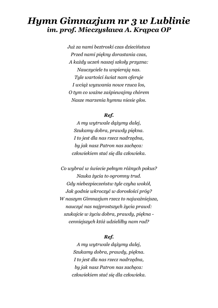 Hymn Gimnazjum nr 3 w Lublinie im. prof. Mieczysława A. Krąpca OP Już za nami beztroski czas dzieciństwa Przed nami piękny dorastania czas, A każdy uczeń naszej szkoły przyzna: Nauczyciele tu wspierają nas. Tyle wartości świat nam oferuje I wciąż wyzwania nowe rzuca los, O tym co ważne zaśpiewajmy chórem Nasze marzenia hymnu niesie głos. Ref. A my wytrwale dążymy dalej, Szukamy dobra, prawdy piękna. I to jest dla nas rzecz nadrzędna, by jak nasz Patron nas zachęca: człowiekiem stać się dla człowieka. Co wybrać w świecie pełnym różnych pokus? Nauka życia to ogromny trud. Gdy niebezpieczeństw tyle czyha wokół, Jak godnie wkroczyć w dorosłości próg? W naszym Gimnazjum rzecz to najważniejsza, nauczyć nas najprostszych życia prawd: szukajcie w życiu dobra, prawdy, piękna cenniejszych któż udzieliłby nam rad? Ref. A my wytrwale dążymy dalej, Szukamy dobra, prawdy, piękna. I to jest dla nas rzecz nadrzędna, by jak nasz Patron nas zachęca: człowiekiem stać się dla człowieka. p. Anna Widerska MUZYKA: p. Michał Jankowski SŁOWA: (hymn powstał w r. szk. 2012/ 2013)