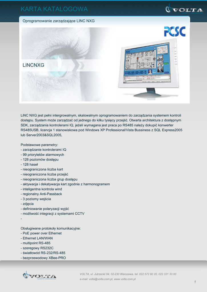 KARTA KATALOGOWA Oprogramowanie zarządzające LINC NXG LINCNXG LiNC NXG jest pełni intergrowalnym, skalowalnym oprogramowaniem do zarządzania systemem kontroli dostępu. System może zarządzać od jednego do kilku tysięcy przejść. Otwarta architektura z dostępnym SDK, zarządzania kontrolerami IQ, jeżeli wymagana jest praca po RS485 należy dokupić konwerter RS485USB, licencja 1 stanowiskowa pod Windows XP Professional/Vista Bussiness z SQL Express2005 lub Server2003&SQL2005, Podstawowe parametry: - zarządzanie kontrolerami IQ - 99 priorytetów alarmowych - 128 poziomów dostępu - 128 haseł - nieograniczona liczba kart - nieograniczona liczba przejść - nieograniczona liczba grup dostępu - aktywacja i dekatywacja kart zgodnie z harmonogramem - inteligentna kontrola wind - regionalny Anti-Passback - 3 poziomy wejścia - zdjęcia - definiowanie polaryzacji wyjść - możliwość integracji z systemami CCTV Obsługiwane protokoły komunikacyjne: - PoE power over Ethernet - Ethernet LAN/WAN - multipoint RS-485 - szeregowy RS232C - światłowód RS-232/RS-485 - bezprzewodowy XBee-PRO Parametry techniczne VOLTA, ul. Jutrzenki 94, 02-230 Warszawa, tel. 022 572 90 20, 022 331 33 00 e-mail: [email protected], www.volta.com.pl 1