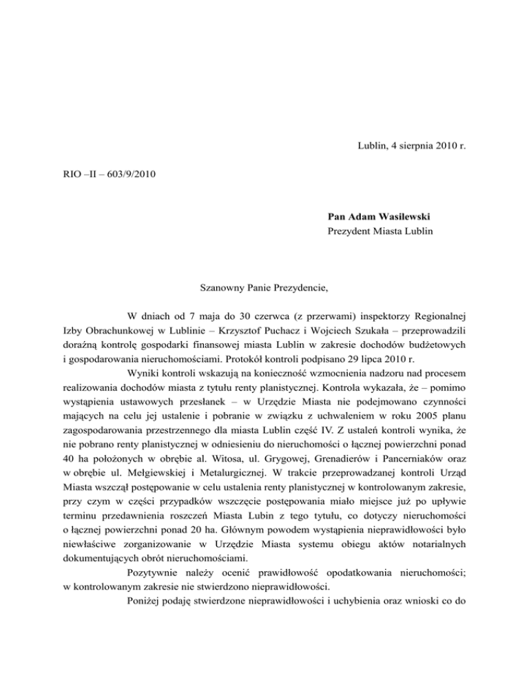 Lublin, 4 sierpnia 2010 r. RIO –II – 603/9/2010 Pan Adam Wasilewski Prezydent Miasta Lublin Szanowny Panie Prezydencie, W dniach od 7 maja do 30 czerwca (z przerwami) inspektorzy Regionalnej Izby Obrachunkowej w Lublinie – Krzysztof Puchacz i Wojciech Szukała – przeprowadzili doraźną kontrolę gospodarki finansowej miasta Lublin w zakresie dochodów budżetowych i gospodarowania nieruchomościami. Protokół kontroli podpisano 29 lipca 2010 r. Wyniki kontroli wskazują na konieczność wzmocnienia nadzoru nad procesem realizowania dochodów miasta z tytułu renty planistycznej. Kontrola wykazała, że – pomimo wystąpienia ustawowych przesłanek – w Urzędzie Miasta nie podejmowano czynności mających na celu jej ustalenie i pobranie w związku z uchwaleniem w roku 2005 planu zagospodarowania przestrzennego dla miasta Lublin część IV. Z ustaleń kontroli wynika, że nie pobrano renty planistycznej w odniesieniu do nieruchomości o łącznej powierzchni ponad 40 ha położonych w obrębie al. Witosa, ul. Grygowej, Grenadierów i Pancerniaków oraz w obrębie ul. Mełgiewskiej i Metalurgicznej. W trakcie przeprowadzanej kontroli Urząd Miasta wszczął postępowanie w celu ustalenia renty planistycznej w kontrolowanym zakresie, przy czym w części przypadków wszczęcie postępowania miało miejsce już po upływie terminu przedawnienia roszczeń Miasta Lubin z tego tytułu, co dotyczy nieruchomości o łącznej powierzchni ponad 20 ha. Głównym powodem wystąpienia nieprawidłowości było niewłaściwe zorganizowanie w Urzędzie Miasta systemu obiegu aktów notarialnych dokumentujących obrót nieruchomościami. Pozytywnie należy ocenić prawidłowość opodatkowania nieruchomości; w kontrolowanym zakresie nie stwierdzono nieprawidłowości. Poniżej podaję stwierdzone nieprawidłowości i uchybienia oraz wnioski co do 2 sposobu ich wyeliminowania, stosownie do przepisów art. 9 ust. 2 ustawy z dnia 7 października 1992 r. o regionalnych izbach obrachunkowych (Dz. U. z 2001 r. Nr 55, poz. 577 z późn. zm.). W załączniku do wystąpienia pokontrolnego wskazuję osoby odpowiedzialne za stwierdzone nieprawidłowości. 1. Niepodejmowanie czynności mających na celu ustalenie i pobranie opłat, o których mowa w przepisach art. 36 ust. 4 ustawy o planowaniu i zagospodarowaniu przestrzennym (tzw. renty planistycznej) w odniesieniu do objętych kontrolą nieruchomości o łącznej powierzchni 401.179 m2. w związku z wejściem w życie uchwały Rady Miasta Nr 628/XXIX/2005 z dnia 17 marca 2005 r. w sprawie uchwalenia miejscowego planu zagospodarowania przestrzennego miasta Lublin – część IV, w sytuacji gdy: - wystąpiły przypadki zbywania nieruchomości objętych planem miejscowym w okresie 5 lat od dnia, w którym plan ten stał się obowiązujący; - Rada Miasta przyjęła stawkę renty planistycznej na poziomie 30% różnicy pomiędzy wartością nieruchomości przed wejściem w życie planu miejscowego oraz wartości nieruchomości po wejściu w życie tego planu. W trakcie kontroli Urząd Miasta wszczął postępowanie w odniesieniu do kontrolowanych nieruchomości, jednak w części przypadków miało to miejsce już po upływie pięcioletniego terminu przedawnienia roszczeń miasta Lublina z tytułu renty planistycznej (w odniesieniu do nieruchomości o łącznej powierzchni 209.629 m2). Głównym powodem wystąpienia nieprawidłowości było niewłaściwe zorganizowanie w Urzędzie Miasta systemu obiegu aktów notarialnych dokumentujących obrót nieruchomościami (nie wszystkie akty notarialne, na podstawie których należało wszcząć postępowania w celu ustalenia wysokości renty planistycznej, trafiły do komórki odpowiedzialnej za wszczynanie takich postępowań). W sytuacji gdy z aktów notarialnych otrzymywanych od notariuszy wynika, że występują przypadki zbywania nieruchomości na obszarze objętym nowym lub zmienionym planem zagospodarowania przestrzennego w okresie 5 lat od dnia, w którym miejscowy plan zagospodarowania przestrzennego lub jego zmiana stały się obowiązujące – podejmować działania mające na celu ustalenie, czy w związku z uchwaleniem planu miejscowego albo jego zmianą wartość sprzedawanej nieruchomości wzrosła, stosownie do przepisów art. 36 ust. 4 ustawy z dnia 27 marca 2003 r. o planowaniu i zagospodarowaniu przestrzennym (Dz. U. z 2003 r. Nr 80, poz. 717 z późn. zm.). W przypadku stwierdzenia, że wartość zbytej nieruchomości wzrosła, ustalać – w drodze decyzji – opłatę wynikającą z planu, określoną w stosunku 3 procentowym do wzrostu wartości nieruchomości i ustaloną na dzień sprzedaży nieruchomości, mając na uwadze fakt, że opłata ta jest dochodem własnym gminy, zgodnie z przepisami art. 36 ust. 4, art. 37 ust. 1 i art. 37 ust. 6 powołanej ustawy. Wprowadzić procedury wewnętrzne regulujące proces obiegu aktów notarialnych w sposób pozwalający na wszczynanie postępowań mających na celu ustalenie renty planistycznej, w sytuacji gdy występują przesłanki jej ustalenia, mając na uwadze przepisy art. 68 w związku z art. 69 ust. 1 pkt. 3 ustawy z dnia 27 sierpnia 2009 r. o finansach publicznych (Dz. U. Nr 157, poz. 2140 z późn. zm.), stosownie do których kierownik jednostki jest odpowiedzialny za zapewnienie funkcjonowania adekwatnej, skutecznej i efektywnej kontroli zarządczej, rozumianej jako ogół działań podejmowanych dla zapewnienia realizacji celów i zadań w sposób zgodny z prawem, efektywny, oszczędny i terminowy, a jej celem jest między innymi zapewnienie zgodności działalności jednostki z przepisami prawa, skuteczności i efektywności działania oraz efektywności i skuteczności przepływu informacji. – str. 1 - 12 protokołu. 2. Nieinformowanie Rady Miasta co najmniej w latach 2008 – 2009 o wydanych decyzjach w sprawie ustalenia opłat, o których mowa w przepisach art. 36 ust. 4 ustawy o planowaniu i zagospodarowaniu przestrzennym (ren