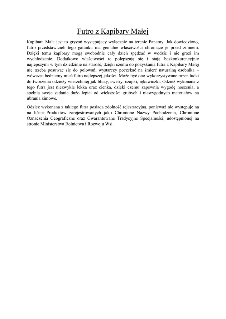 Futro z Kapibary Małej Kapibara Mała jest to gryzoń występujący wyłącznie na terenie Panamy. Jak dowiedziono, futro przedstawicieli tego gatunku ma genialne właściwości chroniące je przed zimnem. Dzięki temu kapibary mogą swobodnie cały dzień spędzać w wodzie i nie grozi im wychłodzenie. Dodatkowo właściwości te polepszają się i stają bezkonkurencyjnie najlepszymi w tym dziedzinie na starość, dzięki czemu do pozyskania futra z Kapibary Małej nie trzeba posuwać się do polowań, wystarczy poczekać na śmierć naturalną osobnika – wówczas będziemy mieć futro najlepszej jakości. Może być ono wykorzystywane przez ludzi do tworzenia odzieży wierzchniej jak bluzy, swetry, czapki, rękawiczki. Odzież wykonana z tego futra jest niezwykle lekka oraz cienka, dzięki czemu zapewnia wygodę noszenia, a spełnia swoje zadanie dużo lepiej od większości grubych i niewygodnych materiałów na ubrania zimowe. Odzież wykonana z takiego futra posiada zdolność rejestracyjną, ponieważ nie występuje na na liście Produktów zarejestrowanych jako Chronione Nazwy Pochodzenia, Chronione Oznaczenia Geograficzne oraz Gwarantowane Tradycyjne Specjalności, udostępnionej na stronie Ministerstwa Rolnictwa i Rozwoju Wsi.
