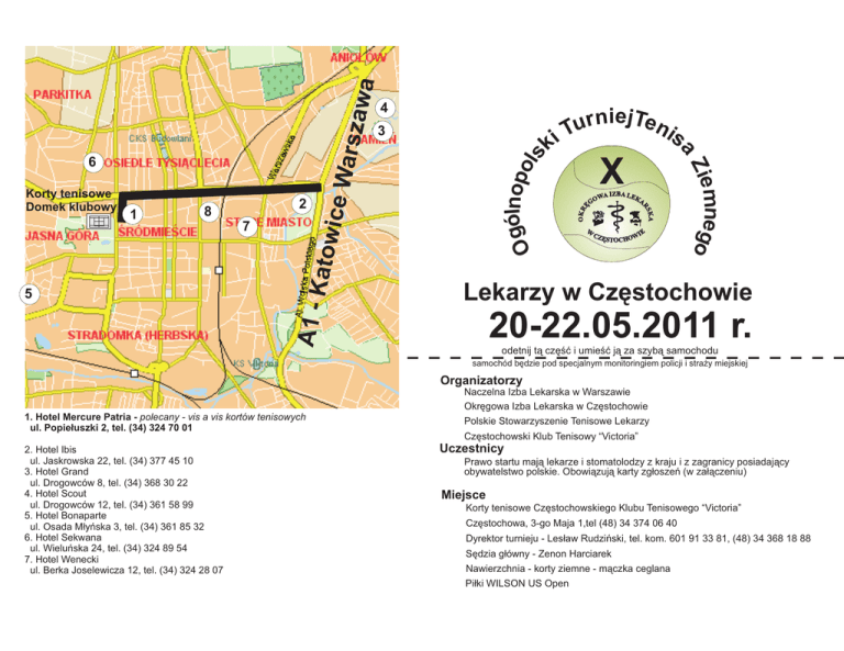 OK R óln Og opols k wa atow ice W arsza A1 - K W IE CZ Ê STOC HOW mnego 5 7 Zie 2 8 X A IZBA LEK OW A ÊG KA 1 niejTen r u is iT RS Korty tenisowe Domek klubowy 3 a 6 4 Lekarzy w Czêstochowie 20-22.05.2011 r. odetnij t¹ czêœæ i umieœæ j¹ za szyb¹ samochodu samochód bêdzie pod specjalnym monitoringiem policji i stra¿y miejskiej Organizatorzy Naczelna Izba Lekarska w Warszawie Okrêgowa Izba Lekarska w Czêstochowie 1. Hotel Mercure Patria - polecany - vis a vis kortów tenisowych ul. Popie³uszki 2, tel. (34) 324 70 01 2. Hotel Ibis ul. Jaskrowska 22, tel. (34) 377 45 10 3. Hotel Grand ul. Drogowców 8, tel. (34) 368 30 22 4. Hotel Scout ul. Drogowców 12, tel. (34) 361 58 99 5. Hotel Bonaparte ul. Osada M³yñska 3, tel. (34) 361 85 32 6. Hotel Sekwana ul. Wieluñska 24, tel. (34) 324 89 54 7. Hotel Wenecki ul. Berka Joselewicza 12, tel. (34) 324 28 07 Polskie Stowarzyszenie Tenisowe Lekarzy Czêstochowski Klub Tenisowy “Victoria” Uczestnicy Prawo startu maj¹ lekarze i stomatolodzy z kraju i z zagranicy posiadaj¹cy obywatelstwo polskie. Obowi¹zuj¹ karty zg³oszeñ (w za³¹czeniu) Miejsce Korty tenisowe Czêstochowskiego Klubu Tenisowego “Victoria” Czêstochowa, 3-go Maja 1,tel (48) 34 374 06 40 Dyrektor turnieju - Les³aw Rudziñski, tel. kom. 601 91 33 81, (48) 34 368 18 88 Sêdzia g³ówny - Zenon Harciarek Nawierzchnia - korty ziemne - m¹czka ceglana Pi³ki WILSON US Open 100 z³ Cz³onkowie Polskiego Stowarzyszenia Tenisowego Lekarzy 150 z³ Lekarze nie zrzeszeni w PSTL Prosimy o wp³aty na konto do 30.04.2011 r. OIL w Czêstochowie, ul. gen. J. Zajaczka 5 Bank: BRE Bank S.A. Oddzia³ Czêstochowa numer konta: 82 1140 1889 0000 2433 3300 1001 Tytu³em: “Tenis 2011” UWAGA: Rozlosowane bêd¹ tylko osoby, które wp³ac¹ wpisowe do 30.04.2011 r. 19 maja 2011 r. (czwartek) 20.00 - losowanie gier Domek klubowy CzKT “Victoria” rozstawieni zostan¹ gracze wg aktualnej listy kwalifikacyjnej Polskiego Stowarzyszenia Tenisowego Lekarzy 20 maja 2011 r. (piatek) 9.00 - mecze turniejowe Gra pojedyñcza: - PANIE do 45 lat i powyzej 45 lat - PANOWIE do 35 lat, 35+, 40+, 45+, 50+, 55+, 60+, 65+, 70+ Gra podwójna: - PANIE jedna kategoria - PANOWIE do 45 lat, 45+, 55+, 65+ 21 maja 2011 r. (sobota) 9.00 - mecze turniejowe 20.00 - bankiet - Klub Lekarza OIL w Czêstochowie ul. gen. Zaj¹czka 5 22 maja 2011 r. (niedziela) 9.00 - fina³y 15.00 - uroczyste zakoñczenie turnieju Internet: http://www.oil.czest.pl, http://www.oilczestochowa.pl w dziale Nasze cykliczne imprezy aktualne komunikaty Les³aw Rudziñski tel. kom. 601 91 33 81 Rita Idziak tel. kom. 692 39 75 18 e-mail: [email protected] REGULAMIN TURNIEJU na adres: Komisja Sportu i Rekreacji OIL w Czêstochowie 42-200 Czêstochowa ul .gen. J. Zajaczka 5 tel. (34) 368 18 88 - Rita Idziak tel. kom 601 91 33 81 - Les³aw Rudziñski fax +48 34 365 41 20 e-mail [email protected] 1. Turniej rozegrany zostanie zgodnie z regulaminem Polskiego Zwi¹zku Tenisowego 2. S¹dzi¹ naczelnym zawodów jest Zenon Harciarek 3. Turniej rozgrywany b¹dzie systemem pucharowym do dwóch wygranych setów; przy stanie 6:6 w ka¿dym secie tie-break (Istnieje mo¿liwoœæ gry od stanu 2:2 w pierwszych rundach - zale¿nie od iloœci graj¹cych 4. Regulamin przewiduje nieodwo³alne skreczowanie zawodnika z chwil¹ niestawienia siê do gry po trzykrotnym wywo³aniu jego nazwiska w ciagu 15 min od planowanego czasu rozpoczecia gry 5. Przed losowaniem rozstawieni zostan¹ gracze wg aktualnej listy kwalifikacyjnej PSTL 6. W przypadku du¿ej iloœci zg³oszeñ gry bêd¹ odbywaæ siê na dwóch obiektach tenisowych PROGRAM INFORMACJA * GRUPY WIEKOWE * WPISOWE * TERMIN Zg³oszenia do 30.04.2011 r.