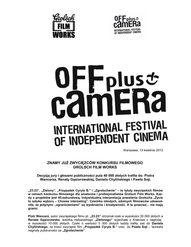 Warszawa, 13 kwietnia 2012 ZNAMY JUŻ ZWYCIĘZCÓW KONKURSU FILMOWEGO GROLSCH FILM WORKS Decyzją jury i głosami publiczności pula 40 000 złotych trafiła do: Piotra Wancerza, Renaty Gąsiorowskiej, Daniela Chylińskiego i Pawła Soji. „23:23”, „Zielony”, „Przypadek Cyryla B.” i „Zgrolschenie” – to tytuły zwycięskich filmów w ramach konkursu filmowego dla amatorów i profesjonalistów Grolsch Film Works. Każdy z projektów jest 45-sekundową, indywidualną interpretacją przesłania Grolscha „Życie to sztuka wyboru – Choose interesting”. Czwórka młodych, zdolnych filmowców udowodniła, że jedynymi „ograniczeniami” są wyobraźnia i kreatywność. A te przecież... nie mają granic. Piotr Wancerz, autor zwycięskiego filmu pt. „23:23” otrzymał czek w wysokości 20 000 złotych a Renata Gąsiorowska, autorka niebanalnego „Zielonego” wyjechała z Krakowa z nagrodą w wysokości 10 000 złotych. Czeki o wartości 5 000 złotych każdy trafiły zaś do Daniela Chylińskiego, za trzeci zwycięski film „Przypadek Cyryla B.” oraz do Pawła Soji – laureata nagrody publiczności za „Zgrolschenie”. Tegoroczna edycja konkursu filmowego Grolsch Film Works, odbywająca się w ramach festiwalu OFF PLUS CAMERA, okazała się płodna w kreatywne zgłoszenia. Organizatorzy otrzymali 139 filmów, z czego 113 spełniających wymogi regulaminowe. Były one uważnie oglądane i oceniane przez twórcze jury konkursu: producenta Kacpra Sawickiego, reżysera i operatora Grzegorza Kuczeriszkę oraz wokalistę i muzyka Czesława Mozila. Jurorzy zdecydowali o wyborze trzech zwycięzców, zaś nagrodę publiczności przyznali internauci głosujący na wybrany film za pośrednictwem strony internetowej www.idfilm.pl „Zwycięzcy konkursu filmowego Grolsch Film Works udowodnili, że podążanie tą samą ścieżką, co inni jest bezpieczne, ale nigdy nie doprowadzi do niczego nowego, odkrywczego. „Choose interesting” to właśnie sztuka wyboru. Nasi laureaci pokazali własną, twórczą drogę, bez oglądania się na innych. Wierzymy, że przyznane przez Grolscha środki pozwolą Piotrowi, Renacie, Danielowi i Pawłowi na dalszy rozwój i szlifowanie talentu”. – powiedział Tomasz Kanton, Brand PR Manager. „Ludzie kreatywni potrafią zobaczyć więcej i poprowadzić swoje myślenie mniej udeptaną ścieżką, albo lepiej - udeptać nową. Każdy z nas ma przywilej unikalnego widzenia rzeczywistości i trzeba dostrzec w tym potencjał. Inspiracją może być wszystko dookoła. Jednym słowem - miejmy oczy i uszy otwarte na świat! Tak jak zwycięzcy tegorocznej edycji Grolsch Film Works, od których wiele możemy się czerpać”. – dodał producent Kacper Sawicki, członek jury. Konkurs filmowy Grolsch Film Works to globalna inicjatywa obecna m.in. w Stanach Zjednoczonych i w Rosji, a od 2011 roku również w Polsce. Ideą konkursu jest wspieranie ducha niezależności i kreatywności wśród młodych, którzy kroczą własną drogą. Konkurs nagradza i promuje talent i umiejętności młodych twórców kina niezależnego: aktorów i reżyserów, przyznając im nagrody finansowe i prezentując ich prace na całym świecie. W ubiegłym roku Grolsch Film Works nagrodził w Polsce kreatywność polskich scenarzystów, organizując konkurs filmowy w ramach współpracy z koszalińskim festiwalem Młodzi i Film. Tegoroczna edycja Grolsch Film Works, której polskim partnerem jest OFF Plus Camera, odbywa się także w Rosji, Stanach Zjednoczonych oraz Kanadzie. Dodatkowo, w tym roku Grolsch po raz drugi będzie partnerem Festiwalu Filmów Niezależnych w San Francisco (San Francisco Film Festival). Zapraszamy do obejrzenia zwycięskich filmów na www.idfilm.pl Więcej o Grolsch Film Works na www.grolsch.pl oraz na http://www.facebook.com/Grolsch.Polska *** Grolsch. Idziesz własną drogą? Grolsch to wyjątkowa, marka piwa dla ludzi niezależnych duchem, podążających własną drogą, którzy doceniają nie tylko jego wyśmienity smak ale przede wszystkim jego oryginalność i zaangażowanie. Grolsch powstaje w jednym z najnowocześniejszych i najbardziej ekologicznych browarów w Europie, w holenderskim mieście Enschede. Swój doskonały smak zawdzięcza unikalnej technice warzenia w niskiej temperaturze. Grolsch to najwyższej jakości holenderskie piwo typu lager, zawierające 5% alkoholu i 11,3% ekstraktu. Najlepiej smakuje podawane w temperaturze 6-8 C. Grolsch to marka dystrybuowana przez Kompanię Piwowarską od sierpnia 2009 roku. Grolsch w Polsce patronuje niezależnym wydarzeniom artystycznym, angażując się także w działania, których celem jest wspieranie niestandardowego sposobu myślenia. Kompania Piwowarska - Lider branży piwowarskiej w Polsce Kompania Piwowarska jest największym przedsiębiorstwem piwowarskim w Polsce. Kilkusetletnie doświadczenia w warzeniu piwa, nowoczesne technologie i rygorystyczne przestrzeganie zasad produkcji na światowym poziomie gwarantują najwyższą jakość naszych produktów. Do portfela marek KP należą najpopularniejsze polskie piwa - m.in. Tyskie, Żubr, Lech, Dębowe Mocne, Redd's, a także międzynarodowe marki premium: Pilsner Urquell, Grolsch oraz Peroni Nastro Azzurro. Kompania Piwowarska (utworzona w 1999 roku) posiada trzy browary (w Tychach, Poznaniu i Białymstoku) oraz czternaście oddziałów handlowych na terenie całego kraju. Kompania Piwowarska prowadzi także działalność społeczną nastawioną na walkę z wykluczeniem społecznym na tle ubóstwa oraz programy edukacyjne popularyzujące odpowiedzialność i umiar w konsumowaniu alkoholu. Wielkość sprzedaży osiągniętej przez KP w roku finansowym zakończonym 31 marca 2010 r. wyniosła 14,6 mln hektolitrów piwa. SABMiller – jeden z największych na świecie producentów piwa Kompania Piwowarska jest częścią jednego z największych na świecie producentów piwa - SABMiller plc. Grupa produkuje lub dystrybuuje piwo n