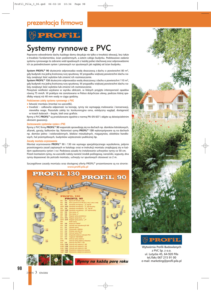 Profil_Pila_3_06.qxd 06-02-18 10:34 Page 98 prezentacja firmowa Systemy rynnowe z PVC Poprawne odwodnienie dachu każdego domu decyduje nie tylko o trwałości elewacji, lecz także o trwałości fundamentów, ścian podziemnych, a zatem całego budynku. Podstawowe zadanie systemu rynnowego to zebranie wód opadowych z każdej połaci dachowej oraz odprowadzenie ich za pośrednictwem rynien i pionowych rur spustowych jak najdalej od ścian budynku. System PROFIL® 90 skutecznie odprowadza wodę deszczową z dachu o powierzchni 80 m2, gdy budynek ma jedną krańcową rurę spustową. W przypadku większej powierzchni dachu należy zwiększyć ilość wylotów lub zmienić ich rozmieszczenie. System PROFIL® 130 skutecznie odprowadza wodę deszczową z dachu o powierzchni 110 m2, gdy budynek ma jedną krańcową rurę spustową. W przypadku większej powierzchni dachu należy zwiększyć ilość wylotów lub zmienić ich rozmieszczenie. Powyższe wielkości uzyskano w wyniku obliczeń, w których przyjęto intensywność opadów równą 75 mm/h. W praktyce nie zanotowano w Polsce dotychczas ulewy, podczas której spadłoby więcej niż 40 mm wody w ciągu godziny. Podstawowe zalety systemu rynnowego z PVC łatwość montażu (montaż na uszczelki), trwałość – całkowita odporność na korozję, rynny nie wymagają malowania i konserwacji, niewielka waga. Pozostałe zalety to: konkurencyjna cena, estetyczny wygląd, dostępność w trzech kolorach – brązie, bieli oraz graficie. Rynny z PVC PROFIL® są produkowane zgodnie z normą PN–EN 607 i objęte są dziesięcioletnim okresem gwarancji. Zastosowanie systemów rynien z PVC Rynny z PVC firmy PROFIL® 90 wspaniale sprawdzają się na dachach np. domków letniskowych, altanek, garaży, balkonów itp. Natomiast rynny PROFIL® 130 wykorzystywane są na dachach np. domów jedno- i wielorodzinnych, bloków mieszkalnych, magazynów, obiektów handlowych, hal przemysłowych, budynków użyteczności publicznej itp. Zasady montażu orynnowania Montaż orynnowania PROFIL® 90 i 130 nie wymaga specjalistycznego wyszkolenia, jedynie przestrzegania zasad zapisanych w katalogu oraz w instrukcji montażu znajdującej się w każdym opakowaniu rynien i rur. Podstawa zasada to instalowanie uchwytów rynny co 50 cm. Przed montażem rynny, na uszczelki należy nanieść środek poślizgowy, narożniki, wypusty, dna rynny dopasować do potrzeb montażu, uchwyty rur spustowych stosować co 2 m. Szczegółowe zasady montażu oraz dostępnej oferty PROFIL® prezentowane są na stronie: www.profil.pila.pl Rynny na każdą porę roku 98 2006 3 budujemy Dom Wytwórnia Profili Budowlanych z PVC Sp. z o.o. ul. Lutycka 45, 64-920 Piła tel./faks 067 215 91 00 e-mail: [email protected]