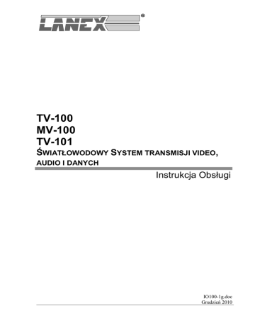 TV-100 MV-100 TV-101 ŚWIATŁOWODOWY SYSTEM TRANSMISJI VIDEO, AUDIO I DANYCH Instrukcja Obsługi IO100-1g.doc Grudzień 2010 ŚWIATŁOWODOWY SYSTEM TRANSMISJI VIDEO, AUDIO I DANYCH Instrukcja Obsługi 1. OGÓLNA CHARAKTERYSTYKA ..........................................................................................3 1.1. OZNACZENIE. ...........................................................................................................................3 1.2. PRZEZNACZENIE .......................................................................................................................5 1.3. PRZYKŁADY ZASTOSOWAŃ.......................................................................................................6 1.4. WYKONANIE ............................................................................................................................9 1.4.1. Pojedynczy interfejs WIDEO. ..........................................................................................9 1.4.2. Poczwórny interfejs WIDEO. .........................................................................................10 1.4.3. Półka 19” konwerterów jedno- i czteroportowych. .......................................................12 2. DANE TECHNICZNE ..............................................................................................................13 2.1. PARAMETRY SYGNAŁU WIDEO .............................................................................................13 2.2. PARAMETRY INTERFEJSU ALARM.........................................................................................13 2.3. PARAMETRY INTERFEJSU RS-232, RS-422 I RS-485. .............................................................14 2.4. PARAMETRY ELEKTRYCZNE INTERFEJSU AUDIO...................................................................14 2.5. PARAMETRY INTERFEJSU OPTYCZNEGO ..................................................................................15 2.6. ZASILANIE. .............................................................................................................................15 2.7. PARAMETRY MECHANICZNE. ..................................................................................................16 2.7.1. Urządzenie jednoportowe. .............................................................................................16 2.7.2. Urządzenie czteroportowe..............................................................................................16 2.7.3. Półka. .............................................................................................................................16 2.8. WYMAGANIA ŚRODOWISKOWE ...............................................................................................16 2.8.1. Eksploatacja ...................................................................................................................16 2.8.2. Transport........................................................................................................................16 2.8.3. Kompatybilność elektromagnetyczna .............................................................................17 3. INSTALACJA I OBSŁUGA. ....................................................................................................17 3.1. WARUNKI PRACY ...................................................................................................................17 3.2. DOŁĄCZANIE LINII ŚWIATŁOWODOWEJ ...................................................................................17 3.3. ZASILANIE I UZIEMIENIE .........................................................................................................18 4. KOMPLETACJA WYROBU ...................................................................................................19 _______________________________________________________________________________ IO100-1g.doc 1 Grudzień 2010 ŚWIATŁOWODOWY SYSTEM TRANSMISJI VIDEO, AUDIO I DANYCH Instrukcja Obsługi BEZPIECZEŃSTWO ! Korpus urządzenia połączony jest z ujemnym biegunem zasilania. ! Promieniowanie emitowane przez nadajnik laserowy jest szkodliwe dla wzroku! Sygnalizuje to symbol umieszczony obok złącza nadajnika (w wersji wyposażonej w nadajnik laserowy): URZĄDZENIE LASEROWE KLASY 1 PN-EN 60825-1 Pod żadnym pozorem nie należy patrzeć w nieosłonięte gniazdo, do którego nie jest dołączone złącze światłowodowe. Nadajnik emituje pełną moc zawsze, gdy tylko urządzenie jest włączone – niezależnie od tego czy do wejścia elektrycznego doprowadzony jest jakikolwiek sygnał, czy też nie. !W przypadku wykorzystania przewodów dłuższych niż 5 m lub prowadzania przewodów elektrycznych poza budynkiem należy bezwzględnie zabezpieczyć urządzenie odpowiednim systemem zabezpieczenia odgromowego. Producent nie odpowiada za stosowanie urządzenia niezgodnie z instrukcją obsługi. Instrukcja obsługi jest integralna częścią urządzenia i wraz z nim jest przekazywana użytkownikom. _______________________________________________________________________________ IO100-1g.doc 2 Grudzień 2010 ŚWIATŁOWODOWY SYSTEM TRANSMISJI VIDEO, AUDIO I DANYCH Instrukcja Obsługi 1. OGÓLNA CHARAKTERYSTYKA 1.1. Oznaczenie. Pełne oznaczenie konwertera składa się z następujących części: Dla wersji obsługującą jednokanałową transmisję wideo: TV/MV-100 - T- W- X- Y- Z Zasięg: 1: 7 km MM 2: 30 km SM 3: 60 km SM Interfejs portu 3: 0: Brak 1: half duplex RS-485 2: full duplex RS-485/422 3: RS-232 4: audio * Interfejs portu 2: 0: Brak 1: half duplex RS-485 2: full duplex RS-485/422 3: RS-232 4: audio * Interfejs port 1: 0: Brak 1: half duplex RS-485 2: full duplex RS-485/422 3: RS-232 1: nadajnik wideo 2: odbiornik wideo * - przy opcji z interfejsem AUDIO muszą być zajęte porty 2 i 3 dla sygnału AUDIO – nie możemy mieć np. na porcie 2 danych a na porcie 3 AUDIO. __________________________________________________________________