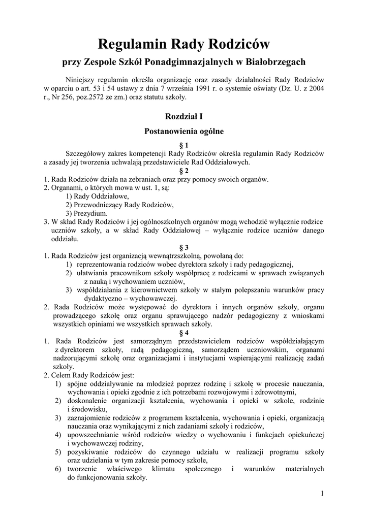 Regulamin Rady Rodziców przy Zespole Szkół Ponadgimnazjalnych w Białobrzegach Niniejszy regulamin określa organizację oraz zasady działalności Rady Rodziców w oparciu o art. 53 i 54 ustawy z dnia 7 września 1991 r. o systemie oświaty (Dz. U. z 2004 r., Nr 256, poz.2572 ze zm.) oraz statutu szkoły. Rozdział I Postanowienia ogólne §1 Szczegółowy zakres kompetencji Rady Rodziców określa regulamin Rady Rodziców a zasady jej tworzenia uchwalają przedstawiciele Rad Oddziałowych. §2 1. Rada Rodziców działa na zebraniach oraz przy pomocy swoich organów. 2. Organami, o których mowa w ust. 1, są: 1) Rady Oddziałowe, 2) Przewodniczący Rady Rodziców, 3) Prezydium. 3. W skład Rady Rodziców i jej ogólnoszkolnych organów mogą wchodzić wyłącznie rodzice uczniów szkoły, a w skład Rady Oddziałowej – wyłącznie rodzice uczniów danego oddziału. §3 1. Rada Rodziców jest organizacją wewnątrzszkolną, powołaną do: 1) reprezentowania rodziców wobec dyrektora szkoły i rady pedagogicznej, 2) ułatwiania pracownikom szkoły współpracę z rodzicami w sprawach związanych z nauką i wychowaniem uczniów, 3) współdziałania z kierownictwem szkoły w stałym polepszaniu warunków pracy dydaktyczno – wychowawczej. 2. Rada Rodziców moŜe występować do dyrektora i innych organów szkoły, organu prowadzącego szkołę oraz organu sprawującego nadzór pedagogiczny z wnioskami wszystkich opiniami we wszystkich sprawach szkoły. §4 1. Rada Rodziców jest samorządnym przedstawicielem rodziców współdziałającym z dyrektorem szkoły, radą pedagogiczną, samorządem uczniowskim, organami nadzorującymi szkołę oraz organizacjami i instytucjami wspierającymi realizację zadań szkoły. 2. Celem Rady Rodziców jest: 1) spójne oddziaływanie na młodzieŜ poprzez rodzinę i szkołę w procesie nauczania, wychowania i opieki zgodnie z ich potrzebami rozwojowymi i zdrowotnymi, 2) doskonalenie organizacji kształcenia, wychowania i opieki w szkole, rodzinie i środowisku, 3) zaznajomienie rodziców z programem kształcenia, wychowania i opieki, organizacją nauczania oraz wynikającymi z nich zadaniami szkoły i rodziców, 4) upowszechnianie wśród rodziców wiedzy o wychowaniu i funkcjach opiekuńczej i wychowawczej rodziny, 5) pozyskiwanie rodziców do czynnego udziału w realizacji programu szkoły oraz udzielania w tym zakresie pomocy szkole, 6) tworzenie właściwego klimatu społecznego i warunków materialnych do funkcjonowania szkoły. 1 3. Do kompetencji Rady Rodziców naleŜy: 1) uchwalanie w porozumieniu z rada pedagogiczną i zgodnie z terminarzem pracy szkoły: a) programu wychowawczego szkoły, b) szkolnego programu profilaktyki. 2) opiniowanie programu i harmonogramu poprawy efektywności kształcenia lub wychowywania szkoły, 3) opiniowanie projektu planu finansowego składanego przez dyrektora szkoły. 4. Do zadań Rady Rodziców naleŜy: 1) współudział w bieŜącym i perspektywicznym programowaniu pracy szkoły oraz pomoc w doskonaleniu organizacji i warunków pracy szkoły, 2) pomoc w realizacji programów nauczania, wychowania i zadań opiekuńczych szkoły, 3) współpraca ze środowiskiem lokalnym, 4) udzielanie pomocy samorządowi uczniowskiemu oraz organizacjom młodzieŜowym działającym w szkole, 5) organizowanie działalności mającej na celu podnoszenie kultury pedagogicznej w rodzinie, szkole i środowisku lokalnym, 6) szerzenie wśród rodziców wiedzy pedagogicznej, 7) uświadamianie rodzicom konieczności udziału młodzieŜy w zajęciach edukacyjnych, przygotowywania się do nich oraz właściwego zachowywania w ich trakcie, 8) usprawiedliwianie, w określonym terminie i formie, nieobecności dzieci na zajęciach edukacyjnych, 9) dbanie u schludny wygląd dziecka oraz noszenie przez niego odpowiedniego stroju, 10) uświadamianie dzieciom warunków korzystania z telefonów komórkowych i innych urządzeń elektronicznych na terenie szkoły, 11) inspirowanie właściwego zachowania się dziecka wobec nauczycieli i innych pracowników szkoły oraz pozostałych uczniów, 12) oddziaływanie na rodziców zaniedbujących swoje obowiązki rodzicielsko – wychowawcze, 13) zapewnienie pomocy materialnej organizacjom szkolnym, kołom zainteresowań, działaniom podnoszącym jakość kształcenia oraz działaniom będących w tradycji szkoły, 14) zaspokajanie potrzeb materialnych szkoły w zakresie doposaŜenia sal, gabinetów i innych pomieszczeń szkolnych w pomoce i urządzenia słuŜące poprawie jakości kształcenia oraz bezpieczeństwa uczniów i pracowników szkoły. §5 Członkowie Rady Rodziców i jej organów pełnią swoje funkcje honorowo. §6 Jako organizacja wewnątrzszkolna Rada Rodziców prowadzi swoją działalność w porozumieniu z kierownictwem szkoły. §7 Rada Rodziców moŜe gromadzić fundusze i dysponować nimi zgodnie z zasadami określonymi w Rozdziale V niniejszego regulaminu. §8 Działalność Rady Rodziców winna być zgodna z obowiązującym statutem szkoły i przepisami prawa oświatowego. §9 Podstawową komórką Rady Rodziców jest Rada Oddziałowa. § 10 Termin zebrań wyborczych poszczególnych Rad Oddziałowych ustala dyrektor szkoły w porozumieniu z Przewodniczącym Rady Rodziców. § 11 2 Radę Rodziców szkoły tworzą przedstawiciele Rad Oddziałowych. § 12 Rada Rodziców na pierwszym posiedzeniu w bieŜącym roku szkolnym wybiera Prezydium Rady. Rozdział II Zebrania Rady Rodziców § 13 1. Zebranie Rady Rodziców moŜe podejmować uchwały we wszystkich sprawach w zakresie swoich kompetencji. 2. Do wyłącznej właściwości zabrania Rady Rodziców naleŜy: 1) wybór Prezydium, 2) coroczne określanie zasad wydatkowania środków stanowiących fundusz Rady Rodziców, 3) rozwiązanie Rady Rodziców. § 14 1. W zebraniach Rady Rodziców moŜe brać udział, z głosem doradczym, dyrektor szkoły. 2. Do udziału w zebraniach Rady Rodziców mogą być zaproszone przez przewodniczącego, z