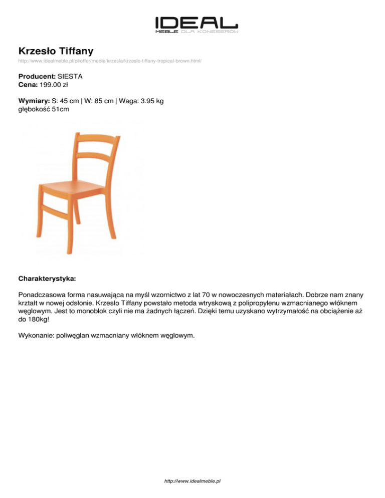 Krzesło Tiffany http://www.idealmeble.pl/pl/offer/meble/krzesla/krzeslo-tiffany-tropical-brown.html/ Producent: SIESTA Cena: 199.00 zł Wymiary: S: 45 cm | W: 85 cm | Waga: 3.95 kg głębokość 51cm Charakterystyka: Ponadczasowa forma nasuwająca na myśl wzornictwo z lat 70 w nowoczesnych materiałach. Dobrze nam znany krztałt w nowej odsłonie. Krzesło Tiffany powstało metoda wtryskową z polipropylenu wzmacnianego włóknem węglowym. Jest to monoblok czyli nie ma żadnych łączeń. Dzięki temu uzyskano wytrzymałość na obciążenie aż do 180kg! Wykonanie: poliwęglan wzmacniany włóknem węglowym. http://www.idealmeble.pl Dostępne wersje produktu: nazwa produktu Krzesło Tiffany Krzesło Tiffany Krzesło Tiffany Krzesło Tiffany warianty kolor pomarańczowy kolor czarny kolor brązowy kolor biały cena 199.00zł 199.00zł 199.00zł 199.00zł http://www.idealmeble.pl dostępne Na zamówienie Na zamówienie Na zamówienie Zapytaj Zdjęcia produktu: http://www.idealmeble.pl Powered by TCPDF (www.tcpdf.org)