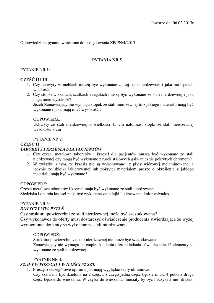 Jaworze dn. 06.02.2013r Odpowiedzi na pytania wniesione do postępowania ZP/PN/4/2013 PYTANIA NR 5 PYTANIE NR 1: CZĘŚĆ II i III 1. Czy uchwyty w meblach muszą być wykonane z litej stali nierdzewnej i jaka ma być ich wielkość? 2. Czy stopki w szafach, szafkach i regałach muszą być wykonane ze stali nierdzewnej i jaką mają mieć wysokość? Jeżeli Zamawiający nie wymaga stopek ze stali nierdzewnej to z jakiego materiału mają być wykonane i jaką mają mieć wysokość ? ODPOWIEDŹ: Uchwyty ze stali nierdzewnej o wielkości 15 cm natomiast stopki ze stali nierdzewnej wysokości 8 cm PYTANIE NR 2: CZĘŚĆ II TABORETY I KRZESŁA DLA PACJENTÓW 1. Czy części metalowe taboretów i krzeseł dla pacjentów muszą być wykonane ze stali nierdzewnej czy mogą być wykonane z rurek stalowych galwanicznie pokrytych chromem? 2. W związku z tym, że krzesła nie są wykonywane z płyty wiórowej melaminowanej a jedynie ze sklejki lakierowanej lub pokrytej materiałem proszę o określenie z jakiego materiału mają być wykonane? ODPOWIEDŹ: Części metalowe taboretów i krzeseł maja być wykonane ze stali nierdzewnej. Siedziska i oparcia krzeseł mają być wykonane ze sklejki lakierowanej kolor calvados. PYTANIE NR 3: DOTYCZY WW. PYTAŃ Czy struktura powierzchni ze stali nierdzewnej może być szczotkowana? Czy wykonawca do oferty musi dostarczyć oświadczenie producenta stwierdzające że wyżej wymienione elementy są wykonane ze stali nierdzewnej? ODPOWIEDŹ: Struktura powierzchni ze stali nierdzewnej nie może być szczotkowana. Zamawiający nie wymaga na etapie składania ofert składania oświadczenia, iż elementy są wykonane ze stali nierdzewnej. PYATNIE NR 4: SZAFY W POZYCJI 1 W ILOŚCI 52 SZT. 1. Proszę o szczegółowe opisanie jak mają wyglądać szafy ubraniowe. Czy szafa ma być dzielona na 2 części, z czego jedna część będzie miała 4 półki a druga część będzie do wieszania. W części do wieszania musiały by być haczyki a nie drążek, ponieważ aby powiesić ubranie na wieszaku to wymiar szafy na szerokości lub głębokości musiałby się zmienić na 60 cm. ODPOWIEDŹ: Szafy tylko z półkami, bez dzielenia na część do wieszania. Szafa z 4 półkami – 185 x 60 x 35 cm w ilości 49 szt. Szafa z 4 pólkami 185 x 80 x 54,5/57,5 cm zamykana na klucz w ilości 2 szt. Szafa z pólkami185 x 80 x 38,5 cm z zamkiem w ilości 1 szt. PYTANIE NR 5: 2. Czy plecy mają być wykonane z płyty HDF o gr. 3 mm a pozostałe elementy z płyty wiórowej melaminowanej o grubości 18 mm? ODPOWIEDŹ: Tak PYTANIE NR 6: 3. Czy szafy muszą posiadać wywietrzniki? ODPOWIEDŹ: Nie. PYTANIE NR 7: 4. Czy wszystkie krawędzie w szafach muszą być oklejone obrzeżem ze wszystkich stron tzn. półki z czterech stron i tyły szaf? ODPOWIEDŹ: Półki mają być oklejone z czterech stron, tyły szaf nie muszą być oklejone.. PYTANIE NR 8: 5. Czy półki w szafach muszą posiadać regulację? ODPOWIEDŹ: Nie. PYTANIE NR 9: 6. Czy stolik okolicznościowy ma być wykonany na nogach płycinowych czy na nogach metalowych chromowanych? ODPOWIEDŹ: Na nogach metalowych, chromowanych. PYTANIE NR 10: Część III LADA Aby wycenę lady wykonać w sposób prawidłowy Zamawiający powinien udostępnić choćby odręcznie narysowany rysunek z określeniem kształtu (promień lady), wymiarów wysokości lady, głębokości i grubości blatu biurka i nadstawki. ODPOWIEDŹ: Zgodnie z modyfikacją nr 3 PYTANIE NR 11: SALE CHORYCH ODDZIALOWYCH STOLIKI DLA PACJENTÓW 1. Czy blaty stolików mogą być wykonane z płyty wiórowej melaminowanej o grubości 28 lub 18 mm (proszę określenie grubości). Jeśli nie, to z jakiego materiału należy je wykonać? ODPOWIEDŹ: Zgodnie z modyfikacją nr 3. PYATNIE NR 12: 2. Czy nogi do stolików mają być wykonane z drewna miękkiego np. sosna, świerk czy z drewna twardego np. buk, dąb? Określenie to ma istotny wpływ na cenę. ODPOWIEDŹ: Zgodnie z modyfikacją nr 3. PYTANIE NR 13: STATYSTYKA ODDZIAŁU LECZNICZO-REHABILITACYJNEGO DLA DZIECI I MŁODZIEŻY ZABUDOWA DOLNA BLATU NAROŻNEGO 1. Z jakiego materiału musi być wykonana płyta ażurowa, jakiego kształtu i jakiej wysokości? Czy ma to być blacha perforowana malowana proszkowo na kolor srebrny? ODPOWIEDŹ: Zgodnie z modyfikacją nr 3.