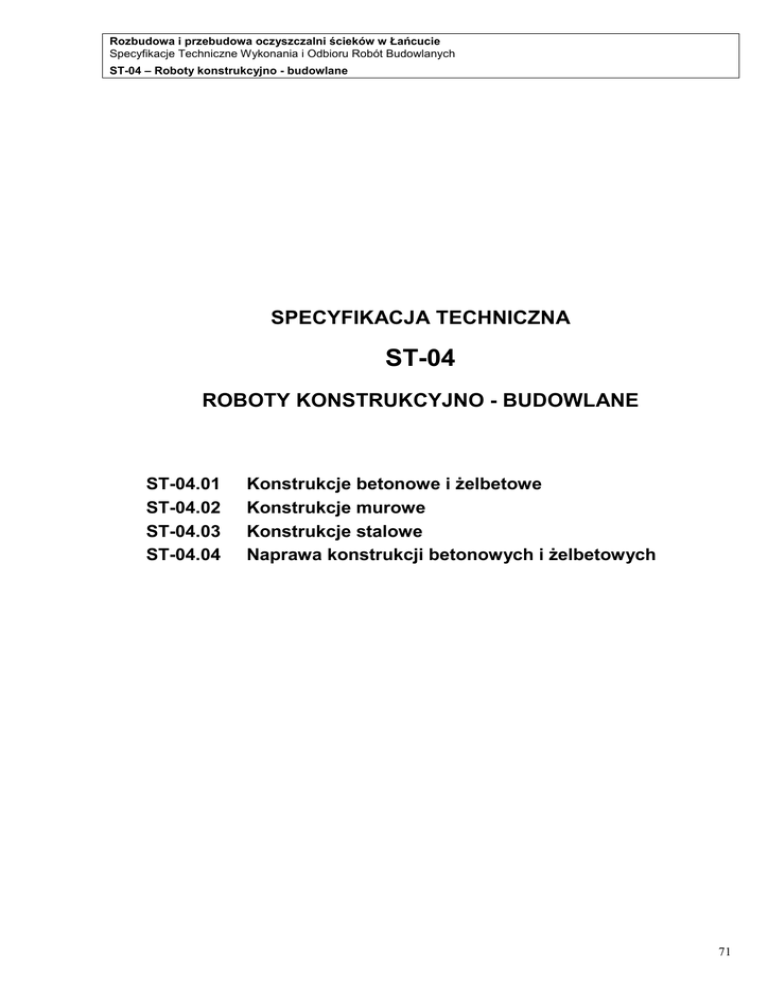 Rozbudowa i przebudowa oczyszczalni ścieków w Łańcucie Specyfikacje Techniczne Wykonania i Odbioru Robót Budowlanych ST-04 – Roboty konstrukcyjno - budowlane SPECYFIKACJA TECHNICZNA ST-04 ROBOTY KONSTRUKCYJNO - BUDOWLANE ST-04.01 ST-04.02 ST-04.03 ST-04.04 Konstrukcje betonowe i Ŝelbetowe Konstrukcje murowe Konstrukcje stalowe Naprawa konstrukcji betonowych i Ŝelbetowych 71 Rozbudowa i przebudowa oczyszczalni ścieków w Łańcucie Specyfikacje Techniczne Wykonania i Odbioru Robót Budowlanych ST-04.01 – Konstrukcje betonowe i Ŝelbetowe SPECYFIKACJA TECHNICZNA ST-04.01 KONSTRUKCJE BETONOWE I śELBETOWE 72 Rozbudowa i przebudowa oczyszczalni ścieków w Łańcucie Specyfikacje Techniczne Wykonania i Odbioru Robót Budowlanych ST-04.01 – Konstrukcje betonowe i Ŝelbetowe Spis treści 1. WSTĘP ................................................................................................................................................... 75 1.1. Przedmiot specyfikacji technicznej ................................................................................................ 75 1.2. Zakres stosowania ST.................................................................................................................... 75 1.3. Zakres robót objętych ST ............................................................................................................... 75 1.4. Określenia podstawowe ................................................................................................................. 77 1.5. Ogólne wymagania dotyczące robót .............................................................................................. 77 2. MATERIAŁY .......................................................................................................................................... 77 2.1. Materiały – wymagania ogólne ...................................................................................................... 77 2.2. Materiały – wymagania szczegółowe............................................................................................. 77 2.2.1. Beton konstrukcyjny ........................................................................................................ 77 2.2.1.1. Mieszanka betonowa ............................................................................................ 80 2.2.1.2. Składniki mieszanki betonowej ............................................................................. 80 2.2.2. Beton niekonstrukcyjny ................................................................................................... 81 2.2.3. Stal zbrojeniowa .............................................................................................................. 81 2.2.4. Materiały spawalnicze ..................................................................................................... 82 2.2.5. Uszczelnienie dylatacji posadzek i przerw roboczych .................................................... 82 2.2.6. Elementy wbudowane ..................................................................................................... 82 2.2.7. Belki prefabrykowane nadproŜy ...................................................................................... 82 2.2.8. Strop gęstoŜebrowy typu Teriwa ..................................................................................... 83 2.2.8.1. Pustaki betonowe.................................................................................................. 83 2.2.8.2. Belki ...................................................................................................................... 83 2.2.8.3. Beton uzupełniający .............................................................................................. 84 3. SPRZĘT ................................................................................................................................................. 84 3.1. Deskowania .................................................................................................................................... 84 3.2. Pompy do podawania betonu ........................................................................................................ 84 3.3. Sprzęt drobny ................................................................................................................................. 84 4. TRANSPORT ......................................................................................................................................... 85 5. WYKONANIE ROBÓT ........................................................................................................................... 85 5.1. Wymagania ogólne ........................................................................................................................ 85 5.2. Zakres wykonywania robót ............................................................................................................ 85 5.2.1. Wykonanie deskowań i szalunków ................................................................................. 85 5.2.2. Przygotowanie zbrojenia ................................................................................................. 86 5.2.3. MontaŜ zbrojenia ............................................................................................................. 86 5.2.4. Wbudowanie mieszanki betonowej ................................................................................. 87 5.2.5. Pielęgnacja betonu .......................................................................................................... 88 5.2.6. Wykańczanie powierzchni betonu ................................................................................... 88 5.2.7. Wykonanie przerw roboczych ......................................................................................... 89 5.2.8. Wykonanie szczelin dylatacyjnych w posadzkach ......................................