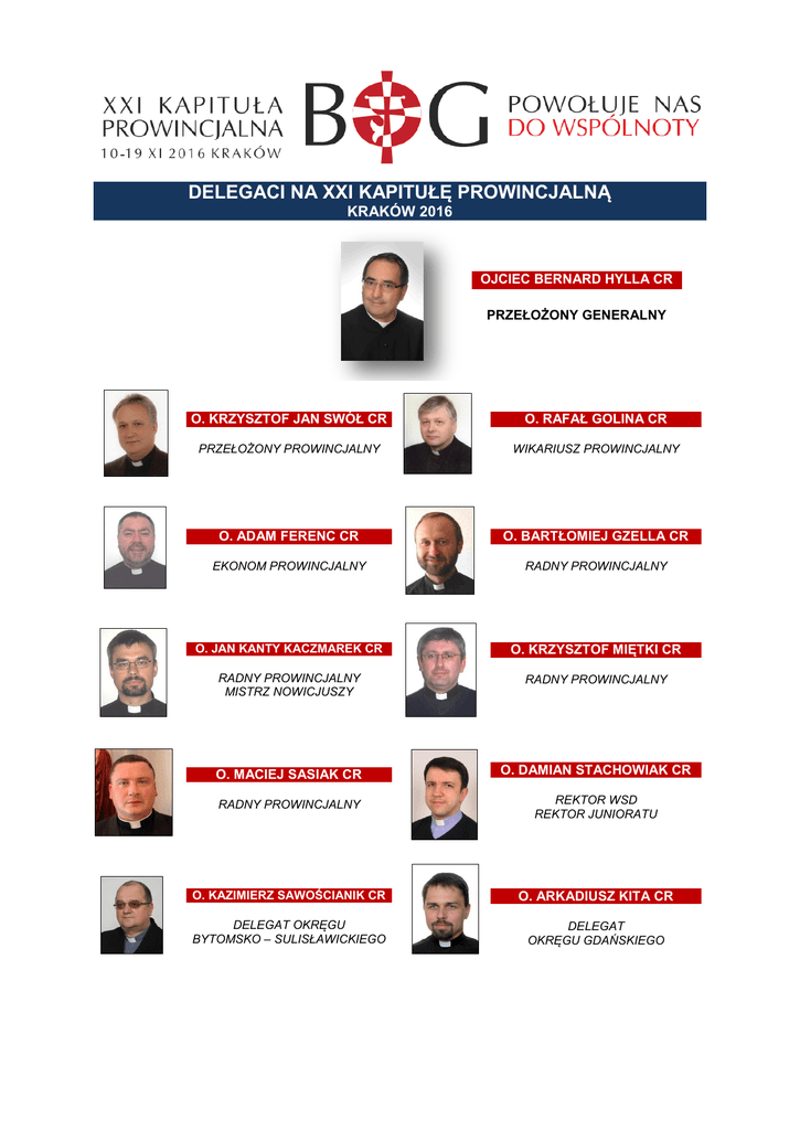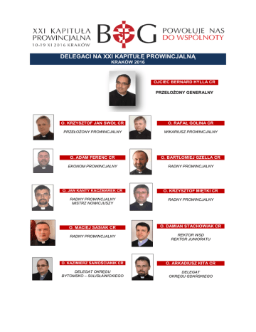 DELEGACI NA XXI KAPITUŁĘ PROWINCJALNĄ KRAKÓW 2016 OJCIEC BERNARD HYLLA CR PRZEŁOŻONY GENERALNY O. KRZYSZTOF JAN SWÓŁ CR O. RAFAŁ GOLINA CR PRZEŁOŻONY PROWINCJALNY WIKARIUSZ PROWINCJALNY O. ADAM FERENC CR O. BARTŁOMIEJ GZELLA CR EKONOM PROWINCJALNY RADNY PROWINCJALNY O. JAN KANTY KACZMAREK CR O. KRZYSZTOF MIĘTKI CR RADNY PROWINCJALNY MISTRZ NOWICJUSZY RADNY PROWINCJALNY O. MACIEJ SASIAK CR O. DAMIAN STACHOWIAK CR RADNY PROWINCJALNY REKTOR WSD REKTOR JUNIORATU O. KAZIMIERZ SAWOŚCIANIK CR O. ARKADIUSZ KITA CR DELEGAT OKRĘGU BYTOMSKO – SULISŁAWICKIEGO DELEGAT OKRĘGU GDAŃSKIEGO O. RYSZARD PACHOLEC CR O. ANDRZEJ SOSNOWSKI CR DELEGAT OKRĘGU GDAŃSKIEGO DELEGAT OKRĘGU KRAKOWSKIEGO O. DARIUSZ TABOR CR O. EDWARD ŻAKOWICZ CR DELEGAT OKRĘGU KRAKOWSKIEGO DELEGAT OKRĘGU KRAKOWSKIEGO O. KRZYSZTOF CZERWIONKA CR O. MIECZYSŁAW MŁYNARCZYK CR DELEGAT OKRĘGU KRAKOWSKIEGO DELEGAT OKRĘGU WARSZAWSKIEGO O. ANDRZEJ NAPIECEK CR O. WIESŁAW HNATEJKO CR DELEGAT OKRĘGU POZNAŃSKIEGO DELEGAT OKRĘGU ZŁOCIENIECKIEGO O. WŁODZIMIERZ SOBOLEWSKI CR O. JAN SOROKA CR DELEGAT OKRĘGU PÓŁNOCNOAMERYKAŃSKIEGO DELEGAT OKRĘGU AUSTRAICKIEGO O. MACIEJ GAWLIK CR O. MICHAŁ SZLACHCIAK CR DELEGAT OKRĘGU AUSTRAICKIEGO DELEGAT OKRĘGU BUŁGARSKIEGO O. JAROSŁAW KINKA CR O. PAWEŁ KRUCZEK CR DELEGAT OKRĘGU SŁOWACKIEGO DELEGAT OKRĘGU NIEMIECKIEGO O. LESŁAW OGRYZEK CR O. ADAM DŹWIGOŃ CR DELEGAT OKRĘGU NIEMIECKIEGO DELEGAT OKRĘGU WŁOSKIEGO O. MIECZYSŁAW KONIECZEK CR O. MIROSŁAW KNAP CR DELEGAT OKRĘGU WŁOSKIEGO DELEGAT OKRĘGU AUSTRALIJSKIEGO O. ANDRZEJ JAGIEŁKA CR DK. DANIEL SZKUBERA CR DELEGAT OKRĘGU WSCHODNIEGO DELEGAT KLERYKÓW PO ŚLUBACH WIECZYSTYCH BR. MARIUSZ BIEDAL CR DELEGAT BRACI WSPÓŁPRACOWNIKÓW PO ŚLUBACH WIECZYSTYCH SEKRETARIAT KAPITUŁY O. Jerzy Rolka CR przewodniczący O. Wojciech Mleczko CR O. Andrzej Mądry CR