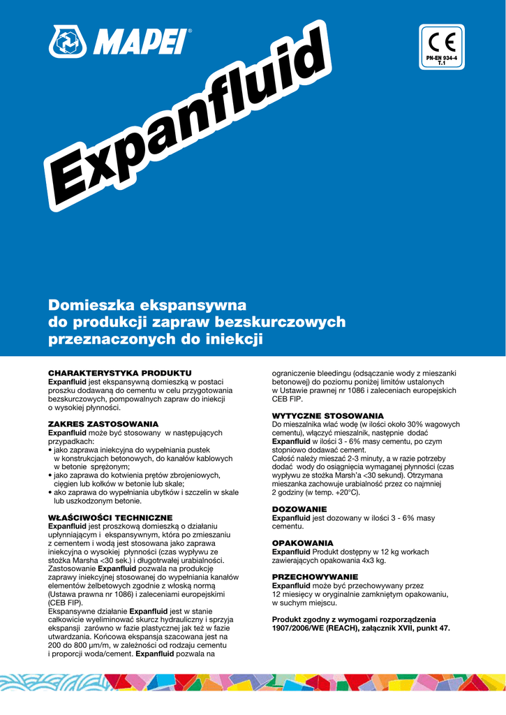 f n a p x E d i lu PN-EN 1504-3 934-4 PN-EN T.1 Domieszka ekspansywna do produkcji zapraw bezskurczowych przeznaczonych do iniekcji CHARAKTERYSTYKA PRODUKTU Expanfluid jest ekspansywną domieszką w postaci proszku dodawaną do cementu w celu przygotowania bezskurczowych, pompowalnych zapraw do iniekcji o wysokiej płynności. ZAKRES ZASTOSOWANIA Expanfluid może być stosowany w następujących przypadkach: • jako zaprawa iniekcyjna do wypełniania pustek w konstrukcjach betonowych, do kanałów kablowych w betonie sprężonym; • jako zaprawa do kotwienia prętów zbrojeniowych, cięgien lub kołków w betonie lub skale; • ako zaprawa do wypełniania ubytków i szczelin w skale lub uszkodzonym betonie. WŁAŚCIWOŚCI TECHNICZNE Expanfluid jest proszkową domieszką o działaniu upłynniającym i ekspansywnym, która po zmieszaniu z cementem i wodą jest stosowana jako zaprawa iniekcyjna o wysokiej płynności (czas wypływu ze stożka Marsha <30 sek.) i długotrwałej urabialności. Zastosowanie Expanfluid pozwala na produkcję zaprawy iniekcyjnej stosowanej do wypełniania kanałów elementów żelbetowych zgodnie z włoską normą (Ustawa prawna nr 1086) i zaleceniami europejskimi (CEB FIP). Ekspansywne działanie Expanfluid jest w stanie całkowicie wyeliminować skurcz hydrauliczny i sprzyja ekspansji zarówno w fazie plastycznej jak też w fazie utwardzania. Końcowa ekspansja szacowana jest na 200 do 800 μm/m, w zależności od rodzaju cementu i proporcji woda/cement. Expanfluid pozwala na ograniczenie bleedingu (odsączanie wody z mieszanki betonowej) do poziomu poniżej limitów ustalonych w Ustawie prawnej nr 1086 i zaleceniach europejskich CEB FIP. WYTYCZNE STOSOWANIA Do mieszalnika wlać wodę (w ilości około 30% wagowych cementu), włączyć mieszalnik, następnie dodać Expanfluid w ilości 3 - 6% masy cementu, po czym stopniowo dodawać cement. Całość należy mieszać 2-3 minuty, a w razie potrzeby dodać wody do osiągnięcia wymaganej płynności (czas wypływu ze stożka Marsh’a <30 sekund). Otrzymana mieszanka zachowuje urabialność przez co najmniej 2 godziny (w temp. +20°C). DOZOWANIE Expanfluid jest dozowany w ilości 3 - 6% masy cementu. OPAKOWANIA Expanfluid Produkt dostępny w 12 kg workach zawierających opakowania 4x3 kg. PRZECHOWYWANIE Expanfluid może być przechowywany przez 12 miesięcy w oryginalnie zamkniętym opakowaniu, w suchym miejscu. Produkt zgodny z wymogami rozporządzenia 1907/2006/WE (REACH), załącznik XVII, punkt 47. WŁAŚCIWOŚCI PRODUKTU Postać: proszek Kolor: szary Gęstość: 2,67 g/m3 Zawartość ciał stałych: 100% PARAMETRY UŻYTKOWE Proporcje mieszania: - zaprawa iniekcyjna: 100 części wagowych cementu z 30-38 częściami wody i 3-6 częściami wagowymi Expanfluid. Przykład proporcji mieszania jako zaczynu iniekcyjnego: - cement typu CEM I 52,5 R: - woda - proporcja woda/cement - Expanfluid (3%) 1435 kg/m3 517 0,36 43 Wypływ ze stożka (EN 445): < 25 sekund Gęstość (EN 445): 1995 kg/m3 Samoczynne wydzielanie się wody (EN 445): Brak Wytrzymałość na ściskanie: po 1 dniu - 40 N/mm2 po 7dniach - 60 N/mm2 po 28 dniach - 75 N/mm2 Ekspansja w fazie twardnienia (2 dni) według normy UNI 8147: >300 μm/m ŚRODKI OSTROŻNOŚCI I BEZPIECZEŃSTWA Expanfluid zawiera cement, który w kontakcie z potem lub innymi wydzielinami ciała, może wywoływać reakcję alergiczną skóry. Działa drażniąco na oczy. Podczas pracy z produktem należy używać rękawic i okularów ochronnych oraz zachować zwyczajowe środki ostrożności jak przy obchodzeniu się z produktami chemicznymi. W przypadku kontaktu z oczami lub skórą należy natychmiast obficie spłukać wodą i skontaktować się z lekarzem. Więcej informacji na temat bezpiecznego stosowania produktu znajduje się w najnowszej wersji Karty Charakterystyki. PRODUKT DLA PROFESJONALISTÓW. UWAGI Powyższe dane należy traktować wyłącznie jako ogólne wskazówki. Niezależne od nas warunki pracy i różnorodność materiałów wykluczają jakiekolwiek roszczenia wynikające z tych danych. W przypadku wątpliwości zalecane jest przeprowadzenie badań własnych. MAPEI udziela gwarancji jedynie co do niezmiennej jakości swoich produktów. Wszelkie prawa zastrzeżone. Kopiowanie tekstów, zdjęć i rysunków w całości lub w części bez zezwolenia zabronione. a p Ex DANE TECHNICZNE Referencje dotyczące produktu są dostępne na życzenie oraz na stronach www.mapei.com i www.mapei.pl 781-08-2016 (PL) d i u l nf ŚWIATOWY PARTNER W BUDOWNICTWIE