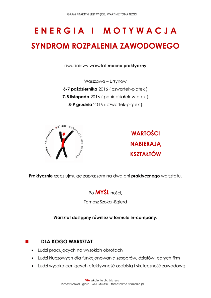 GRAM PRAKTYKI JEST WIĘCEJ WART NIŻ TONA TEORII ENERGIA I MOTYWACJA SYNDROM ROZPALENIA ZAWODOWEGO dwudniowy warsztat mocno praktyczny Warszawa – Ursynów 6-7 października 2016 ( czwartek-piątek ) 7-8 listopada 2016 ( poniedziałek-wtorek ) 8-9 grudnia 2016 ( czwartek-piątek ) WARTOŚCI NABIERAJĄ KSZTAŁTÓW Praktycznie rzecz ujmując zapraszam na dwa dni praktycznego warsztatu. Po MYŚL ności, Tomasz Szokal-Egierd Warsztat dostępny również w formule in-company. DLA KOGO WARSZTAT Ludzi pracujących na wysokich obrotach Ludzi kluczowych dla funkcjonowania zespołów, działów, całych firm Ludzi wysoko ceniących efektywność osobistą i skuteczność zawodową VIA szkolenia dla biznesu Tomasz Szokal-Egierd – 661 333 380 – [email protected] GRAM PRAKTYKI JEST WIĘCEJ WART NIŻ TONA TEORII SŁOWA MÓWIĄ O / DZIAŁANIA DECYDUJĄ O TRACENIU ZYSKIWANIU Jakby zeszło ze mnie powietrze Złapałem wiatr w żagle Zupełnie zjadł mnie stres Oddycham pełną piersią Czuję się wypompowany Naładowałem baterie Poczułem się taki mały To była intelektualna uczta Jeśli to prawda, że słowa nazywają rzeczywistość, rzeczywistość w swojej dwubiegunowości jest zaskakująco prosta: Energię możesz tracić lub zyskiwać. Motywację możesz zabijać lub żywić. Twoje oczy mogą szarzeć lub błyszczeć. Ludzie mogą Cię unikać lub się do Ciebie garnąć. ENERGIA A MOTYWACJA DO DZIAŁANIA Poziom energii zależy od jakości trzech podstawowych obszarów, w których codziennie się poruszamy. Mamy ciało fizyczne, stany emocjonalne i struktury myślowe. Idąc w stronę obrazowej skrajności, warto zadać sobie pytanie – jaki jest poziom motywacji człowieka, który często łapie się za bolący brzuch (fizyczność), irytuje się docinkami ludzi lub sam im docina (emocje), sam nie wierzy w realizację planów prywatnych i zawodowych (myślenie)? Poziom motywacji jest wyraźnie skorelowany z poziomem energii. Jeśli słowo motywacja pochodzi od łacińskiego „emovere”, czyli „poruszać się”, warto przyjąć prostą optykę – jeśli mamy wydolny organizm, umiemy pracować z emocjami, umiemy pracować z przekonaniami myślowymi, jesteśmy skuteczniejszymi ludźmi. Łatwiej dojść do celu (zawodowego czy prywatnego), kiedy mamy zdrowe nogi i serce, kiedy mamy stabline emocje i kiedy wierzymy, że warto tam iść. VIA szkolenia dla biznesu Tomasz Szokal-Egierd – 661 333 380 – [email protected] GRAM PRAKTYKI JEST WIĘCEJ WART NIŻ TONA TEORII PROPONUJĘ DLA CIAŁ (fizycznego, emocjonalnego i mentalnego) Pracę w językowej „Ramie Celu” i innych typach przeformułowań. Pracę językiem faktów według Marshalla Rosenberga; Doświadczenie rozluźniających praktyk ruchowych; Pracę na poziomach logicznych Roberta Diltsa; Doświadczenie prostych technik oczyszczania emocji; PROGRAM WARSZTATU W SZCZEGÓŁACH Wymowny eksperyment „Kwiaty doniczkowe” pokazujący wagę życiowej aktywności i świadomości w obszarze energii i motywacji. Pytania z sensem: Kim jesteś? Jaka jest Twoja rola zawodowa? Co chcesz znaleźć na naszym warsztacie i co trwale zabrać ze sobą? Prowokacja trenerska z elementami łaciny. Chwilowo tajemnica, żeby było zaskakująco. Chcę pokazać mechanizm, który często powoduje zabicie motywacji i utratę energii. Opinie, etykiety, łatki, stygmaty – trzy proste modele do eliminowania emocjonalnych zabójców. Czyli jak radzić sobie z tekstami typy: „Produkujesz buble”, „Jesteś infantylna”, „Za szybko się poddajesz”. „Jesteś zbyt łagodna dla swojego zespołu”. Oś czasu – w którą stronę zaprasza nas pytanie „dlaczego”, a w którą stronę zaprasza nas pytanie „po co”? Jak w obszarze energii i motywacji korzystać z przeszłości, teraźniejszości, przyszłości? Pożywienie widoczne i niewidoczne – karmię ciało fizyczne, karmię ciało emocjonalne, karmię ciało mentalne. Rozpoznawanie potraw, które zabierają mi energię i motywację. Świadome wybieranie potraw, które przydają mi energii i motywacji. ODDECH – dwa słowa o funkcjach oddechu – jak dobry oddech wpływa na układ trawienny, układ krążenia i układ odpornościowy. 4 oddechy: górny, średni, dolny i pełny. Doświadczenia / praktyka. VIA szkolenia dla biznesu Tomasz Szokal-Egierd – 661 333 380 – [email protected] GRAM PRAKTYKI JEST WIĘCEJ WART NIŻ TONA TEORII Dbałość o słowa – jak umysł nieświadomy reaguje na słowa. Dużo mówi się, że człowiek najmocniej zapamiętuje obrazy. Jeśli tak jest, bardzo mocno i poważnie zajmiemy się obrazami wewnętrznymi. Język pasywny i język aktywny – „jestem zmęczony” vs. „potrzebuję odpocząć”; „jestem wkurzony” vs. „potrzebuję się uspokoić”…; „nowa sytuacja rynkowa mnie przygniata” vs. „muszę się do nowej sytuacji rynkowej przystosować”… Niby tylko słowa, a kierują w różne strony. Stres i napięcia. Miejsca w ciele chętnie wybierane przez stres. Kilka praktycznych, prostych technik rozluźniających ciało. Umiejętność samokontroli w sytuacjach stresu. Podstawowe techniki. Jak sobie radzę z emocjami? Proste techniki higieny emocjonalnej. Schematy mentalne – umiejętność pracy z przekonaniami własnymi i przekonaniami innych ludzi. Językowa Rama Celu. Zbudowanie indywidualnego planu rozwijania / gruntowania własnej energii i motywacji. Tak zwany most w przyszłość. TRENERSKIE BIO Tomasz Szokal-Egierd Jestem praktykiem biznesu i praktykiem trenerem, absolwentem Centrum Szkoleń i Psychoedukacji Instytutu Psychologii Zdrowia PTP, Trenerem Biznesu z licznymi certyfikatami (m.in. Trenera NLP). Od 20 lat w aktywnej i praktycznej sprzedaży (w segmencie B2C, jak i B2B), a od 12 lat w szkoleniach doświadczam, jak ekscytujący i zmienny jest obszar komunikacji między ludźmi, jak coś, co było aktualne wczoraj, dzisiaj poszukuje nowej rację bytu. Zdecydowane stawiam na praktyczną użyteczność życiową ćwiczo