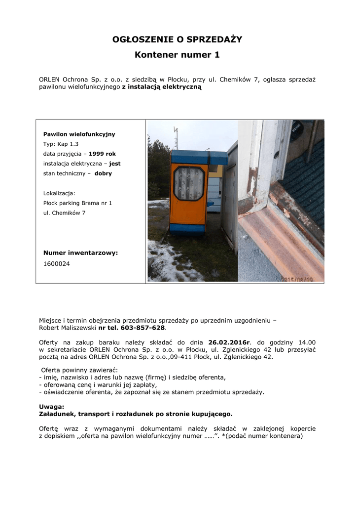 OGŁOSZENIE O SPRZEDAŻY Kontener numer 1 ORLEN Ochrona Sp. z o.o. z siedzibą w Płocku, przy ul. Chemików 7, ogłasza sprzedaż pawilonu wielofunkcyjnego z instalacją elektryczną Pawilon wielofunkcyjny Typ: Kap 1.3 data przyjęcia – 1999 rok instalacja elektryczna – jest stan techniczny – dobry Lokalizacja: Płock parking Brama nr 1 ul. Chemików 7 Numer inwentarzowy: 1600024 Miejsce i termin obejrzenia przedmiotu sprzedaży po uprzednim uzgodnieniu – Robert Maliszewski nr tel. 603-857-628. Oferty na zakup baraku należy składać do dnia 26.02.2016r. do godziny 14.00 w sekretariacie ORLEN Ochrona Sp. z o.o. w Płocku, ul. Zglenickiego 42 lub przesyłać pocztą na adres ORLEN Ochrona Sp. z o.o.,09-411 Płock, ul. Zglenickiego 42. Oferta powinny zawierać: - imię, nazwisko i adres lub nazwę (firmę) i siedzibę oferenta, - oferowaną cenę i warunki jej zapłaty, - oświadczenie oferenta, że zapoznał się ze stanem przedmiotu sprzedaży. Uwaga: Załadunek, transport i rozładunek po stronie kupującego. Ofertę wraz z wymaganymi dokumentami należy składać w zaklejonej kopercie z dopiskiem ,,oferta na pawilon wielofunkcyjny numer ……’’. *(podać numer kontenera)