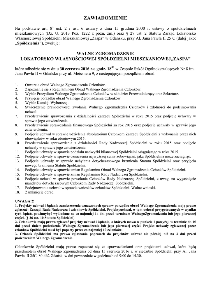 ZAWIADOMIENIE Na podstawie art. 83 ust. 2 i ust. 6 ustawy z dnia 15 grudnia 2000 r. ustawy o spółdzielniach mieszkaniowych (Dz. U. 2013 Poz. 1222 z późn. zm.) oraz § 27 ust. 2 Statutu Zarząd Lokatorsko Własnościowej Spółdzielni Mieszkaniowej „Zaspa” w Gdańsku, przy Al. Jana Pawła II 25 C (dalej jako: „Spółdzielnia”), zwołuje: WALNE ZGROMADZENIE LOKATORSKO WŁASNOŚCIOWEJ SPÓŁDZIELNI MIESZKANIOWEJ„ZASPA” które odbędzie się w dniu 30 czerwca 2016 r.o godz. 1800 w Zespole Szkół Ogólnokształcących Nr 8 im. Jana Pawła II w Gdańsku przy ul. Meissnera 9, z następującym porządkiem obrad: 1. 2. 3. 4. 5. 6. 7. 8. 9. 10. 11. 12. 13. 14. 15. 16. 17. 18. Otwarcie obrad Walnego Zgromadzenia Członków. Zapoznanie się z Regulaminem Obrad Walnego Zgromadzenia Członków. Wybór Prezydium Walnego Zgromadzenia Członków w składzie: Przewodniczący oraz Sekretarz. Przyjęcie porządku obrad Walnego Zgromadzenia Członków. Wybór Komisji Wyborczej. Stwierdzenie prawidłowości zwołania Walnego Zgromadzenia Członków i zdolności do podejmowania uchwał. Przedstawienie sprawozdania z działalności Zarządu Spółdzielni w roku 2015 oraz podjęcie uchwały w sprawie jego zatwierdzenia. Przedstawienie sprawozdania finansowego Spółdzielni za rok 2015 oraz podjęcie uchwały w sprawie jego zatwierdzenia. Podjęcie uchwał w sprawie udzielenia absolutorium Członkom Zarządu Spółdzielni z wykonania przez nich obowiązków w roku obrotowym 2015. Przedstawienie sprawozdania z działalności Rady Nadzorczej Spółdzielni w roku 2015 oraz podjęcie uchwały w sprawie jego zatwierdzenia. Podjęcie uchwały w sprawie podziału nadwyżki bilansowej Spółdzielni osiągniętego w roku 2015. Podjęcie uchwały w sprawie oznaczenia najwyższej sumy zobowiązań, jaką Spółdzielnia może zaciągnąć. Podjęcie uchwały w sprawie uchylenia dotychczasowego brzmienia Statutu Spółdzielni oraz przyjęcia nowego brzmienia Statutu Spółdzielni. Podjęcie uchwały w sprawie zmian Regulaminu Obrad Walnego Zgromadzenia Członków Spółdzielni. Podjęcie uchwały w sprawie zmian Regulaminu Rady Nadzorczej Spółdzielni. Podjęcie uchwał w sprawie powołania Członków Rady Nadzorczej Spółdzielni, z uwagi na wygaśnięcie mandatów dotychczasowym Członkom Rady Nadzorczej Spółdzielni. Podejmowanie uchwał w sprawie wniosków członków Spółdzielni. Wolne wnioski. Zamknięcie obrad. UWAGA!!! 1. Projekty uchwał i żądania zamieszczenia oznaczonych spraww porządku obrad Walnego Zgromadzenia mają prawo zgłaszać: Zarząd, Rada Nadzorcza i członkowie Spółdzielni. Projektyuchwał, w tym uchwał przygotowanych w wyniku tych żądań, powinnybyć wykładane na co najmniej 14 dni przed terminem WalnegoZgromadzenia lub jego pierwszej części. (§ 26 ust. 10 Statutu Spółdzielni) 2. Członkowie mają prawo zgłaszać projekty uchwał i żądania, o których mowa w punkcie 1 powyżej, w terminie do 15 dni przed dniem posiedzenia Walnego Zgromadzenia lub jego pierwszej części. Projekt uchwały zgłaszanej przez członków Spółdzielni musi być poparty przez co najmniej 10 członków. 3. Członek Spółdzielni ma prawo zgłaszania poprawek do projektów uchwał nie później niż na 3 dni przed posiedzeniem Walnego Zgromadzenia. Członkowie Spółdzielni mają prawo zapoznać się ze sprawozdaniami oraz projektami uchwał, które będą przedmiotem obrad Walnego Zgromadzenia od dnia 15 czerwca 2016 r. w siedzibie Spółdzielni przy Al. Jana Pawła II 25C, 80-462 Gdańsk, w dni powszednie w godzinach od 9:00 do 14.30.