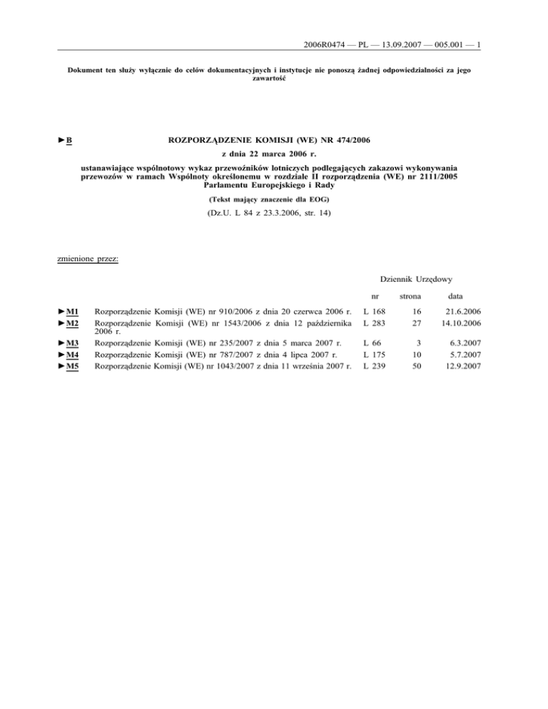 2006R0474 — PL — 13.09.2007 — 005.001 — 1 Dokument ten służy wyłącznie do celów dokumentacyjnych i instytucje nie ponoszą żadnej odpowiedzialności za jego zawartość ►B ROZPORZĄDZENIE KOMISJI (WE) NR 474/2006 z dnia 22 marca 2006 r. ustanawiające wspólnotowy wykaz przewoźników lotniczych podlegających zakazowi wykonywania przewozów w ramach Wspólnoty określonemu w rozdziale II rozporządzenia (WE) nr 2111/2005 Parlamentu Europejskiego i Rady (Tekst mający znaczenie dla EOG) (Dz.U. L 84 z 23.3.2006, str. 14) zmienione przez: Dziennik Urzędowy nr ►M1 ►M2 ►M3 ►M4 ►M5 Rozporządzenie Rozporządzenie 2006 r. Rozporządzenie Rozporządzenie Rozporządzenie strona data Komisji (WE) nr 910/2006 z dnia 20 czerwca 2006 r. Komisji (WE) nr 1543/2006 z dnia 12 października L 168 L 283 16 27 21.6.2006 14.10.2006 Komisji (WE) nr 235/2007 z dnia 5 marca 2007 r. Komisji (WE) nr 787/2007 z dnia 4 lipca 2007 r. Komisji (WE) nr 1043/2007 z dnia 11 września 2007 r. L 66 L 175 L 239 3 10 50 6.3.2007 5.7.2007 12.9.2007 2006R0474 — PL — 13.09.2007 — 005.001 — 2 ▼B ROZPORZĄDZENIE KOMISJI (WE) NR 474/2006 z dnia 22 marca 2006 r. ustanawiające wspólnotowy wykaz przewoźników lotniczych podlegających zakazowi wykonywania przewozów w ramach Wspólnoty określonemu w rozdziale II rozporządzenia (WE) nr 2111/2005 Parlamentu Europejskiego i Rady (Tekst mający znaczenie dla EOG) KOMISJA WSPÓLNOT EUROPEJSKICH, uwzględniając Traktat ustanawiający Wspólnotę Europejską, uwzględniając rozporządzenie (WE) nr 2111/2005 Parlamentu Europejskiego i Rady z dnia 14 grudnia 2005 r. w sprawie ustanowienia wspólnotowego wykazu przewoźników lotniczych podlegających zakazowi wykonywania przewozów w ramach Wspólnoty i informowania pasażerów korzystających z transportu lotniczego o tożsamości przewoźnika lotniczego wykonującego przewóz oraz uchylające art. 9 dyrektywy 2004/36/WE (1), w szczególności jego art. 3, a także mając na uwadze, co następuje: (1) Rozdział II rozporządzenia (WE) nr 2111/2005 (zwanego dalej „rozporządzeniem podstawowym”) określa procedury ustanowienia wspólnotowego wykazu przewoźników lotniczych podlegających zakazowi wykonywania przewozów w ramach Wspólnoty, jak również procedury zezwalające państwom członkowskim na przyjęcie w pewnych okolicznościach środków wyjątkowych nakładających zakaz na ich terytorium. (2) Zgodnie z art. 3 ust. 3 rozporządzenia podstawowego, każde państwo członkowskie przekazuje Komisji tożsamość przewoźników lotniczych podlegających zakazowi wykonywania przewozów na jego terytorium wraz z uzasadnieniem powodów nałożenia takich zakazów oraz wszelkimi innymi istotnymi informacjami. (3) Komisja poinformowała wszystkich zainteresowanych przewoźników lotniczych bezpośrednio, lub gdy było to niemożliwe, poprzez organy odpowiedzialne za nadzór regulacyjny, określając istotne fakty i względy, które stanowiłyby podstawę decyzji o nałożeniu zakazu wykonywania przewozów w ramach Wspólnoty. (4) Zgodnie z art. 7 rozporządzenia podstawowego, Komisja zapewniła przewoźnikom lotniczym możliwość zapoznania się z dokumentami dostarczonymi przez państwa członkowskie, aby mogli złożyć pisemne komentarze oraz dokonać ustnej prezentacji przed Komisją w terminie 10 dni roboczych oraz przed Komitetem ds. Bezpieczeństwa Lotniczego (2). (5) Załącznik do rozporządzenia podstawowego określa wspólne kryteria rozważenia zakazu wykonywania przewozów ze względów bezpieczeństwa na poziomie Wspólnoty. Air Bangladesh (6) Istnieją sprawdzone dowody istotnego naruszenia wymogów bezpieczeństwa przez Air Bangladesh w odniesieniu do określo- (1) Dz.U. L 344 z 27.12.2005, str. 15. (2) Ustanowiony na mocy art. 12 rozporządzenia Rady (EWG) nr 3922/91 z dnia 16 grudnia 1991 r. w sprawie harmonizacji wymagań technicznych i procedur administracyjnych w dziedzinie lotnictwa cywilnego (Dz.U. L 373 z 31.12.1991, str. 4). 2006R0474 — PL — 13.09.2007 — 005.001 — 3 ▼B nego samolotu należącego do ich floty. Naruszenie to zostało stwierdzone podczas kontroli na ziemi dokonanej przez Niemcy w ramach programu SAFA (1). (7) Air Bangladesh nie udzieliły odpowiedniej i terminowej odpowiedzi na pytania urzędu lotnictwa cywilnego Niemiec dotyczące bezpieczeństwa przewozów, wykazując brak przejrzystości lub komunikacji, czego dowodem jest brak odpowiedzi na korespondencję tego państwa członkowskiego. Do tej pory Niemcy nie miały okazji sprawdzenia, czy naruszenia bezpieczeństwa zostały wyeliminowane. (8) Organy odpowiedzialne w Bangladeszu za nadzór regulacyjny nad Air Bangladesh nie sprawowały odpowiedniego nadzoru nad określonym samolotem używanym przez przewoźnika w ramach obowiązków określonych przez konwencję chicagowską. (9) Dlatego na podstawie wspólnych kryteriów ocenia się, że linia lotnicza Air Bangladesh powinna zostać objęta ścisłym ograniczeniem wykonywania przewozów oraz zostać umieszczona w załączniku B. Air Koryo (10) Istnieją sprawdzone dowody istotnego naruszenia wymogów bezpieczeństwa przez Air Koryo. Naruszenie to zostało stwierdzone przez Francję i Niemcy podczas kontroli na ziemi dokonanych w ramach programu SAFA (2). (11) Podczas innych kontroli na ziemi dokonanych w ramach programu SAFA (3) odnotowano, że Air Koryo nadal nie eliminują naruszenia bezpieczeństwa zgłoszonego uprzednio przez Francję. (12) Uzasadnione i poważne informacje związane z danymi przypadkami, przekazane przez Francję, wskazują na utajone systematyczne naruszanie przez Air Koryo kwestii bezpieczeństwa. (13) Air Koryo wykazały brak zdolności zajęcia się tymi kwestiami bezpieczeństwa. (14) Air Koryo nie udzieliły odpowiedniej i terminowej odpowiedzi na pytania urzędu lotnictwa cywilnego Francji dotyczące bezpieczeństwa przewozów, wykazując brak przejrzystości lub komunikacji, czego dowodem jest brak odpowiedzi