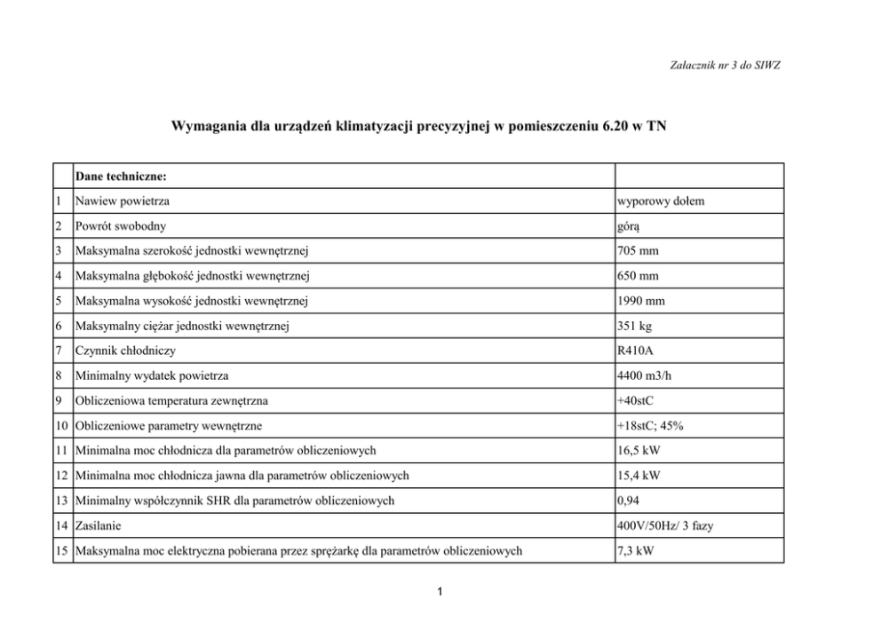 Załacznik nr 3 do SIWZ Wymagania dla urządzeń klimatyzacji precyzyjnej w pomieszczeniu 6.20 w TN Dane techniczne: 1 Nawiew powietrza wyporowy dołem 2 Powrót swobodny górą 3 Maksymalna szerokość jednostki wewnętrznej 705 mm 4 Maksymalna głębokość jednostki wewnętrznej 650 mm 5 Maksymalna wysokość jednostki wewnętrznej 1990 mm 6 Maksymalny ciężar jednostki wewnętrznej 351 kg 7 Czynnik chłodniczy R410A 8 Minimalny wydatek powietrza 4400 m3/h 9 Obliczeniowa temperatura zewnętrzna +40stC 10 Obliczeniowe parametry wewnętrzne +18stC; 45% 11 Minimalna moc chłodnicza dla parametrów obliczeniowych 16,5 kW 12 Minimalna moc chłodnicza jawna dla parametrów obliczeniowych 15,4 kW 13 Minimalny współczynnik SHR dla parametrów obliczeniowych 0,94 14 Zasilanie 400V/50Hz/ 3 fazy 15 Maksymalna moc elektryczna pobierana przez sprężarkę dla parametrów obliczeniowych 7,3 kW 1 16 Maksymalny prąd rozruchowy 15,5 A 17 Minimalna moc nagrzewnicy elektrycznej 7 kW 18 Minimalny wydatek nawilżacza parowego 3 kg/h 19 Maksymalny poziom ciśnienia akustycznego w odległości 2m od urządzenia 54 dB(A) Wyposażenie i funkcje: 20 Urządzenie z płynną regulacją wydajności chłodniczej z inwerterową sprężarką typu inwerter DC z wysokoefektywnym silnikiem BLDC 21 Obudowa jednostki wewnętrznej typu "sandwich" z izolacją termiczną z wełny mineralnej o grubości min. TAK 20mm i gęstości min. 30kg/m3 TAK 22 Sterownik swobodnie programowalny pCO5+ System komunikacji np. typu "SMART DUET" optymalizujący energetycznie współprace kilku urządzeń 23 inwerterowych zapewniający zwiększenie efektywności energetycznej wraz całoroczną analizą zużycia energii dla danych klimatycznych Warszawy TAK 24 Czujnik detekcji wody zamontowany pod urządzeniem TAK 25 Jeden obieg chłodniczy TAK 26 Wentylatory z płynną regulacją obrotów typu EC TAK 27 Elektroniczny zawór rozprężny TAK 28 Flity klasy EU4 TAK 29 Podstawa pod urządzenie 300mm TAK 30 Plenum nadmuchowe TAK 31 Kontrola zabrudzenia filtrów TAK 32 Układ osuszania powietrza TAK 2 33 Regulator ciśnienia skraplania zamontowany w jednostce wewnętrznej TAK 34 Certyfikat, jakości zgodny z ISO 9001:2008, 35 Deklaracja CE potwierdzająca wykonanie urządzenia zgodnie z normami: 2006/42/CE, 2004/108/CE, 2006/95/CE, EN: 60204 -1: 2006, EN: 61000-6-4: 2007, EN: 61000-6-2: 2006, EN ISO: 12100-2: 2009, EN ISO: 13857:2008, EN 349: 11/2008, Skraplacz zewnętrzny 36 Wymiary szafy nie większe niż (szer. gł. wys.) w mm 1800x760x670 37 Ciężar nie większy niż 56 kg 38 Max. poziom ciśnienia akustycznego w odległości 10m 44 [dB(A)] 39 Przepływ powietrza 11800 m3/h 40 Obliczeniowa temperatura zewnętrzna tz=+40stC 3