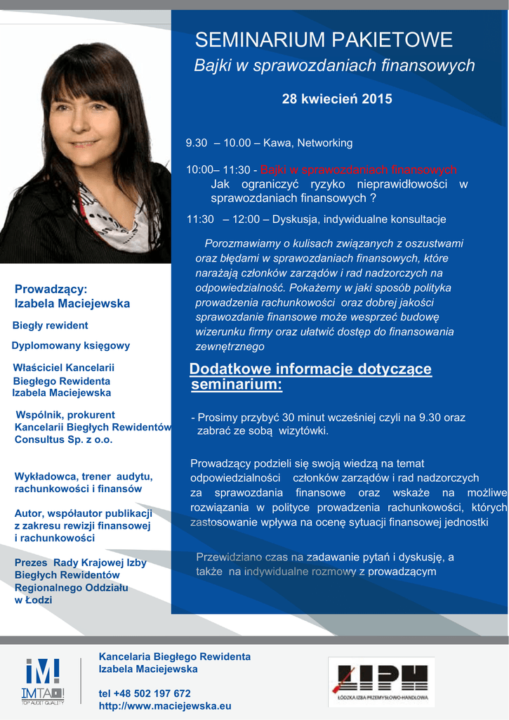 SEMINARIUM PAKIETOWE Bajki w sprawozdaniach finansowych 28 kwiecień 2015 9.30 – 10.00 – Kawa, Networking 10:00– 11:30 - Bajki w sprawozdaniach finansowych Jak ograniczyć ryzyko nieprawidłowości w sprawozdaniach finansowych ? 11:30 – 12:00 – Dyskusja, indywidualne konsultacje Prowadzący: Izabela Maciejewska Biegły rewident Dyplomowany księgowy Porozmawiamy o kulisach związanych z oszustwami oraz błędami w sprawozdaniach finansowych, które narażają członków zarządów i rad nadzorczych na odpowiedzialność. Pokażemy w jaki sposób polityka prowadzenia rachunkowości oraz dobrej jakości sprawozdanie finansowe może wesprzeć budowę wizerunku firmy oraz ułatwić dostęp do finansowania zewnętrznego Właściciel Kancelarii Biegłego Rewidenta Izabela Maciejewska Dodatkowe informacje dotyczące seminarium: Wspólnik, prokurent Kancelarii Biegłych Rewidentów Consultus Sp. z o.o. - Prosimy przybyć 30 minut wcześniej czyli na 9.30 oraz zabrać ze sobą wizytówki. Wykładowca, trener audytu, rachunkowości i finansów Autor, współautor publikacji z zakresu rewizji finansowej i rachunkowości Prezes Rady Krajowej Izby Biegłych Rewidentów Regionalnego Oddziału w Łodzi Prowadzący podzieli się swoją wiedzą na temat odpowiedzialności członków zarządów i rad nadzorczych za sprawozdania finansowe oraz wskaże na możliwe rozwiązania w polityce prowadzenia rachunkowości, których zastosowanie wpływa na ocenę sytuacji finansowej jednostki Przewidziano czas na zadawanie pytań i dyskusję, a także na indywidualne rozmowy z prowadzącym Kancelaria Biegłego Rewidenta Izabela Maciejewska tel +48 502 197 672 http://www.maciejewska.eu