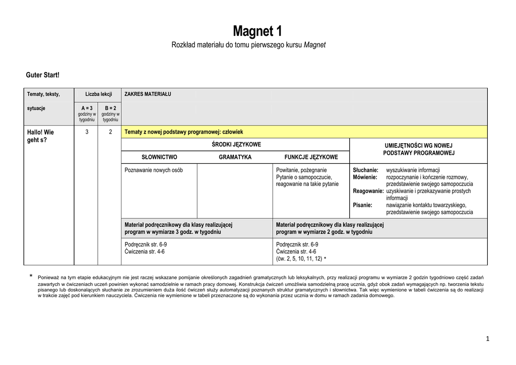 Magnet 1 Rozkład materiału do tomu pierwszego kursu Magnet Guter Start! Tematy, teksty, sytuacje Hallo! Wie geht s? Liczba lekcji A=3 ZAKRES MATERIAŁU B=2 godziny w tygodniu godziny w tygodniu 3 2 Tematy z nowej podstawy programowej: człowiek ŚRODKI JĘZYKOWE SŁOWNICTWO * GRAMATYKA UMIEJĘTNOŚCI WG NOWEJ PODSTAWY PROGRAMOWEJ FUNKCJE JĘZYKOWE Poznawanie nowych osób Powitanie, pożegnanie Pytanie o samopoczucie, reagowanie na takie pytanie Materiał podręcznikowy dla klasy realizującej program w wymiarze 3 godz. w tygodniu Materiał podręcznikowy dla klasy realizującej program w wymiarze 2 godz. w tygodniu Podręcznik str. 6-9 Ćwiczenia str. 4-6 Podręcznik str. 6-9 Ćwiczenia str. 4-6 (ćw. 2, 5, 10, 11, 12) * Słuchanie: Mówienie: wyszukiwanie informacji rozpoczynanie i kończenie rozmowy, przedstawienie swojego samopoczucia Reagowanie: uzyskiwanie i przekazywanie prostych informacji Pisanie: nawiązanie kontaktu towarzyskiego, przedstawienie swojego samopoczucia Ponieważ na tym etapie edukacyjnym nie jest raczej wskazane pomijanie określonych zagadnień gramatycznych lub leksykalnych, przy realizacji programu w wymiarze 2 godzin tygodniowo część zadań zawartych w ćwiczeniach uczeń powinien wykonać samodzielnie w ramach pracy domowej. Konstrukcja ćwiczeń umożliwia samodzielną pracę ucznia, gdyż obok zadań wymagających np. tworzenia tekstu pisanego lub doskonalących słuchanie ze zrozumieniem duża ilość ćwiczeń służy automatyzacji poznanych struktur gramatycznych i słownictwa. Tak więc wymienione w tabeli ćwiczenia są do realizacji w trakcie zajęć pod kierunkiem nauczyciela. Ćwiczenia nie wymienione w tabeli przeznaczone są do wykonania przez ucznia w domu w ramach zadania domowego. 1 Tematy, teksty, sytuacje Eins, zwei, drei Liczba lekcji A=3 ZAKRES MATERIAŁU B=2 godziny w tygodniu godziny w tygodniu 4 3 Tematy z nowej podstawy programowej: człowiek, zakupy, usługi ŚRODKI JĘZYKOWE SŁOWNICTWO Liczby 1-20 Informacje o osobie (numer telefonu) Ceny produktów Tematy, teksty, sytuacje Was ist das? Liczba lekcji A B 3 2 GRAMATYKA FUNKCJE JĘZYKOWE Szyk zdania prostego i pytającego Rozpoznawanie i stosowanie liczebników od 1-20 Określenie cen UMIEJĘTNOŚCI WG NOWEJ PODSTAWY PROGRAMOWEJ Słuchanie: wyszukiwanie informacji, Reagowanie: uzyskiwanie i przekazywanie prostych informacji Materiał podręcznikowy dla klasy realizującej program w wymiarze 3 godz. w tygodniu Materiał podręcznikowy dla klasy realizującej program w wymiarze 2 godz. w tygodniu Podręcznik str. 10-12 Ćwiczenia str. 7-9 Podręcznik str. 10-12 Ćwiczenia str. 7-9 (ćw. 18, 20, 22, 23) ZAKRES MATERIAŁU Tematy z nowej podstawy programowej: człowiek ŚRODKI JĘZYKOWE SŁOWNICTWO GRAMATYKA FUNKCJE JĘZYKOWE UMIEJĘTNOŚCI WG NOWEJ PODSTAWY PROGRAMOWEJ Nazwy przedmiotów i ich cechy Rodzajnik określony Kolory i nieokreślony w mianowniku Przeczenie kein Identyfikowanie, opisywanie przedmiotów Materiał podręcznikowy dla klasy realizującej program w wymiarze 3 godz. w tygodniu Materiał podręcznikowy dla klasy realizującej program w wymiarze 2 godz. w tygodniu Podręcznik str. 13-15 Ćwiczenia str. 10-13 Podręcznik str. 13-15 Ćwiczenia str. 10-13 (ćw. 28, 33, 34) Słuchanie: wyszukiwanie informacji Mówienie: nazywanie przedmiotów i ich opisywanie 2 Tematy, teksty, sytuacje Liczba lekcji A=3 godziny w tygodniu Infobox Landeskunde 1 ZAKRES MATERIAŁU B=2 godziny w tygodniu 1 Tematy z nowej podstawy programowej: człowiek, elementy wiedzy o krajach niemieckojęzycznych ŚRODKI JĘZYKOWE UMIEJĘTNOŚCI WG NOWEJ PODSTAWY PROGRAMOWEJ SŁOWNICTWO GRAMATYKA FUNKCJE JĘZYKOWE Rozdział 1 Tematy, teksty, sytuacje Ich wohne in Berlin Regionalne powitania i pożegnania Powitania i pożegnania Czytanie: wyszukiwanie w tekście określonych informacji Materiał podręcznikowy dla klasy realizującej program w wymiarze 3 godz. w tygodniu Materiał podręcznikowy dla klasy realizującej program w wymiarze 2 godz. w tygodniu Podręcznik str. 16 Podręcznik str. 16 Das bin ich Liczba lekcji A B 3 2 ZAKRES MATERIAŁU Tematy z nowej podstawy programowej: dom, elementy wiedzy o krajach niemieckojęzycznych ŚRODKI JĘZYKOWE SŁOWNICTWO GRAMATYKA FUNKCJE JĘZYKOWE Dane osobowe Nazwy geograficzne (państwa) Odmiana czasowników w liczbie pojedynczej Zdania pytające i oznajmujące Opisywanie siebie i innych imię, nazwisko, wiek, miejsce zamieszkania UMIEJĘTNOŚCI WG NOWEJ PODSTAWY PROGRAMOWEJ Czytanie: wyszukiwanie informacji Reagowanie: uzyskiwanie i udzielanie prostych informacji Pisanie: uzupełnianie dialogów Materiał podręcznikowy dla klasy realizującej program w wymiarze 3 godz. w tygodniu Materiał podręcznikowy dla klasy realizującej program w wymiarze 2 godz. w tygodniu Podręcznik str. 18-20 Ćwiczenia str. 16-17 Podręcznik str. 18-20 Ćwiczenia str. 16-17 (ćw. 3, 5) 3 Tematy, teksty, sytuacje Wo liegt Hamburg? Liczba lekcji A B 3 2 ZAKRES MATERIAŁU Tematy z nowej podstawy programowej: dom, elementy wiedzy o krajach niemickojęzycznych ŚRODKI JĘZYKOWE SŁOWNICTWO Nazwy geograficzne krajów Tematy, teksty, sytuacje Wie ist deine Adresse? Liczba lekcji A B 3 2 GRAMATYKA UMIEJĘTNOŚCI WG NOWEJ PODSTAWY PROGRAMOWEJ FUNKCJE JĘZYKOWE Zdania pytające i oznajmujące Zaimki osobowe w liczbie pojedynczej Określenie położenia miast krajów DACH Pytanie o pochodzenie i miejsce zamieszkania Czytanie: wyszukiwanie informacji, stwierdzanie czy informacja jest prawdziwa czy fałszywa Słuchanie: wyszukiwanie informacji Mówienie: pytanie o pochodzenie i miejsce zamieszkania, przekazywanie informacji zawartych w materiałach wizualnych (mapa) Pisanie: uzupełnianie dialogów, Materiał podręcznikowy dla klasy realizującej program w wymiarze 3 godz. w tygodniu Materiał podręcznikowy dla klasy realizującej program w wymiarze 2 godz. w tygodniu Podręcznik str. 21-23 Ćwiczenia str. 17-18 Podręcznik str. 21-23 Ćwiczenia str. 17-18 (ćw. 6, 8) ZAKRES MATERIAŁU Tema