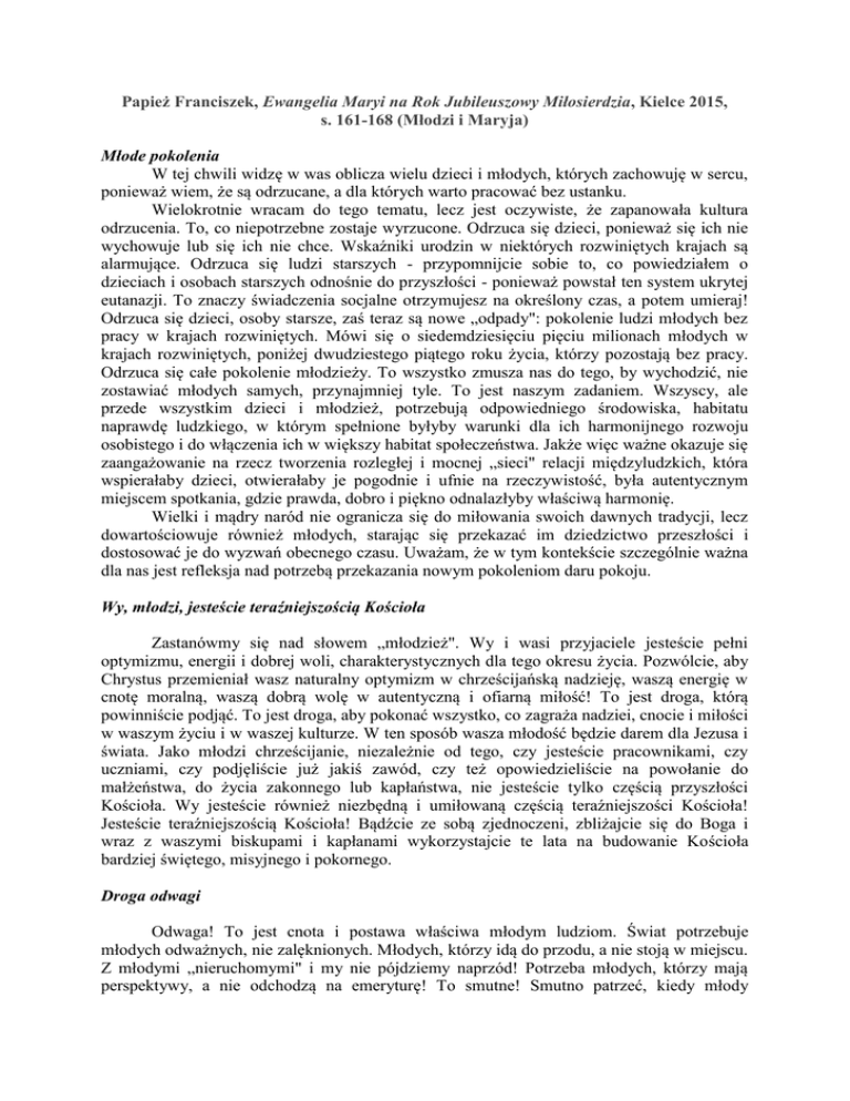 Papież Franciszek, Ewangelia Maryi na Rok Jubileuszowy Miłosierdzia, Kielce 2015, s. 161-168 (Młodzi i Maryja) Młode pokolenia W tej chwili widzę w was oblicza wielu dzieci i młodych, których zachowuję w sercu, ponieważ wiem, że są odrzucane, a dla których warto pracować bez ustanku. Wielokrotnie wracam do tego tematu, lecz jest oczywiste, że zapanowała kultura odrzucenia. To, co niepotrzebne zostaje wyrzucone. Odrzuca się dzieci, ponieważ się ich nie wychowuje lub się ich nie chce. Wskaźniki urodzin w niektórych rozwiniętych krajach są alarmujące. Odrzuca się ludzi starszych - przypomnijcie sobie to, co powiedziałem o dzieciach i osobach starszych odnośnie do przyszłości - ponieważ powstał ten system ukrytej eutanazji. To znaczy świadczenia socjalne otrzymujesz na określony czas, a potem umieraj! Odrzuca się dzieci, osoby starsze, zaś teraz są nowe „odpady": pokolenie ludzi młodych bez pracy w krajach rozwiniętych. Mówi się o siedemdziesięciu pięciu milionach młodych w krajach rozwiniętych, poniżej dwudziestego piątego roku życia, którzy pozostają bez pracy. Odrzuca się całe pokolenie młodzieży. To wszystko zmusza nas do tego, by wychodzić, nie zostawiać młodych samych, przynajmniej tyle. To jest naszym zadaniem. Wszyscy, ale przede wszystkim dzieci i młodzież, potrzebują odpowiedniego środowiska, habitatu naprawdę ludzkiego, w którym spełnione byłyby warunki dla ich harmonijnego rozwoju osobistego i do włączenia ich w większy habitat społeczeństwa. Jakże więc ważne okazuje się zaangażowanie na rzecz tworzenia rozległej i mocnej „sieci" relacji międzyludzkich, która wspierałaby dzieci, otwierałaby je pogodnie i ufnie na rzeczywistość, była autentycznym miejscem spotkania, gdzie prawda, dobro i piękno odnalazłyby właściwą harmonię. Wielki i mądry naród nie ogranicza się do miłowania swoich dawnych tradycji, lecz dowartościowuje również młodych, starając się przekazać im dziedzictwo przeszłości i dostosować je do wyzwań obecnego czasu. Uważam, że w tym kontekście szczególnie ważna dla nas jest refleksja nad potrzebą przekazania nowym pokoleniom daru pokoju. Wy, młodzi, jesteście teraźniejszością Kościoła Zastanówmy się nad słowem „młodzież". Wy i wasi przyjaciele jesteście pełni optymizmu, energii i dobrej woli, charakterystycznych dla tego okresu życia. Pozwólcie, aby Chrystus przemieniał wasz naturalny optymizm w chrześcijańską nadzieję, waszą energię w cnotę moralną, waszą dobrą wolę w autentyczną i ofiarną miłość! To jest droga, którą powinniście podjąć. To jest droga, aby pokonać wszystko, co zagraża nadziei, cnocie i miłości w waszym życiu i w waszej kulturze. W ten sposób wasza młodość będzie darem dla Jezusa i świata. Jako młodzi chrześcijanie, niezależnie od tego, czy jesteście pracownikami, czy uczniami, czy podjęliście już jakiś zawód, czy też opowiedzieliście na powołanie do małżeństwa, do życia zakonnego lub kapłaństwa, nie jesteście tylko częścią przyszłości Kościoła. Wy jesteście również niezbędną i umiłowaną częścią teraźniejszości Kościoła! Jesteście teraźniejszością Kościoła! Bądźcie ze sobą zjednoczeni, zbliżajcie się do Boga i wraz z waszymi biskupami i kapłanami wykorzystajcie te lata na budowanie Kościoła bardziej świętego, misyjnego i pokornego. Droga odwagi Odwaga! To jest cnota i postawa właściwa młodym ludziom. Świat potrzebuje młodych odważnych, nie zalęknionych. Młodych, którzy idą do przodu, a nie stoją w miejscu. Z młodymi „nieruchomymi" i my nie pójdziemy naprzód! Potrzeba młodych, którzy mają perspektywy, a nie odchodzą na emeryturę! To smutne! Smutno patrzeć, kiedy młody zachowuje się jak emeryt. Nie, młody człowiek musi iść naprzód po drogach odwagi. Naprzód! Tak zwyciężycie i pomożecie zmienić ten świat, uczynić go dużo lepszym. To jest wasze zadanie: stworzyć nowe miasto. Zatem budujcie stale to nowe miasto - z prawdą, dobrocią, pięknem, które Pan nam dał. Nie lękajcie się, nie pozwólcie sobie wykraść nadziei. Życie do was należy! Ma w was rozkwitnąć i wydać owoc dla wszystkich. Ludzkość patrzy na nas i patrzy także na was na tej odważnej drodze. I pamiętajcie: emerytura zaczyna się w wieku sześćdziesięciu pięciu lat! Młody człowiek nie może iść na emeryturę, nigdy! On musi z odwagą iść naprzód. Dążcie do wielkich rzeczy Serce człowieka dąży do wielkich rzeczy, do istotnych wartości, do głębokich przyjaźni, do więzi, które w życiowych próbach umacniają się, zamiast się zrywać. Człowiek dąży do kochania i bycia kochanym. To jest nasze najgłębsze dążenie: kochać i być kochanym - i to na zawsze! Kultura tego, co prowizoryczne nie uwydatnia naszej wolności, ale pozbawia nas naszego prawdziwego przeznaczenia, najbardziej prawdziwych i autentycznych celów. Jest życiem rozbitym na kawałki. Nie pozwólcie sobie odebrać pragnienia budowania w waszym życiu rzeczy wielkich i trwałych! To właśnie niesie was naprzód. Nie zadowalajcie się małymi celami! Dążcie do szczęścia, miejcie do tego odwagę, odwagę wyjścia poza siebie, zaryzykowania w pełni waszej przyszłości razem z Jezusem. Sami nic nie możemy. Wobec presji wydarzeń i mód sami nigdy nie zdołamy znaleźć właściwej drogi, a nawet gdybyśmy ją znaleźli, nie będziemy mieć wystarczającej siły, by na niej wytrwać, by zmierzyć się z wchodzeniem pod górę i nieprzewidzianymi przeszkodami, l tu pojawia się wezwanie Pana Jezusa: „Jeśli chcesz... pójdź za Mną". On zaprasza nas, aby nam towarzyszyć w drodze, nie po to, by nas wykorzystać albo uczynić z nas niewolników, lecz by nas wyzwolić. W tej wolności zaprasza nas, aby nam towarzyszyć w drodze. Tak jest! Tylko razem z Jezusem, modląc się do Niego i idąc za Nim, odnajdujemy jasność wizji i siłę d