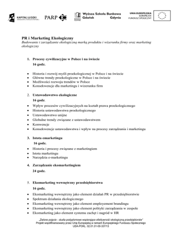 PR i Marketing Ekologiczny Budowanie i zarządzanie ekologiczną marką produktu i wizerunku firmy oraz marketing ekologiczny 1. Procesy cywilizacyjne w Polsce i na świecie 16 godz. Historia i rozwój myśli proekologicznej w Polsce i na świecie Główne trendy proekologiczne w Polsce i na świecie Możliwości rozwoju trendów w Polsce Konsekwencje dla marketingu i wizerunku firm 2. Ustawodawstwo ekologiczne 16 godz. Wpływ procesów cywilizacyjnych na kształt prawa proekologicznego Historia ustawodawstwa proekologicznego Ustawodawstwo unijne Globalne trendy związane z ustawodawstwem Konwencje Konsekwencje ustawodawstwa i wpływ na procesy zarządzania i marketingu 3. Istota emarketingu 16 godz. Historia i procesy związane z marketingiem Istota marketingu Narzędzia e-marketingu 4. Zarządzanie ekomarketingiem 24 godz. 5. Ekomarketing wewnętrzny przedsiębiorstwa 16 godz. Ekomarketing wewnętrzny jako element działań PR w przedsiębiorstwie Spektrum działania ekologicznego Ekomarketing wewnętrzny jako element employement brandingu Ekomarketing wewnętrzny jako element polityki zarządzania w zespole Ekomarketing jako element systemu zachęt i nagród w HR „Zielone pojęcie - studia podyplomowe wspierające efektywność ekologiczną przedsiębiorstw” Projekt współfinansowany przez Unię Europejską w ramach Europejskiego Funduszu Społecznego UDA-POKL. 02.01.01-00-337/13 6. Ekoreklama i Eko PR 24 godz. Promocja i reklama – podstawowe założenia i trendy we współczesnym świecie Promocja i reklama – podstawy i miejsce w strategii marketingowej Ekoreklama – warsztat komunikacji marketingowej Eko PR – podstawowe założenia i trendy Eko PR – warsztat 7. Innowacyjne koncepcje związane z ekomarketingiem 16 godz. Ekomarketing jako część polityki przedsiębiorstwa Ekomarketing jako strategia w startupach Ekorozwiązania w tzw. Internet of Things Rozwiązania związane z wearable technology Warsztat tworzenia Value proposition w duchu ekomarketingu 8. Ochrona środowiska w gospodarce 16 godz. Rozwiązania wspierające rozwiązania proekologiczne Gospodarka zarządzania materiałami i zasobami Rynek energii odnawialnej Rynek marek ekologicznych 9. Strategia ekologiczna przedsiębiorstw 24 godz. Zmiana profilu przedsiębiorstwa i strategii marketingowej Komunikowanie marketingowe zmian 10. Seminarium dyplomowe 4 godz. „Zielone pojęcie - studia podyplomowe wspierające efektywność ekologiczną przedsiębiorstw” Projekt współfinansowany przez Unię Europejską w ramach Europejskiego Funduszu Społecznego UDA-POKL. 02.01.01-00-337/13