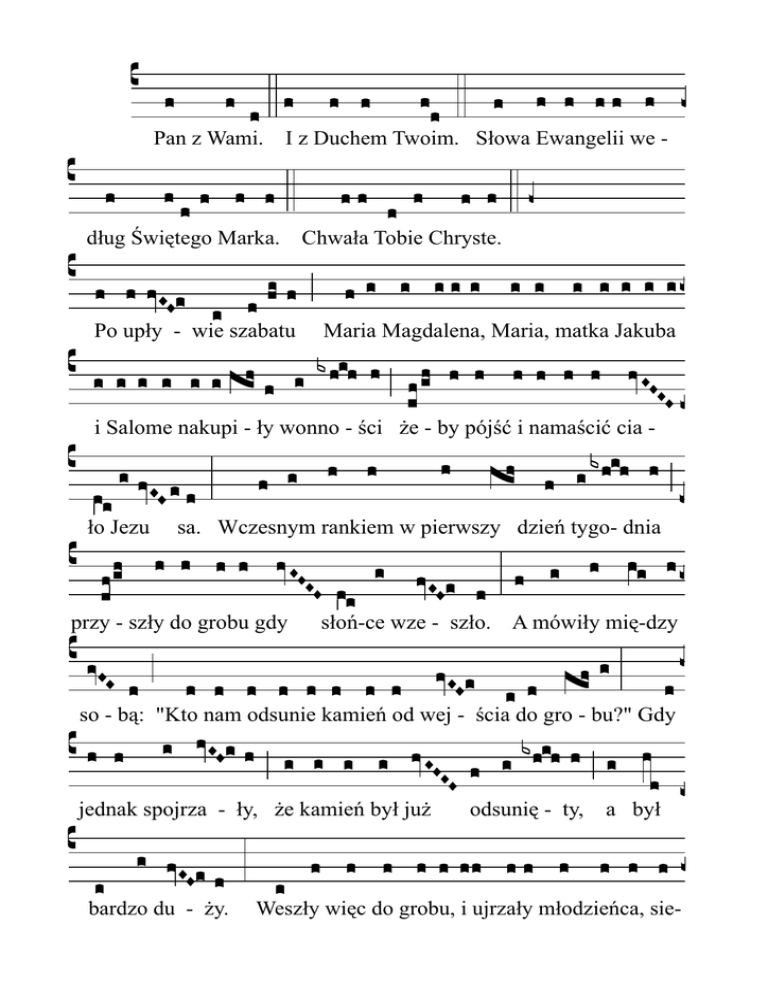 Pan z Wami. I z Duchem Twoim. S³owa Ewangelii we - d³ug Œwiêtego Marka. Po up³y - wie szabatu Chwa³a Tobie Chryste. Maria Magdalena, Maria, matka Jakuba i Salome nakupi - ³y wonno - œci ¿e - by pójœæ i namaœciæ cia - ³o Jezu sa. Wczesnym rankiem w pierwszy dzieñ tygo- dnia przy - sz³y do grobu gdy s³oñ-ce wze - sz³o. A mówi³y miê-dzy so - b¹: "Kto nam odsunie kamieñ od wej - œcia do gro - bu?" Gdy jednak spojrza - ³y, ¿e kamieñ by³ ju¿ bardzo du - ¿y. odsuniê - ty, a by³ Wesz³y wiêc do grobu, i ujrza³y m³odzieñca, sie- dz¹cego po prawej stronie ubranego w bia - ³¹ sza - tê i bar- dzo siê prze - straszy - ³y. Lecz on rzek³ do nich: "Nie bój- cie siê. Szukacie Jezusa z Nazaretu, ukrzy¿owane - go, powsta³ nie ma go tu - taj. O - to miejsce gdzie Go z³o¿y - li Lecz idŸcie powiedzcie Jego uczniom i Piotro - wi: Idzie przed wa- mi do Ga-li-le - i, tam Go ujrzy - cie, One wysz³y i uciek³y od gro-bu; jak wam powie - dzia³." ogarnê³o je bowiem zdumie - nie i prze - strach. Ni - komu te¿ nic nie o - znajmi³y, bo siê ba - ³y. Oto S³owo Pañ - skie. Chwa³a Tobie Chry - ste.