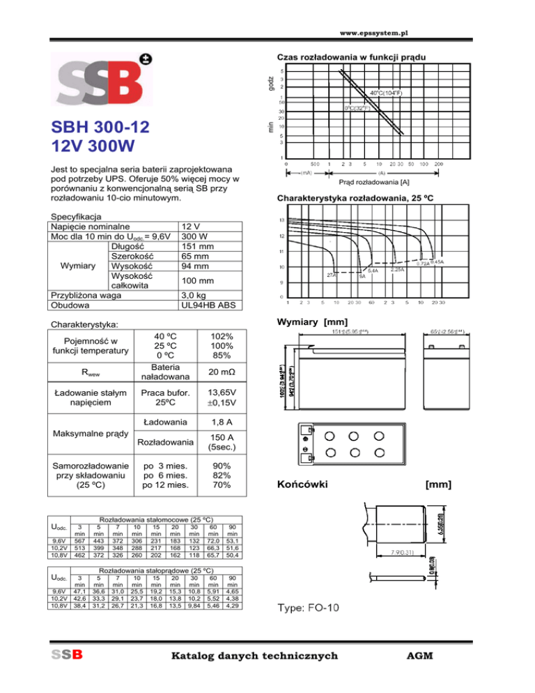 www.epssystem.pl godz Czas rozładowania w funkcji prądu min SBH 300-12 12V 300W Jest to specjalna seria baterii zaprojektowana pod potrzeby UPS. Oferuje 50% więcej mocy w porównaniu z konwencjonalną serią SB przy rozładowaniu 10-cio minutowym. Specyfikacja Napięcie nominalne Moc dla 10 min do Uodc.= 9,6V Długość Szerokość Wymiary Wysokość Wysokość całkowita Przybliżona waga Obudowa 100 mm 3,0 kg UL94HB ABS Wymiary [mm] Rwew 40 ºC 25 ºC 0 ºC Bateria naładowana Ładowanie stałym napięciem Praca bufor. 25ºC 13,65V ±0,15V Ładowania 1,8 A Rozładowania 150 A (5sec.) po 3 mies. po 6 mies. po 12 mies. 90% 82% 70% Maksymalne prądy Samorozładowanie przy składowaniu (25 ºC) Uodc. 102% 100% 85% 20 mΩ Końcówki [mm] Rozładowania stałomocowe (25 ºC) 3 min 567 513 462 5 min 443 399 372 3 min 9,6V 47,1 10,2V 42,6 10,8V 38,4 5 min 36,6 33,3 31,2 9,6V 10,2V 10,8V Charakterystyka rozładowania, 25 ºC 12 V 300 W 151 mm 65 mm 94 mm Charakterystyka: Pojemność w funkcji temperatury Prąd rozładowania [A] Uodc. SSB 7 min 372 348 326 10 min 306 288 260 15 min 231 217 202 20 min 183 168 162 30 min 132 123 118 60 min 72,0 66,3 65,7 90 min 53,1 51,6 50,4 Rozładowania stałoprądowe (25 ºC) 7 min 31,0 29,1 26,7 10 min 25,5 23,7 21,3 15 min 19,2 18,0 16,8 20 min 15,3 13,8 13,5 30 min 10,8 10,2 9,84 60 min 5,91 5,52 5,46 90 min 4,65 4,38 4,29 Katalog danych technicznych AGM