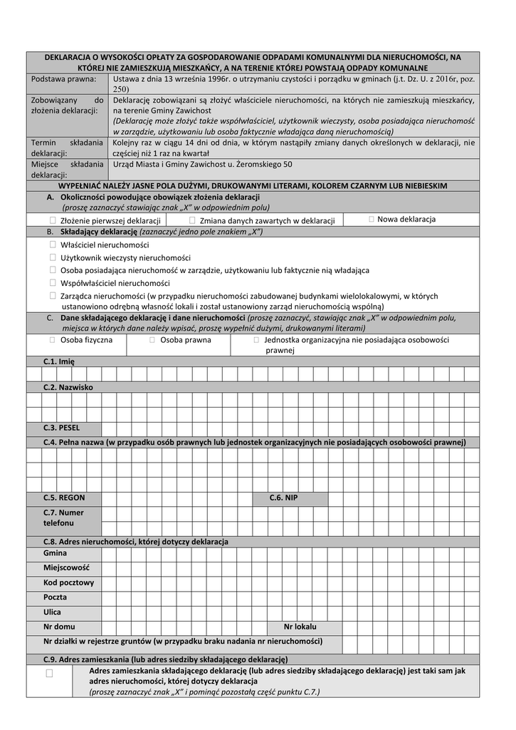 DEKLARACJA O WYSOKOŚCI OPŁATY ZA GOSPODAROWANIE ODPADAMI KOMUNALNYMI DLA NIERUCHOMOŚCI, NA KTÓREJ NIE ZAMIESZKUJĄ MIESZKAŃCY, A NA TERENIE KTÓREJ POWSTAJĄ ODPADY KOMUNALNE Podstawa prawna: Ustawa z dnia 13 września 1996r. o utrzymaniu czystości i porządku w gminach (j.t. Dz. U. z 2016r, poz. 250) Zobowiązany do Deklarację zobowiązani są złożyć właściciele nieruchomości, na których nie zamieszkują mieszkańcy, złożenia deklaracji: na terenie Gminy Zawichost (Deklarację może złożyć także współwłaściciel, użytkownik wieczysty, osoba posiadająca nieruchomość w zarządzie, użytkowaniu lub osoba faktycznie władająca daną nieruchomością) Termin składania Kolejny raz w ciągu 14 dni od dnia, w którym nastąpiły zmiany danych określonych w deklaracji, nie deklaracji: częściej niż 1 raz na kwartał Miejsce składania Urząd Miasta i Gminy Zawichost u. Żeromskiego 50 deklaracji: WYPEŁNIAĆ NALEŻY JASNE POLA DUŻYMI, DRUKOWANYMI LITERAMI, KOLOREM CZARNYM LUB NIEBIESKIM A. Okoliczności powodujące obowiązek złożenia deklaracji (proszę zaznaczyć stawiając znak „X” w odpowiednim polu) Nowa deklaracja Złożenie pierwszej deklaracji Zmiana danych zawartych w deklaracji B. Składający deklarację (zaznaczyć jedno pole znakiem „X”) Właściciel nieruchomości Użytkownik wieczysty nieruchomości Osoba posiadająca nieruchomość w zarządzie, użytkowaniu lub faktycznie nią władająca Współwłaściciel nieruchomości Zarządca nieruchomości (w przypadku nieruchomości zabudowanej budynkami wielolokalowymi, w których ustanowiono odrębną własność lokali i został ustanowiony zarząd nieruchomością wspólną) C. Dane składającego deklarację i dane nieruchomości (proszę zaznaczyć, stawiając znak „X” w odpowiednim polu, miejsca w których dane należy wpisać, proszę wypełnić dużymi, drukowanymi literami) Osoba fizyczna Osoba prawna Jednostka organizacyjna nie posiadająca osobowości prawnej C.1. Imię C.2. Nazwisko C.3. PESEL C.4. Pełna nazwa (w przypadku osób prawnych lub jednostek organizacyjnych nie posiadających osobowości prawnej) C.5. REGON C.6. NIP C.7. Numer telefonu C.8. Adres nieruchomości, której dotyczy deklaracja Gmina Miejscowość Kod pocztowy Poczta Ulica Nr domu Nr lokalu Nr działki w rejestrze gruntów (w przypadku braku nadania nr nieruchomości) C.9. Adres zamieszkania (lub adres siedziby składającego deklarację) Adres zamieszkania składającego deklarację (lub adres siedziby składającego deklarację) jest taki sam jak adres nieruchomości, której dotyczy deklaracja (proszę zaznaczyć znak „X” i pominąć pozostałą część punktu C.7.) Gmina Miejscowość Kod pocztowy Poczta Ulica Nr domu Nr lokalu D. Dane na temat sposobu zbierania i magazynowania odpadów D.1. Sposób zbierania odpadów Odpady komunalne będą zbierane w sposób selektywny zgodnie z regulaminem utrzymania czystości i porządku na terenie gminy ………………………. D.2. Sposób magazynowania odpadów Pojemniki przeznaczone wyłącznie dla składającego deklarację Odpady komunalne nie będą zbierane w sposób selektywny Boks śmietnikowy, altana śmietnikowa, plac (np. w przypadku kilku podmiotów korzystających z jednego boksu, altany, placu) Adres, lokalizacja boksu, altany, placu E. Opłata za gospodarowanie odpadami komunalnymi (dotyczy ilości pojemników danego rodzaju dla odpadów komunalnych) E.1. Ilość pojemników (lub worków) przeznaczona do magazynowania odpadów, przy określonej częstotliwości opróżniania (należy wpisać ilość pojemników lub worków jaka będzie ustawiona na terenie nieruchomości, której dotyczy deklaracja) Częstotliwość opróżniania – …………………………. Częstotliwość opróżniania – ……………………………. Deklaruję następującą ilość 60l Deklaruję następującą ilość 60l pojemników (worków) pojemników (worków) 120l 120l przeznaczonych do przeznaczonych do 240l magazynowania zmieszanych magazynowania odpadów odpadów komunalnych surowcowych (suchych) 1100l E.2.Wysokość opłaty miesięcznej za pojemnik o określonej pojemności Na zmieszane odpady komunalne Stawki opłat w przypadku Stawki opłat w przypadku braku selektywnej zbiórki odpadów selektywnej zbiórki odpadów Worek lub pojemnik 60l 120l 240l 1100l Na odpady surowcowe (suche) Stawki opłat w przypadku selektywnej zbiórki odpadów Worek 60l 120l E.3. Obliczenie stawki opłaty miesięcznej dla nieruchomości, na której nie zamieszkują mieszkańcy (kwotę należy podać w złotych polskich z dokładnością do dwóch miejsc po przecinku) Zmieszane odpady komunalne Stawka opłaty z pkt. Ilość pojemników z E.2. pkt. E.1. Worek lub pojemnik 60l * = 120l * = 240l * = 1100l * Stawka opłaty z pkt. E.2. = Odpady surowcowe (suche) Ilość pojemników z pkt. E.1. Worek 60l * = 120l * = Razem: Wysokość opłaty za gospodarowanie odpadami komunalnymi (opłata do zapłaty) obliczona samodzielnie przez składającego deklarację, zgodnie ze złożoną deklaracją, ponoszona będzie zgodnie z uchwałą Rady Gminy z dn. ……………… o terminie, częstotliwości i trybie uiszczania opłaty od mieszkańców – uchwała nr ……………….. F. Oświadczenia i podpis składającego deklarację 1. Deklaracja stanowi podstawę do wystawienia tytułu wykonawczego, zgodnie z przepisami ustawy z 17 czerwca 1966 r. o postępowaniu egzekucyjnym w administracji (j.t. Dz. U. z 2016 r. poz. 599) ………………………………… podpis G. Pouczenie Zgodnie z art. 6 m ustawy z dnia 13 września 1996r. o utrzymaniu czystości i porządku w gminach (j.t. Dz. U. z 2016r, poz. 250) właściciel nieruchomości jest obowiązany złożyć do wójta, burmistrza lub prezydenta miasta deklarację o wysokości opłaty za gospodarowanie odpadami komunalnymi w terminie 14 dni od dnia zamieszkania na danej nieruchomości pierwszego mieszkańca lub powstani