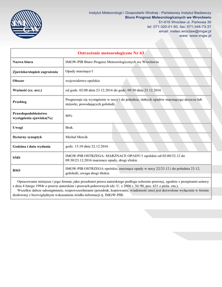 Instytut Meteorologii i Gospodarki Wodnej - Państwowy Instytut Badawczy Biuro Prognoz Meteorologicznych we Wrocławiu 51-616 Wrocław ul. Parkowa 30 tel: 071-320-01-50, fax: 071-348-73-37 email: [email protected] www: www.imgw.pl Ostrzeżenie meteorologiczne Nr 63 Nazwa biura IMGW-PIB Biuro Prognoz Meteorologicznych we Wrocławiu Zjawisko/stopień zagrożenia Opady marznące/1 Obszar województwo opolskie Ważność (cz. urz.) od godz. 02:00 dnia 23.12.2016 do godz. 09:30 dnia 23.12.2016 Przebieg Prognozuje się wystąpienie w nocy i do południa, słabych opadów marznącego deszczu lub mżawki, powodujących gołoledź. Prawdopodobieństwo wystąpienia zjawiska(%) 80% Uwagi Brak. Dyżurny synoptyk Michał Mercik Godzina i data wydania godz. 13:10 dnia 22.12.2016 SMS IMGW-PIB OSTRZEGA: MARZNACE OPADY/1 opolskie od 02:00/23.12 do 09:30/23.12.2016 marznace opady, drogi sliskie RSO IMGW-PIB OSTRZEGA opolskie, marznące opady w nocy 22/23.12 i do południa 23.12, gołoledź, uwaga drogi śliskie. Opracowanie niniejsze i jego format, jako przedmiot prawa autorskiego podlega ochronie prawnej, zgodnie z przepisami ustawy z dnia 4 lutego 1994r o prawie autorskim i prawach pokrewnych (dz. U. z 2006 r. Nr 90, poz. 631 z późn. zm.). Wszelkie dalsze udostępnianie, rozpowszechnianie (przedruk, kopiowanie, wiadomość sms) jest dozwolone wyłącznie w formie dosłownej z bezwzględnym wskazaniem źródła informacji tj. IMGW-PIB.