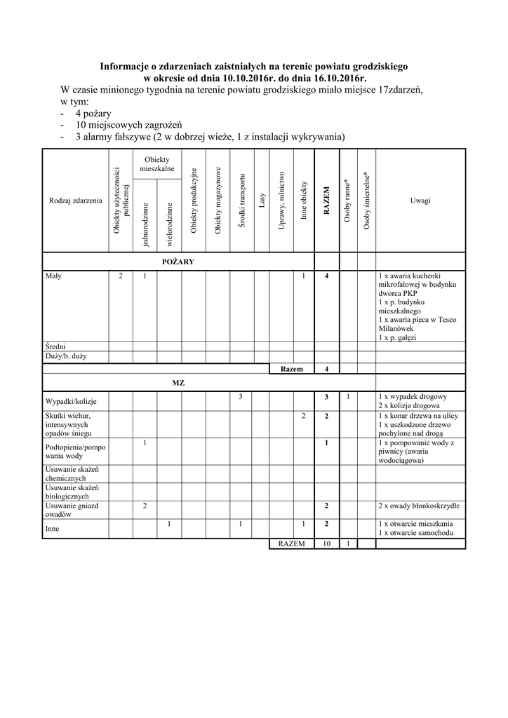 4 Osoby śmiertelne* RAZEM 1 Osoby ranne* Inne obiekty Uprawy, rolnictwo Lasy Środki transportu Obiekty magazynowe Obiekty produkcyjne wielorodzinne Obiekty mieszkalne jednorodzinne Rodzaj zdarzenia Obiekty użyteczności publicznej Informacje o zdarzeniach zaistniałych na terenie powiatu grodziskiego w okresie od dnia 10.10.2016r. do dnia 16.10.2016r. W czasie minionego tygodnia na terenie powiatu grodziskiego miało miejsce 17zdarzeń, w tym: - 4 pożary - 10 miejscowych zagrożeń - 3 alarmy fałszywe (2 w dobrzej wieże, 1 z instalacji wykrywania) Uwagi POŻARY Mały 2 1 1 x awaria kuchenki mikrofalowej w budynku dworca PKP 1 x p. budynku mieszkalnego 1 x awaria pieca w Tesco Milanówek 1 x p. gałęzi Średni Duży/b. duży Razem 4 MZ 3 Wypadki/kolizje Skutki wichur, intensywnych opadów śniegu Podtopienia/pompo wania wody Usuwanie skażeń chemicznych Usuwanie skażeń biologicznych Usuwanie gniazd owadów Inne 3 2 1 2 1 x wypadek drogowy 2 x kolizja drogowa 1 x konar drzewa na ulicy 1 x uszkodzone drzewo pochylone nad drogą 1 x pompowanie wody z piwnicy (awaria wodociągowa) 1 1 2 2 2 x owady błonkoskrzydłe 1 2 1 x otwarcie mieszkania 1 x otwarcie samochodu RAZEM 10 1 1 1