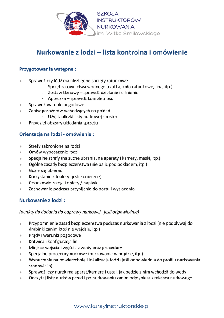 Nurkowanie z łodzi – lista kontrolna i omówienie Przygotowania wstępne : Sprawdź czy łódź ma niezbędne sprzęty ratunkowe - Sprzęt ratownictwa wodnego (rzutka, koło ratunkowe, lina, itp.) - Zestaw tlenowy – sprawdź działanie i ciśnienie - Apteczka – sprawdź kompletność Sprawdź warunki pogodowe Zapisz pasażerów wchodzących na pokład - Użyj tabliczki listy nurkowej - roster Przydziel obszary układania sprzętu Orientacja na łodzi - omówienie : Strefy zabronione na łodzi Omów wyposażenie łodzi Specjalne strefy (na suche ubrania, na aparaty i kamery, maski, itp.) Ogólne zasady bezpieczeństwa (nie palić pod pokładem, itp.) Gdzie się ubierać Korzystanie z toalety (jeśli konieczne) Członkowie załogi i opłaty / napiwki Zachowanie podczas przybijania do portu i wysiadania Nurkowanie z łodzi : (punkty do dodania do odprawy nurkowej, jeśli odpowiednie) Przypomnienie zasad bezpieczeństwa podczas nurkowania z łodzi (nie podpływaj do drabinki zanim ktoś nie wejdzie, itp.) Prądy i warunki pogodowe Kotwica i konfiguracja lin Miejsce wejścia i wyjścia z wody oraz procedury Specjalne procedury nurkowe (nurkowanie w prądzie, itp.) Wynurzenie na powierzchnię i lokalizacja łodzi (jeśli odpowiednia do profilu nurkowania i środowiska) Sprawdź, czy nurek ma aparat/kamerę i ustal, jak będzie z nim wchodził do wody Odczytaj listę nurków przed i po nurkowaniu zanim odpłyniesz z miejsca nurkowego www.kursyinstruktorskie.pl