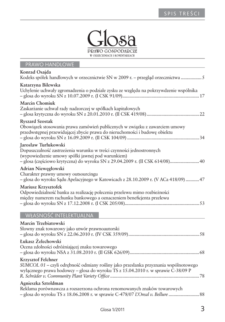 SPIS TREŚCI PRAWO HANDLOWE Konrad Osajda Kodeks spółek handlowych w orzecznictwie SN w 2009 r. – przegląd orzecznictwa ................. 5 Katarzyna Bilewska Uchylenie uchwały zgromadzenia o podziale zysku ze względu na pokrzywdzenie wspólnika – glosa do wyroku SN z 10.07.2009 r. (I CSK 91/09)...............................................................17 Marcin Chomiuk Zaskarżanie uchwał rady nadzorczej w spółkach kapitałowych – glosa krytyczna do wyroku SN z 20.01.2010 r. (II CSK 419/08) ...........................................22 Ryszard Szostak Obowiązek stosowania prawa zamówień publicznych w związku z zawarciem umowy przedwstępnej przewidującej zbycie prawa do nieruchomości i budowę obiektu – glosa do wyroku SN z 16.09.2009 r. (II CSK 104/09) ...........................................................34 Jarosław Turłukowski Dopuszczalność zastrzeżenia warunku w treści czynności jednostronnych (wypowiedzenie umowy spółki jawnej pod warunkiem) – glosa (częściowo krytyczna) do wyroku SN z 29.04.2009 r. (II CSK 614/08)........................40 Adrian Niewęgłowski Charakter prawny umowy outsourcingu – glosa do wyroku Sądu Apelacyjnego w Katowicach z 28.10.2009 r. (V ACa 418/09) ...........47 Mariusz Krzysztofek Odpowiedzialność banku za realizację polecenia przelewu mimo rozbieżności między numerem rachunku bankowego a oznaczeniem beneficjenta przelewu – glosa do wyroku SN z 17.12.2008 r. (I CSK 205/08).............................................................53 WŁASNOŚĆ INTELEKTUALNA Marcin Trzebiatowski Słowny znak towarowy jako utwór prawnoautorski – glosa do wyroku SN z 22.06.2010 r. (IV CSK 359/09) ..........................................................58 Łukasz Żelechowski Ocena zdolności odróżniającej znaku towarowego – glosa do wyroku NSA z 31.08.2010 r. (II GSK 626/09).........................................................68 Krzysztof Felchner SUMCOL 01 – czyli odrębność odmiany rośliny jako przesłanka przyznania wspólnotowego wyłącznego prawa hodowcy – glosa do wyroku TS z 15.04.2010 r. w sprawie C-38/09 P R. Schräder v. Community Plant Variety Office .........................................................................78 Agnieszka Sztoldman Reklama porównawcza a rozszerzona ochrona renomowanych znaków towarowych – glosa do wyroku TS z 18.06.2008 r. w sprawie C-478/07 L’Oreal v. Bellure .........................88 Glosa 1/2011 3 SPIS TREŚCI OCHRONA KONKURENCJI Igor B. Nestoruk Ochrona konsumentów w przypadku umów zawieranych na odległość w świetle przepisów dyrektywy 97/7/WE – glosa do orzeczenia TS z 15.04.2010 r. w sprawie C-511/08 Heinrich Heine GmbH ...........99 Dominika Wajda Zasada równego traktowania i ochrona akcjonariuszy mniejszościowych w prawie europejskim – glosa do wyroku TS z 15.10.2009 r. w sprawie C-101/08 Audiolux....................................108 PODATKI Jarosław Olesiak, Łukasz Pajor Pojęcie świadczenia nieodpłatnego a opodatkowanie pakietów medycznych podatkiem dochodowym od osób fizycznych – glosa do uchwały NSA z 24.05.2010 r. (II FPS 1/10) ...........................................................118 Kazimierz Włodkowski Akcyza od darowizny samochodu osobowego – glosa do wyroku NSA z 11.12.2008 r. (I FSK 1447/07).......................................................123 VARIA Agnieszka Maziarz Zasady nauki religii w szkołach w orzecznictwie Trybunału Konstytucyjnego – glosa do wyroku TK z 20.04.1993 r. (U 12/92) ...................................................................128 Table of Contents & Abstracts ............................................................................................... 133 Czasopismo wpisane na listę czasopism punktowanych Ministerstwa Nauki i Szkolnictwa Wyższego z liczbą 6 punktów za każdą publikację. WARUNKI PRZYJMOWANIA TEKSTÓW DO DRUKU Materiały do publikacji – o objętości do 15 stron znormalizowanego maszynopisu (ok. 25 tysięcy znaków) – przyjmujemy z płytą CD lub pocztą elektroniczną (z imieniem, nazwiskiem, krótkim CV oraz telefonami kontaktowymi). Glosy, komentarze i przeglądy orzecznictwa o większej objętości – zaakceptowane do druku – Redakcja będzie odsyłała Autorom w celu ich skrócenia. Do materiałów przysyłanych do redakcji przez absolwentów wydziałów prawa, doktorantów, asystentów i aplikantów powinna być dołączona rekomendacja (recenzja) opiekuna naukowego. Autor, przekazując redakcji tekst, przenosi na wydawcę wyłączne prawo do jego publikacji (prawa autorskie i wydawnicze). Redakcja zastrzega sobie możliwość dokonywania zmian i skrótów w tekstach przeznaczonych do publikacji. Materiały niezamówione nie będą zwracane. Przedruk materiałów publikowanych w „Glosie” wymaga zgody wydawcy. Niedozwolone jest cytowanie wyimków publikacji „Glosy” bez powołania się na źródło. Redakcja 4 Glosa 1/2011 TA B L E O F CO N T E N T S & A B S T R A C T S COMMERCIAL LAW Konrad Osajda Commercial Companies Code in Case Law of Supreme Court in 2009 – case law review .................5 This article closes series of case law reviews published in „Glosa” recently. The papers were on the analysis of cases on partnerships and corporations reviewed by the Polish Supreme Court in 2009. In 2009 Supreme Court released many judgments important for commercial law practice. Commercial companies law issues dealt with in resolutions of the Supreme Court in 2009, general meeting and its resolutions in recent case law of the Supreme Court, and Supreme Court on Partnerships were previously analyzed separately in former issues of „Glosa”. In this case law further judgments significant for commercial practice and theory released in 2009 are discussed. Katarzyna Bilewska Revocation of the resolution of the shareholders’ meeting on the distribution of profit as a result of its harm to shareholder – commentary on ju