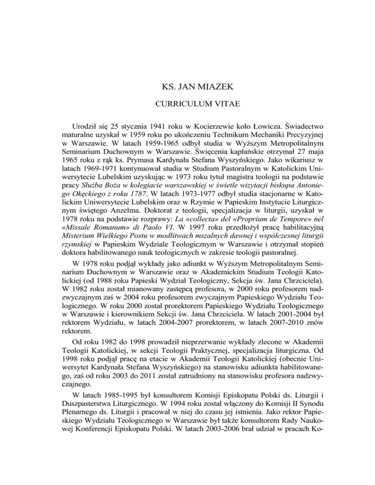KS. JAN MIAZEK CURRICULUM VITAE Urodził się 25 stycznia 1941 roku w Kocierzewie koło Łowicza. Świadectwo maturalne uzyskał w 1959 roku po ukończeniu Technikum Mechaniki Precyzyjnej w Warszawie. W latach 1959-1965 odbył studia w WyŜszym Metropolitalnym Seminarium Duchownym w Warszawie. Święcenia kapłańskie otrzymał 27 maja 1965 roku z rąk ks. Prymasa Kardynała Stefana Wyszyńskiego. Jako wikariusz w latach 1969-1971 kontynuował studia w Studium Pastoralnym w Katolickim Uniwersytecie Lubelskim uzyskując w 1973 roku tytuł magistra teologii na podstawie pracy SłuŜba BoŜa w kolegiacie warszawskiej w świetle wizytacji biskupa Antoniego Okęckiego z roku 1787. W latach 1973-1977 odbył studia stacjonarne w Katolickim Uniwersytecie Lubelskim oraz w Rzymie w Papieskim Instytucie Liturgicznym świętego Anzelma. Doktorat z teologii, specjalizacja w liturgii, uzyskał w 1978 roku na podstawie rozprawy: La «collecta» del «Proprium de Tempore» nel «Missale Romanum» di Paolo VI. W 1997 roku przedłoŜył pracę habilitacyjną Misterium Wielkiego Postu w modlitwach mszalnych dawnej i współczesnej liturgii rzymskiej w Papieskim Wydziale Teologicznym w Warszawie i otrzymał stopień doktora habilitowanego nauk teologicznych w zakresie teologii pastoralnej. W 1978 roku podjął wykłady jako adiunkt w WyŜszym Metropolitalnym Seminarium Duchownym w Warszawie oraz w Akademickim Studium Teologii Katolickiej (od 1988 roku Papieski Wydział Teologiczny, Sekcja św. Jana Chrzciciela). W 1982 roku został mianowany zastępcą profesora, w 2000 roku profesorem nadzwyczajnym zaś w 2004 roku profesorem zwyczajnym Papieskiego Wydziału Teologicznego. W roku 2000 został prorektorem Papieskiego Wydziału Teologicznego w Warszawie i kierownikiem Sekcji św. Jana Chrzciciela. W latach 2001-2004 był rektorem Wydziału, w latach 2004-2007 prorektorem, w latach 2007-2010 znów rektorem. Od roku 1982 do 1998 prowadził nieprzerwanie wykłady zlecone w Akademii Teologii Katolickiej, w sekcji Teologii Praktycznej, specjalizacja liturgiczna. Od 1998 roku podjął pracę na etacie w Akademii Teologii Katolickiej (obecnie Uniwersytet Kardynała Stefana Wyszyńskiego) na stanowisku adiunkta habilitowanego, zaś od roku 2003 do 2011 został zatrudniony na stanowisku profesora nadzwyczajnego. W latach 1985-1995 był konsultorem Komisji Episkopatu Polski ds. Liturgii i Duszpasterstwa Liturgicznego. W 1994 roku został włączony do Komisji II Synodu Plenarnego ds. Liturgii i pracował w niej do czasu jej istnienia. Jako rektor Papieskiego Wydziału Teologicznego w Warszawie był takŜe konsultorem Rady Naukowej Konferencji Episkopatu Polski. W latach 2003-2006 brał udział w pracach Ko- 10 CURRICULUM VITAE mitetu Nauk Teologicznych Polskiej Akademii Nauk. Od 2000 do 2010 roku był członkiem Kolegium Redakcyjnego rocznika Warszawskie Studia Teologiczne. Przez wiele lat pełnił funkcje niezwiązane wprost z wykształceniem liturgicznym. W latach 1982-1994 był dyrektorem Studium Teologii dla Świeckich. W latach 1985-1990 pełnił funkcję pierwszego zastępcy redaktora naczelnego "Przeglądu Katolickiego", zaś w latach 1990-1995 był jego redaktorem naczelnym.
