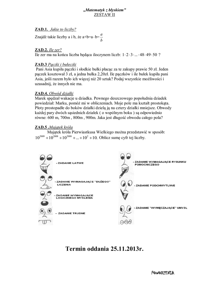 „Matematyk z błyskiem” ZESTAW II ZAD.1. Jakie to liczby? Znajdź takie liczby a i b, że a+b=a b= a b ZAD.2. Ile zer? Ile zer ma na końcu liczba będąca iloczynem liczb: 1 2 3 ... 48 49 50 ? ZAD.3 Pączki i bułeczki Pani Asia kupiła pączki i słodkie bułki płacąc za te zakupy prawie 50 zł. Jeden pączek kosztował 3 zł, a jedna bułka 2,20zł. Ile pączków i ile bułek kupiła pani Asia, jeśli razem było ich więcej niż 20 sztuk? Podaj wszystkie możliwości i uzasadnij, że innych nie ma. ZAD.4. Obwód działki Marek spędzał wakacje u dziadka. Pewnego deszczowego popołudnia dziadek powiedział: Marku, pomóż mi w obliczeniach. Moje pole ma kształt prostokąta. Płoty prostopadłe do boków działki dzielą ją na cztery działki mniejsze. Obwody każdej pary dwóch sąsiednich działek ( o wspólnym boku ) są odpowiednio równe: 600 m, 700m , 800m , 900m. Jaka jest długość obwodu całego pola? ZAD.5 .Majątek króla Majątek króla Pierwiastkusa Wielkiego można przedstawić w sposób: 2009 10 102008 102008 ... 102 10. Oblicz sumę cyfr tej liczby. Termin oddania 25.11.2013r. POWODZENIA